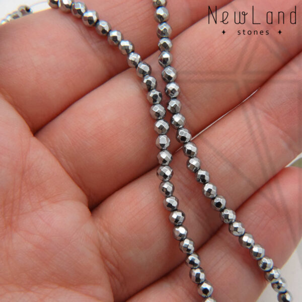 Гематит круглый с огранкой 4 мм серебристого цвета.