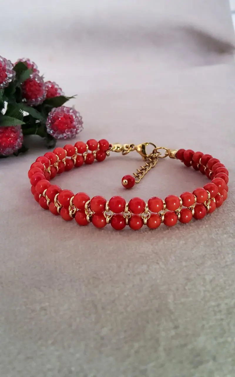 Двухрядный браслет из круглого красного коралла – это изысканное и необычное украшение, которое привлекает внимание своей яркой цветовой гаммой и природной текстурой.