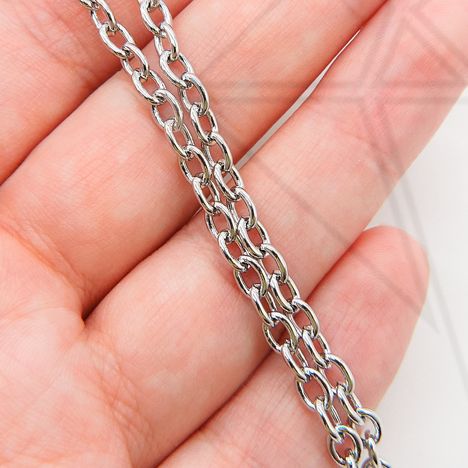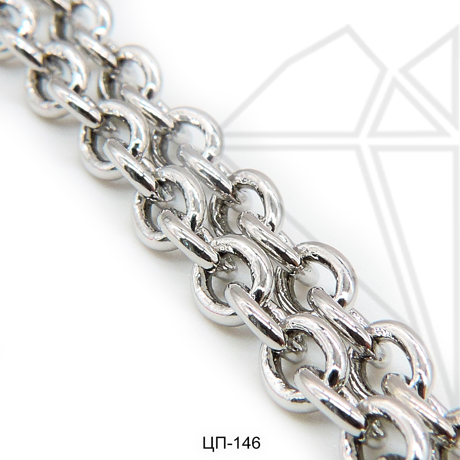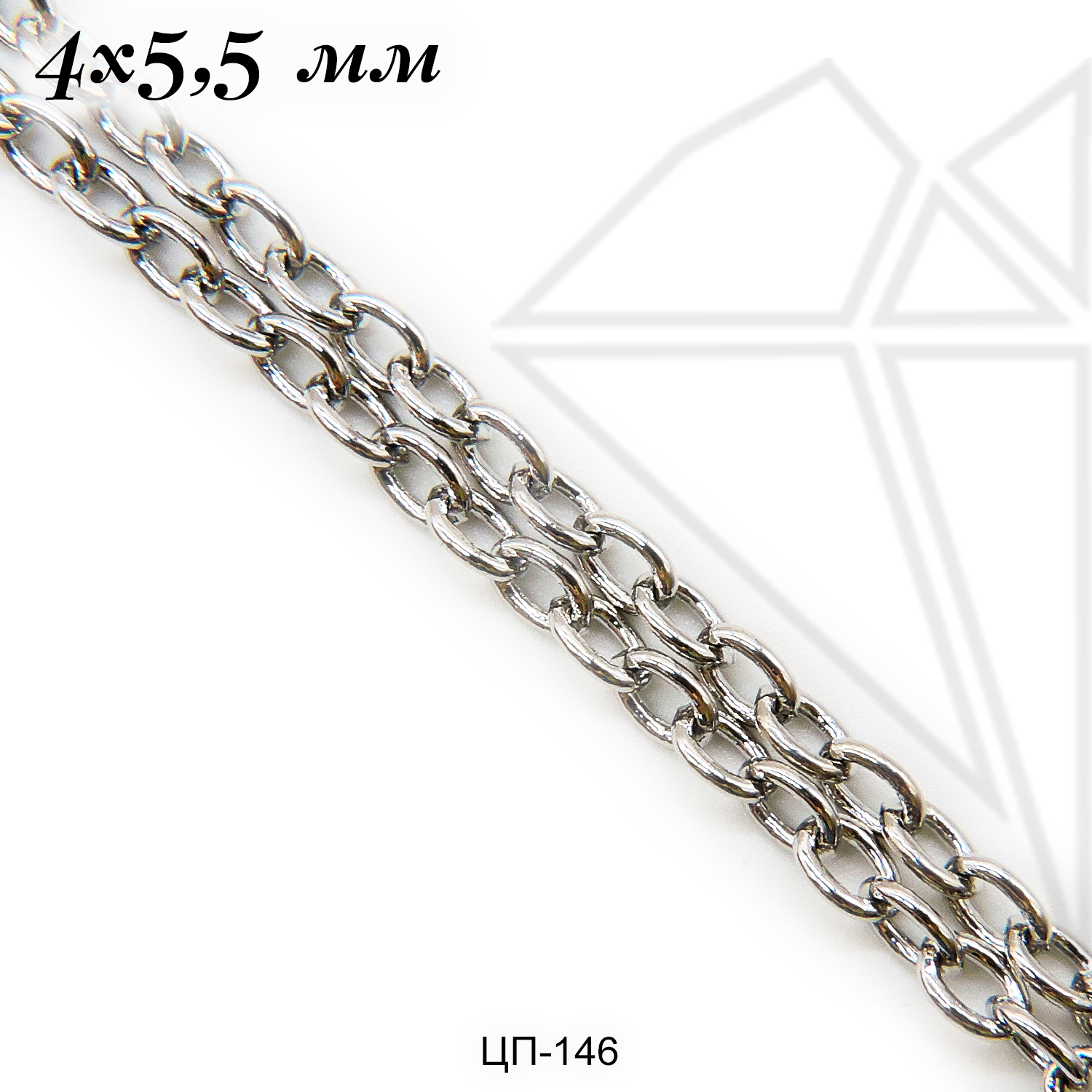 Цепь из ювелирного сплава, с овальными звеньями якорного плетения, с родированным покрытием.