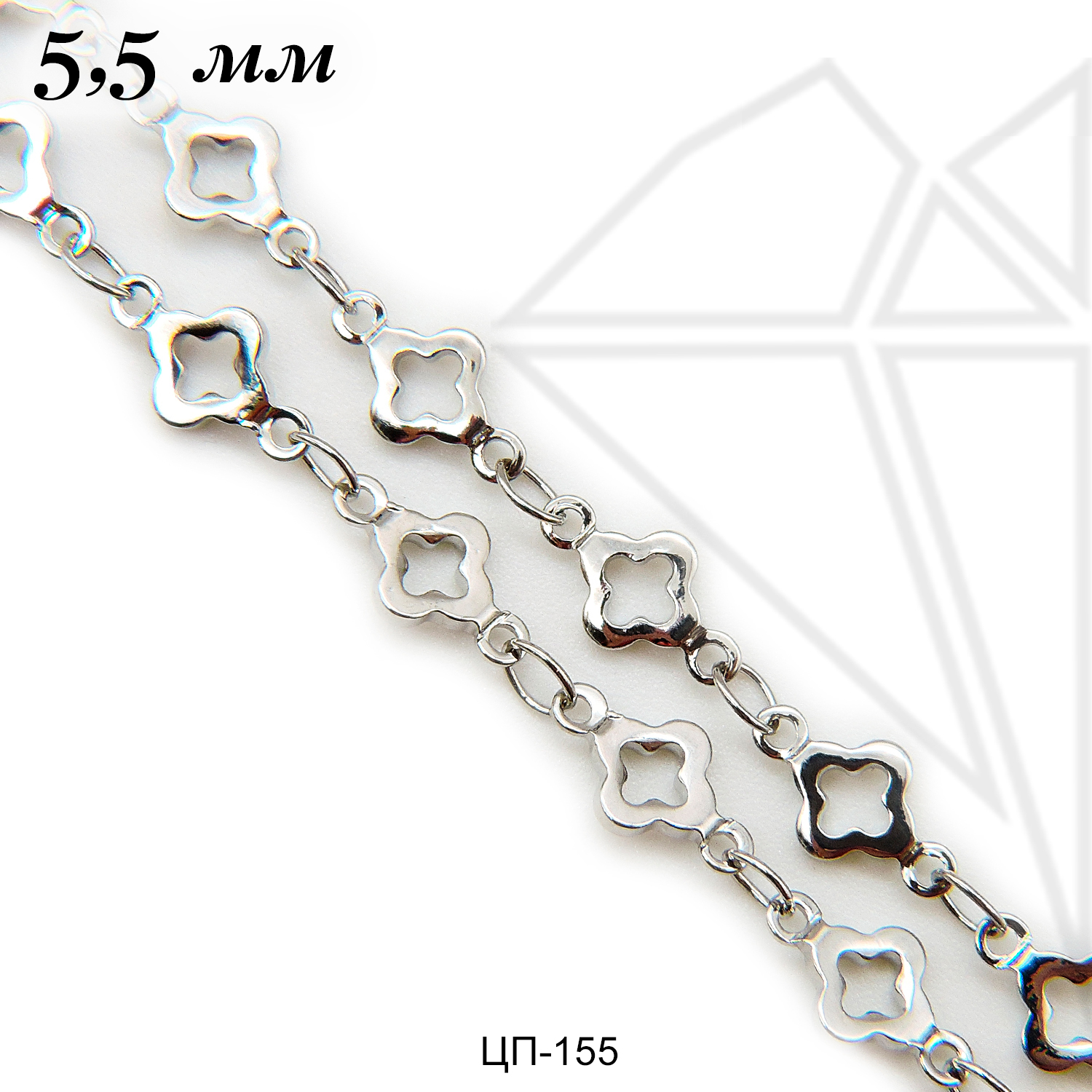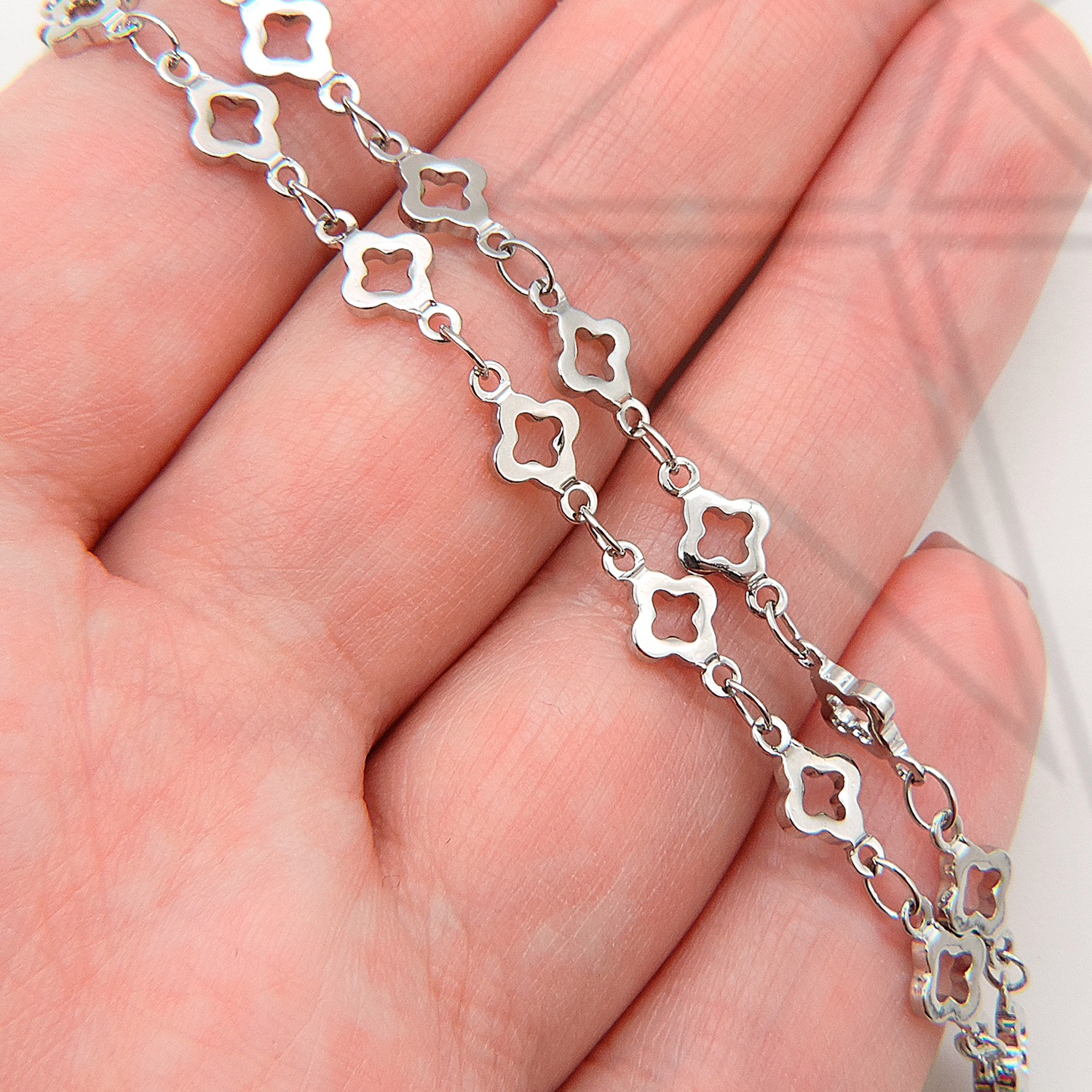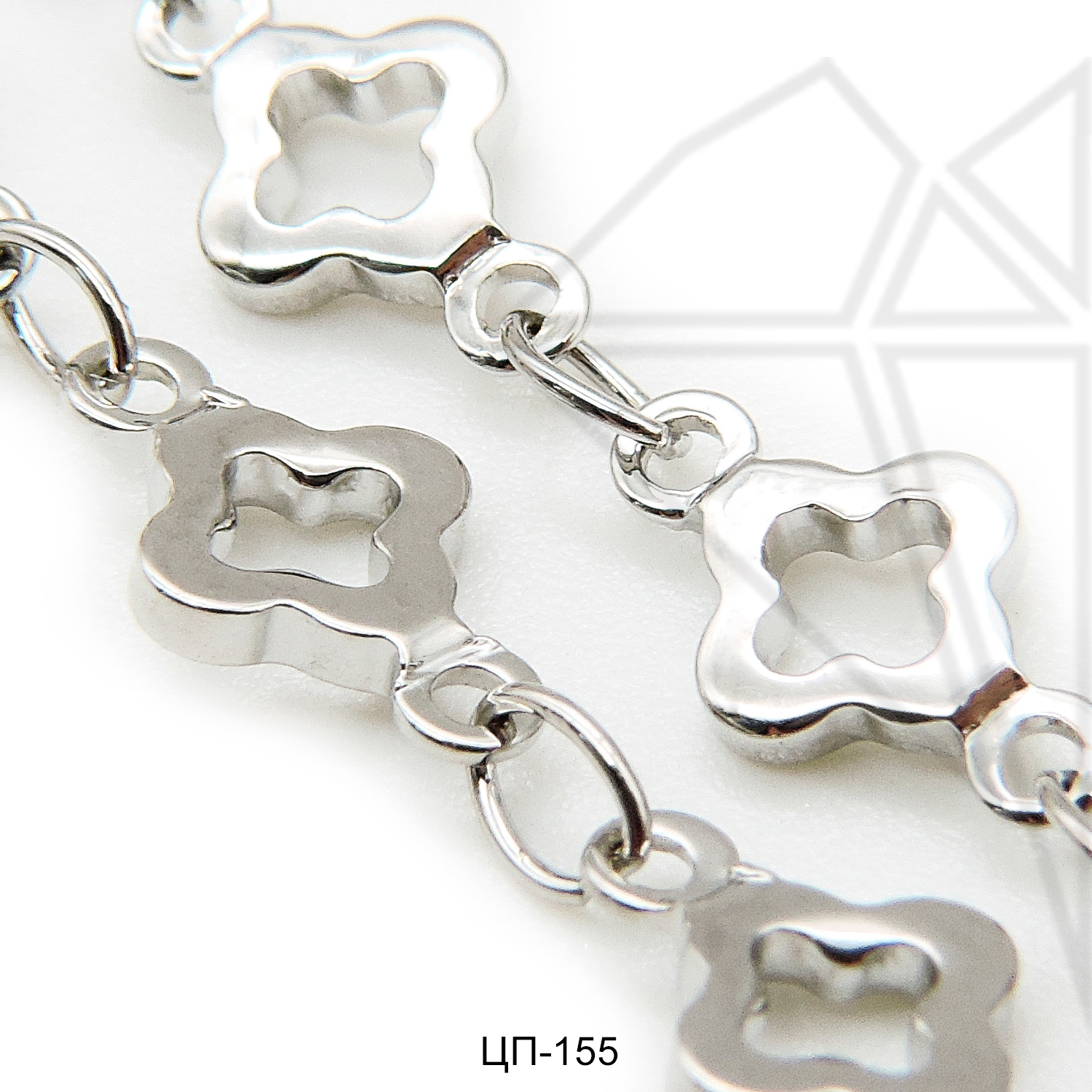 Цепь из ювелирного сплава с клевером с родированным покрытием.