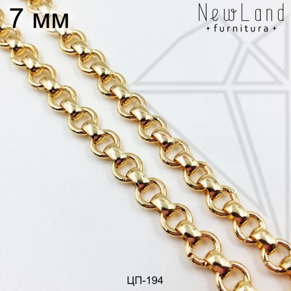 Цепь с круглыми звеньями якорного плетения из ювелирного сплава с позолоченным покрытием.