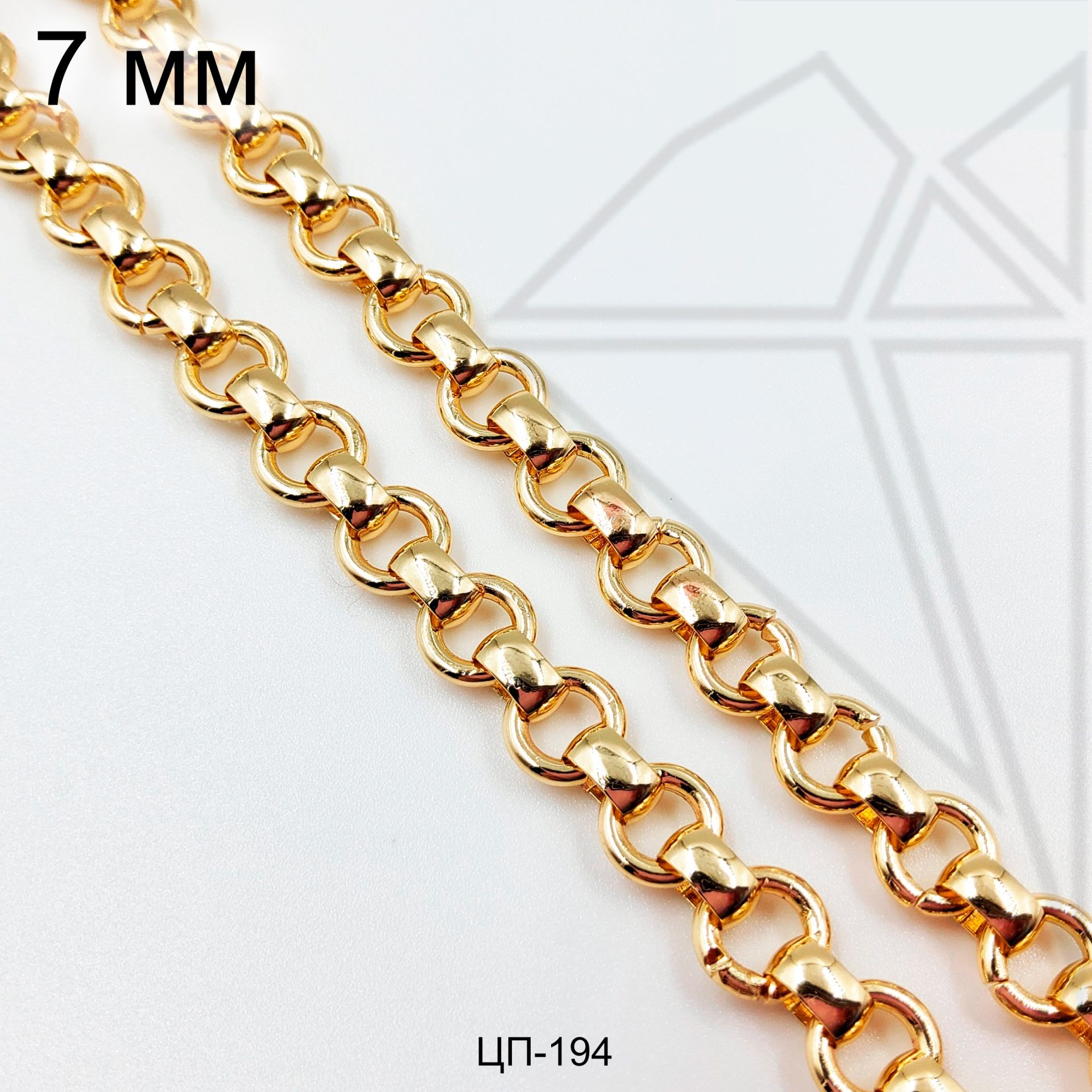 Цепь с круглыми звеньями якорного плетения из ювелирного сплава с позолоченным покрытием.