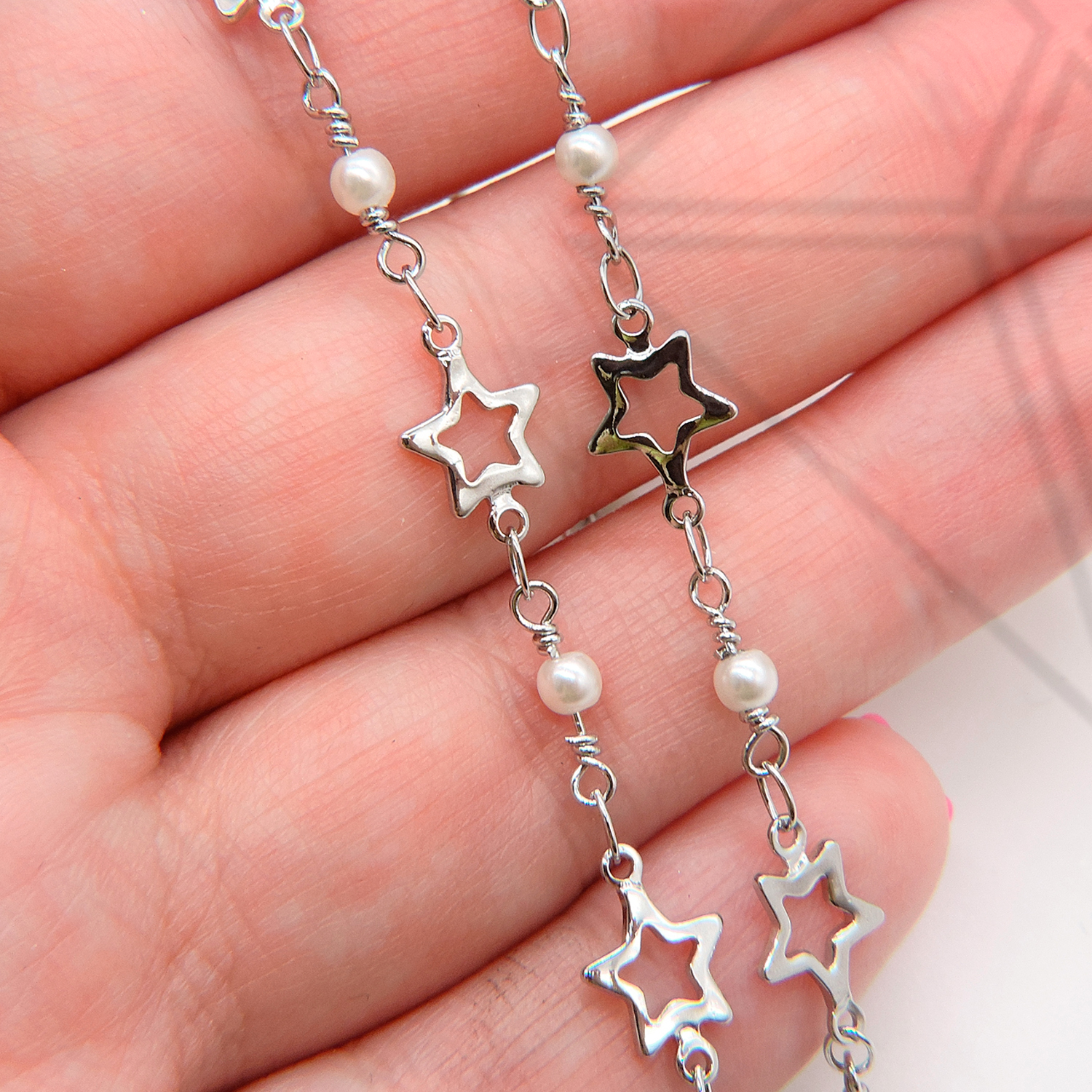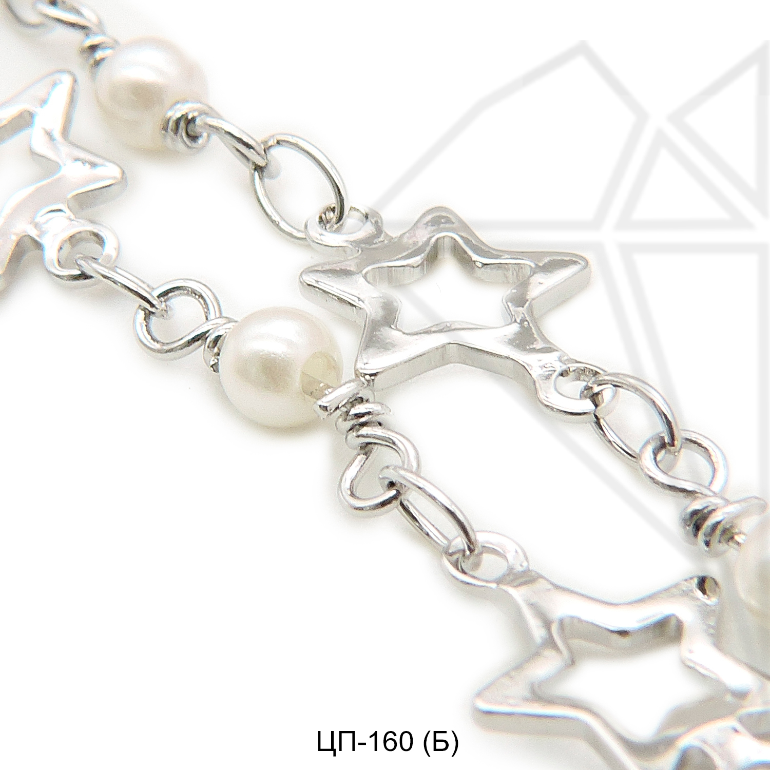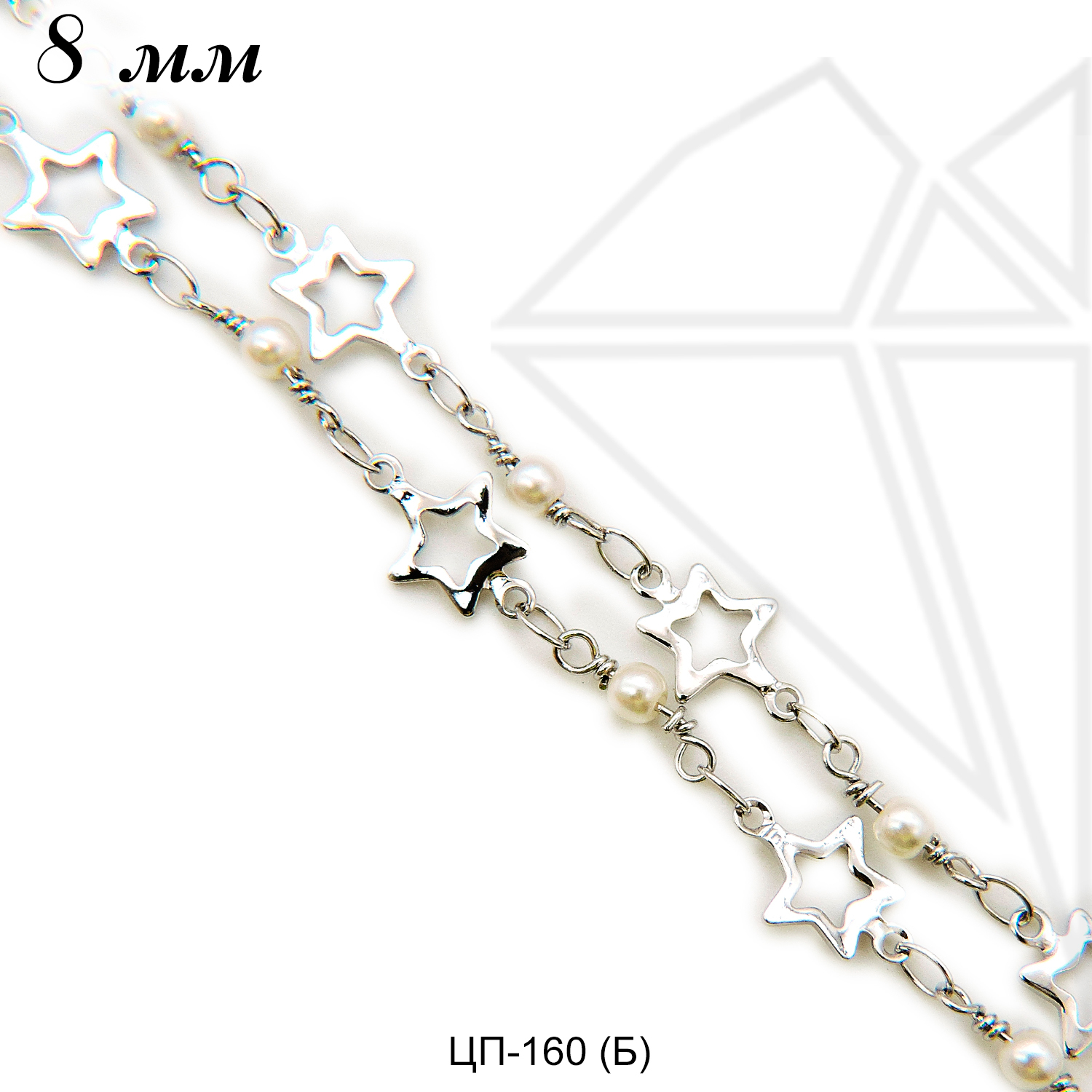 Цепь из ювелирного сплава со звездочками и жемчугом майоркой с родированным покрытием.