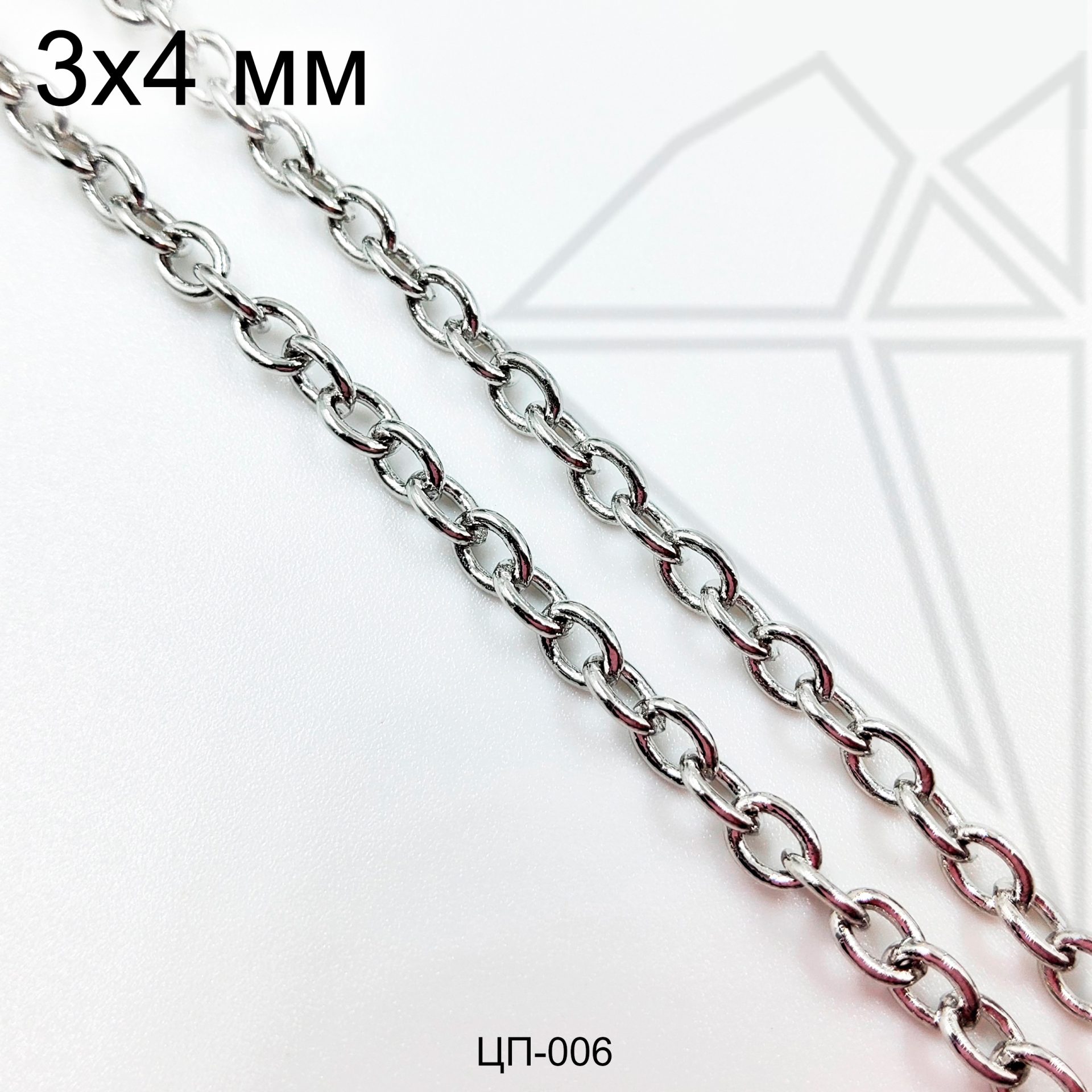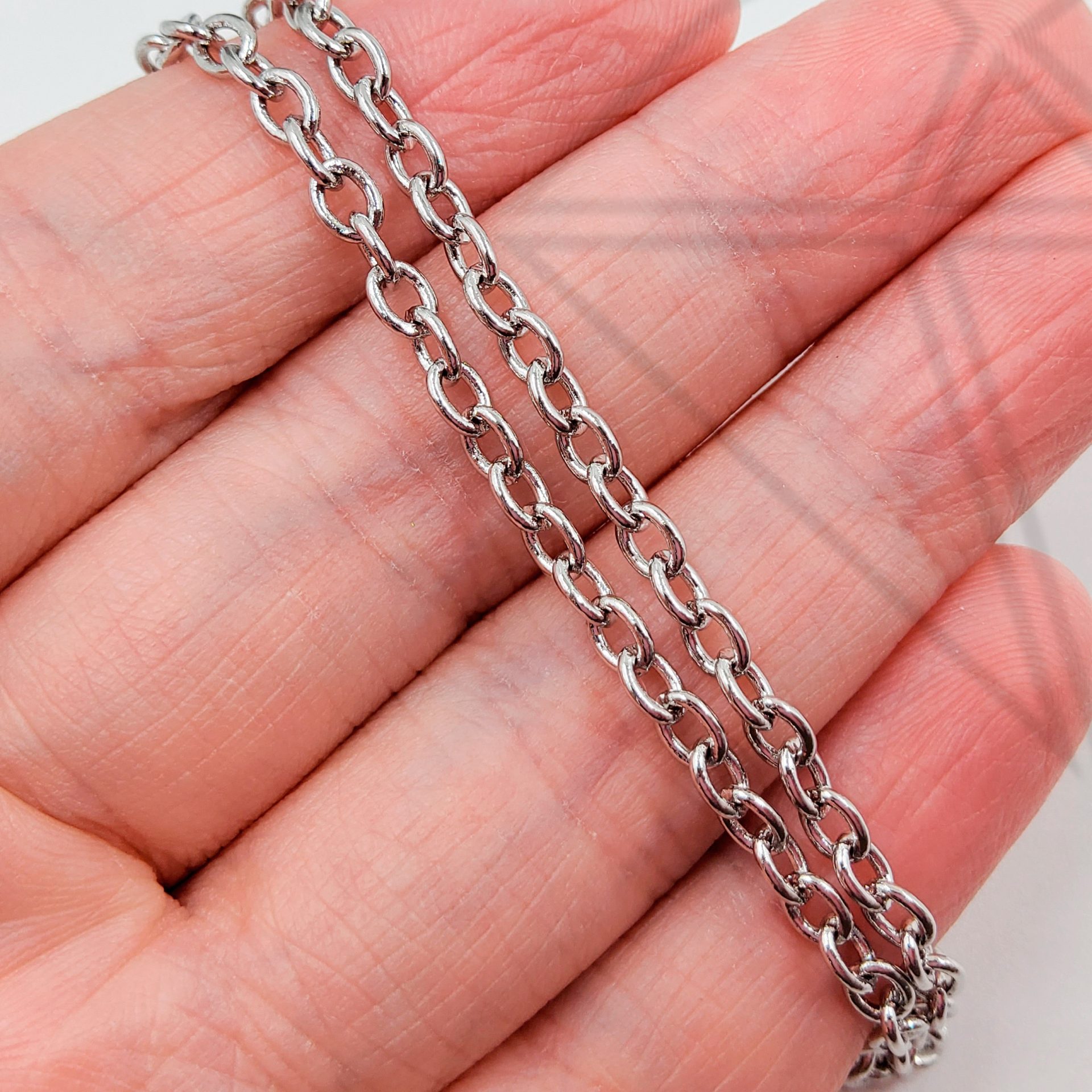 Цепь якорная 4х3 мм из ювелирного сплава с родированным покрытием.