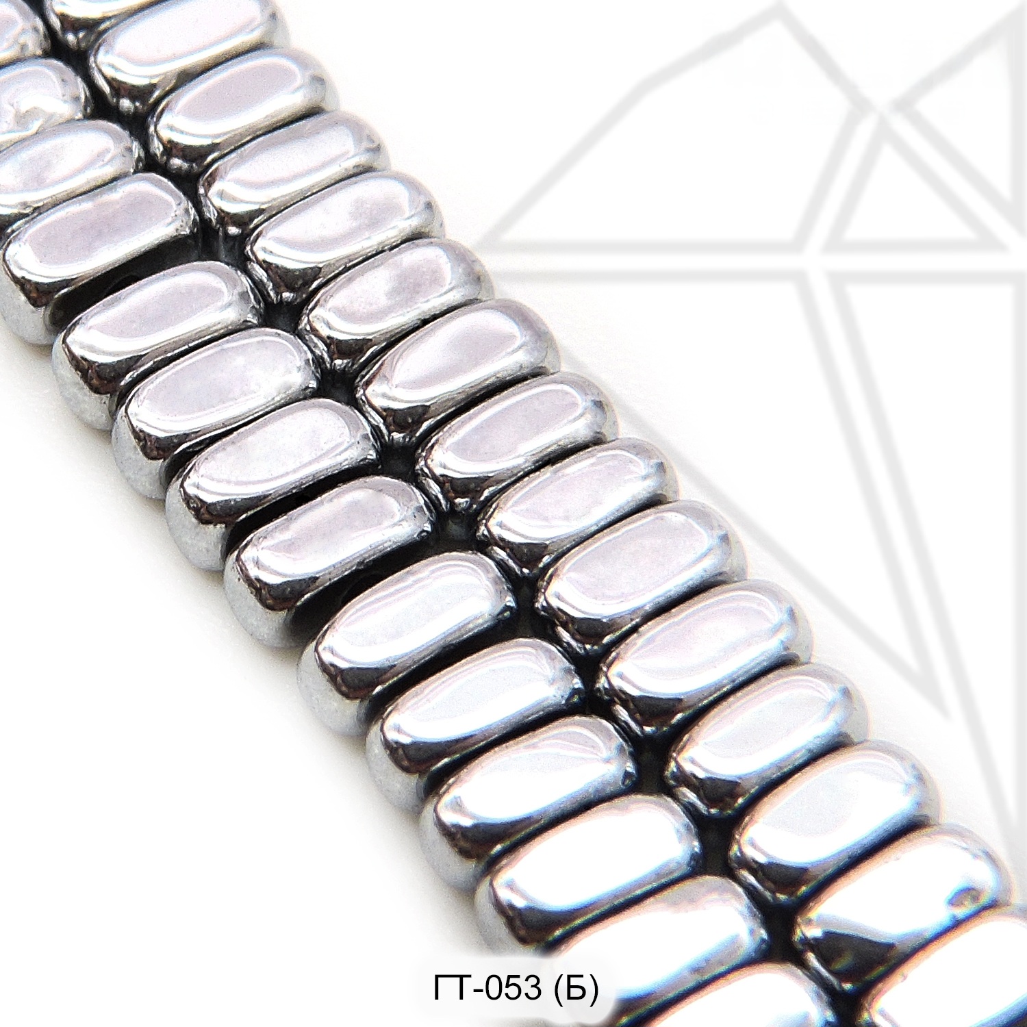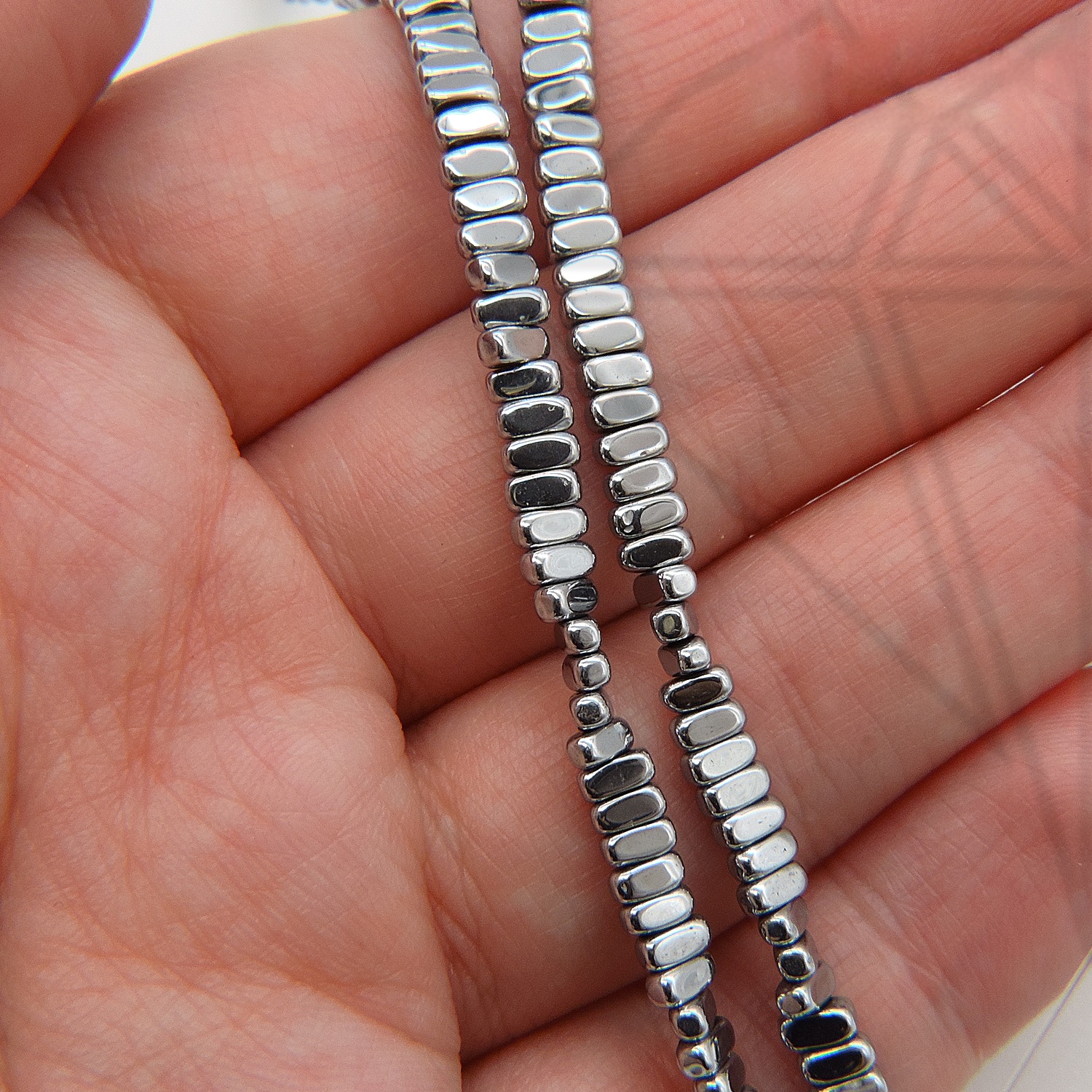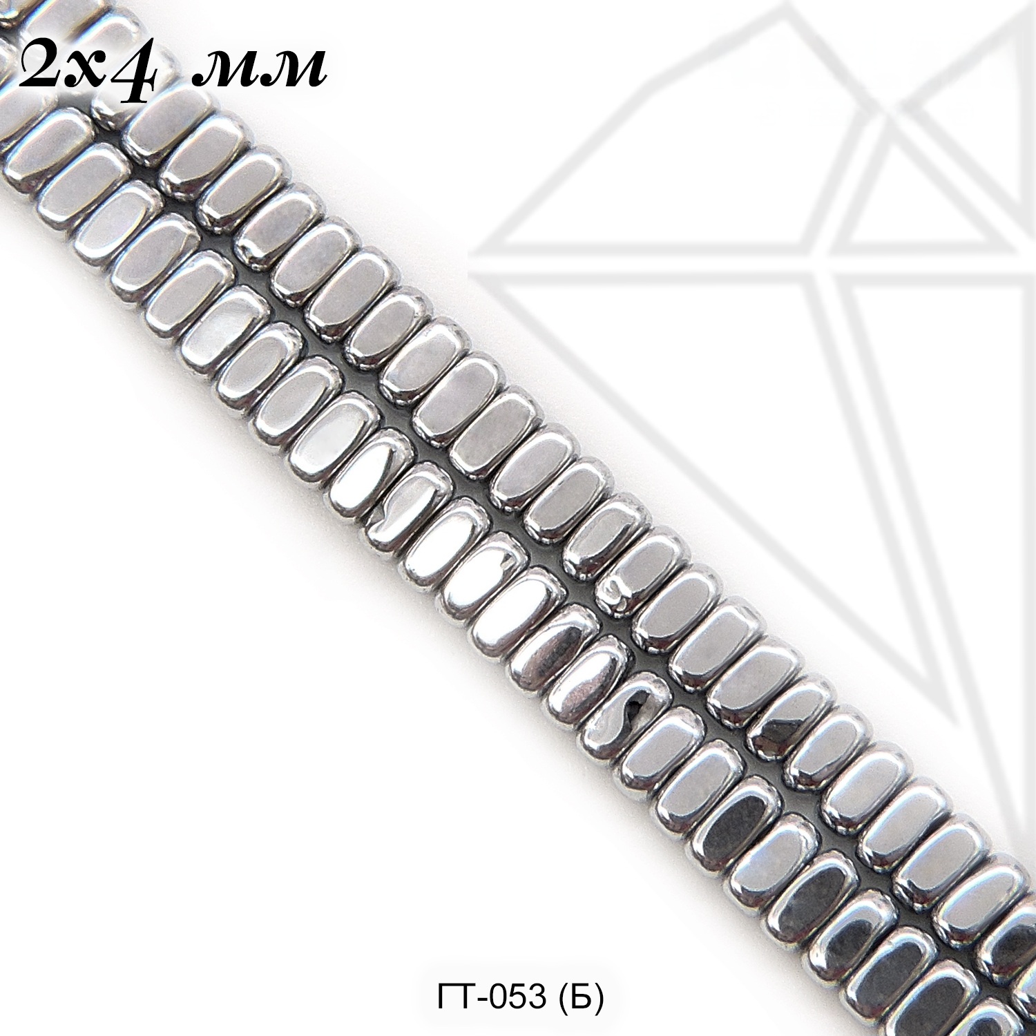 Гематит прямоугольной формы 2х4 мм со сглаженными краями серебристого цвета. Отверстие просверлено поперек бусин.