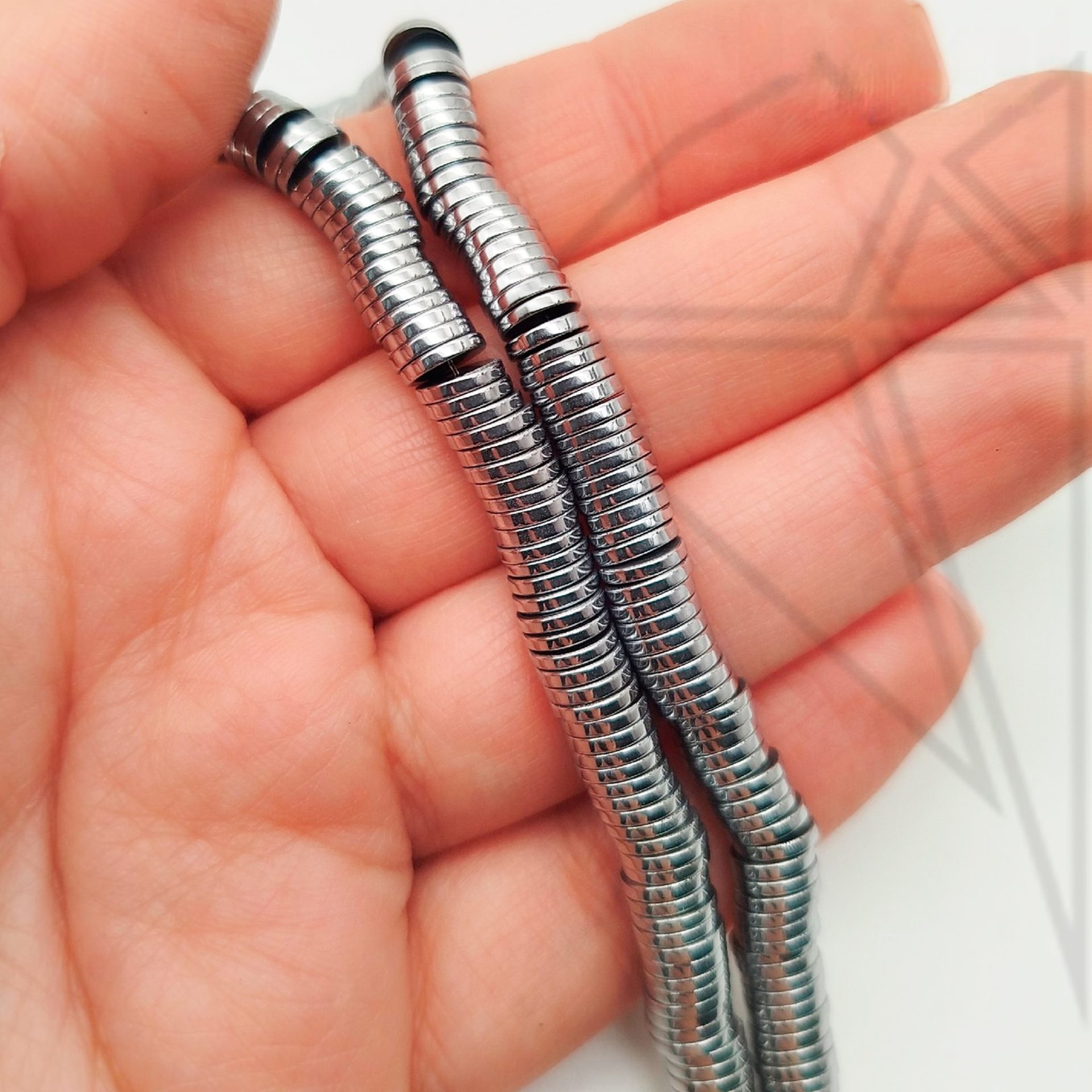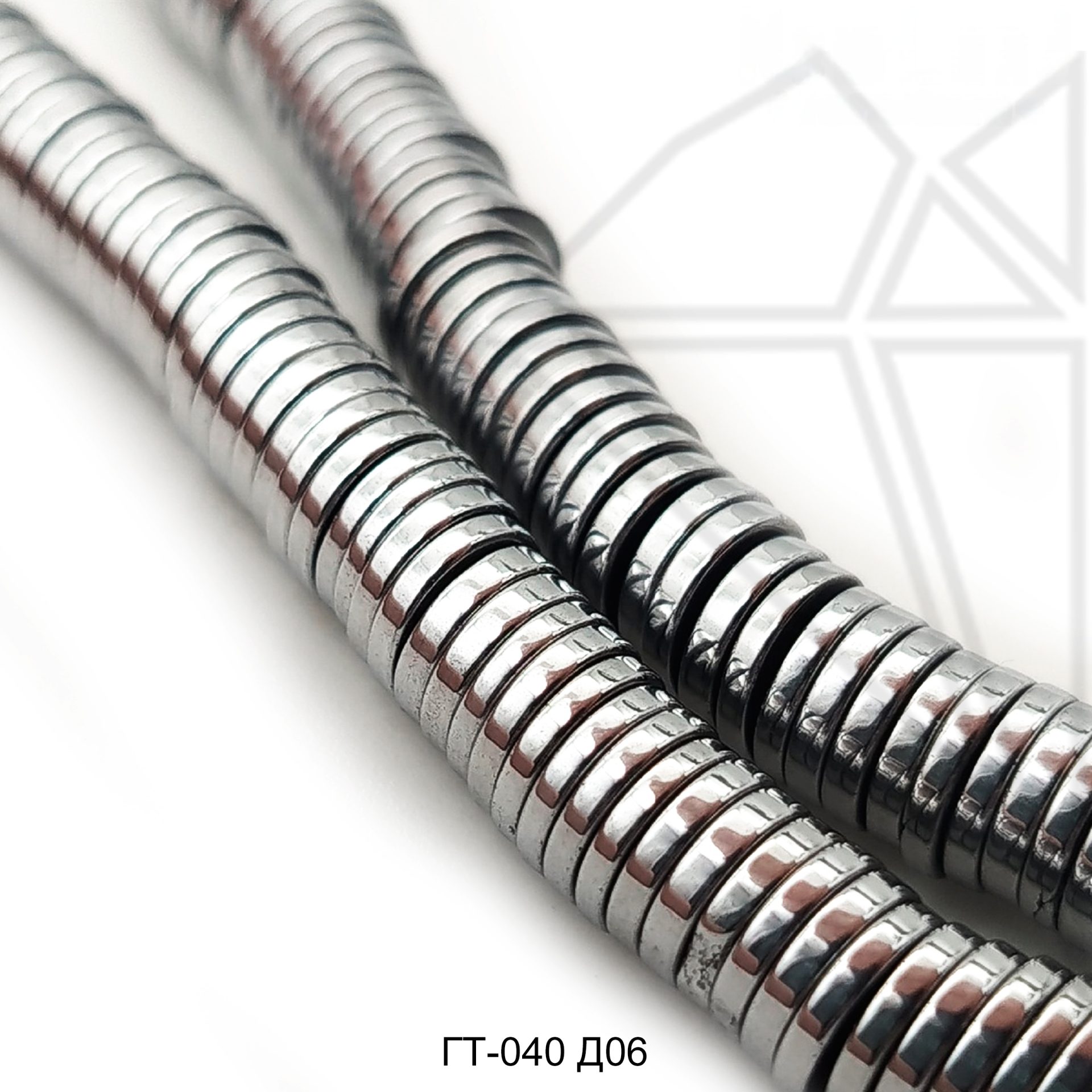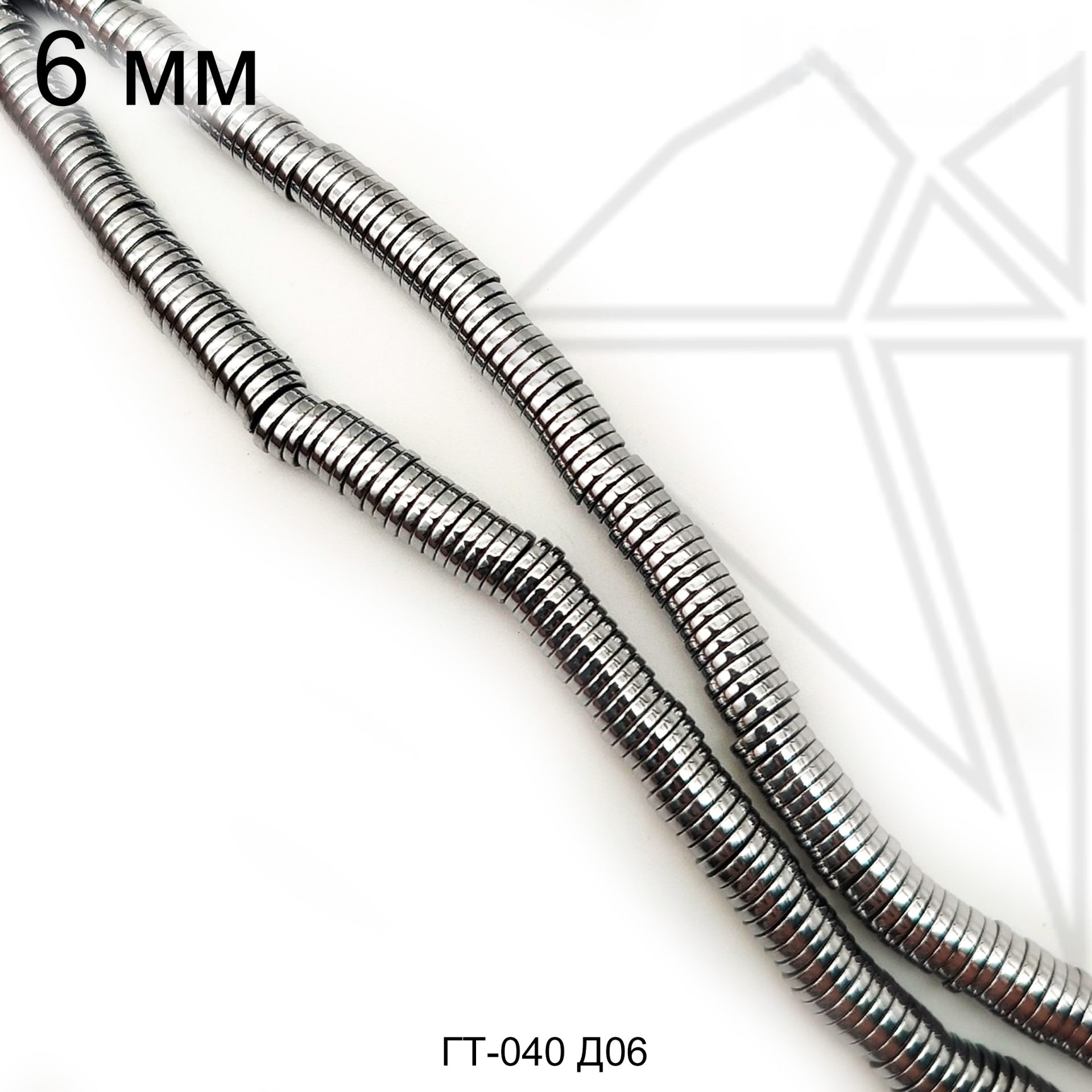 Гематит гладкий в форме диска диаметром 6 мм серебристого цвета.