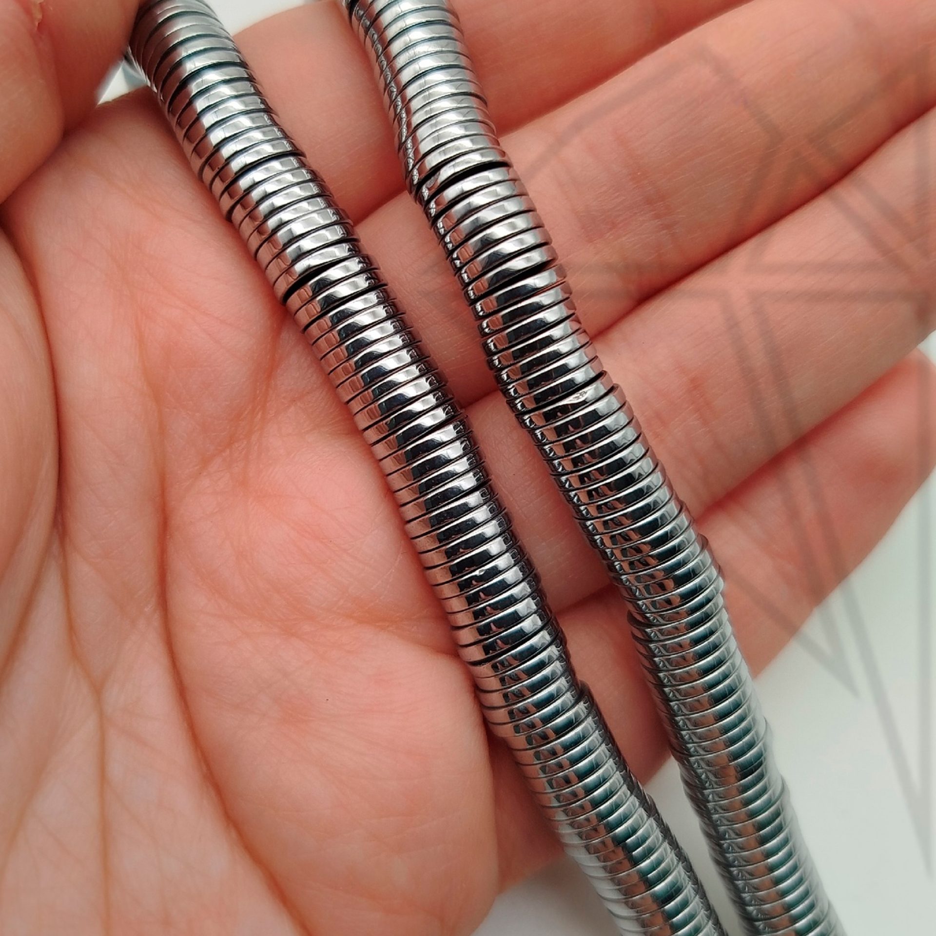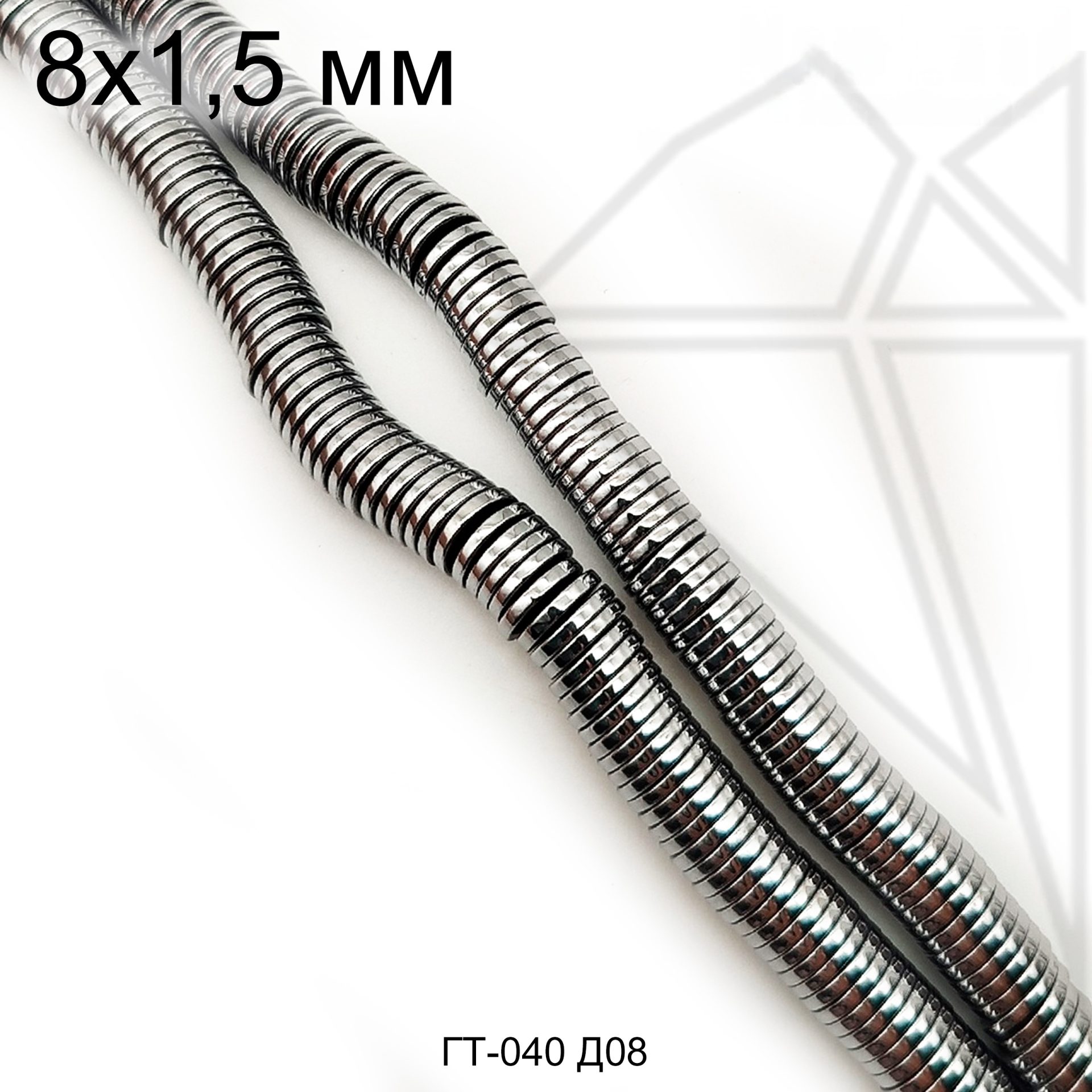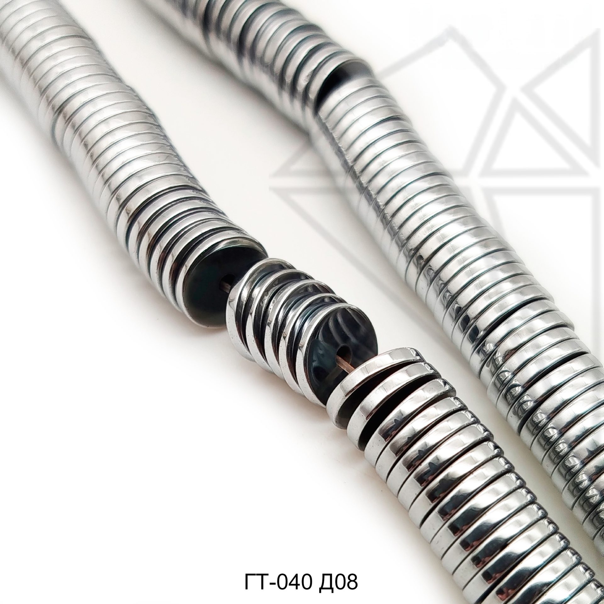 Гематит гладкий в форме диска диаметром 8 мм серебристого цвета.