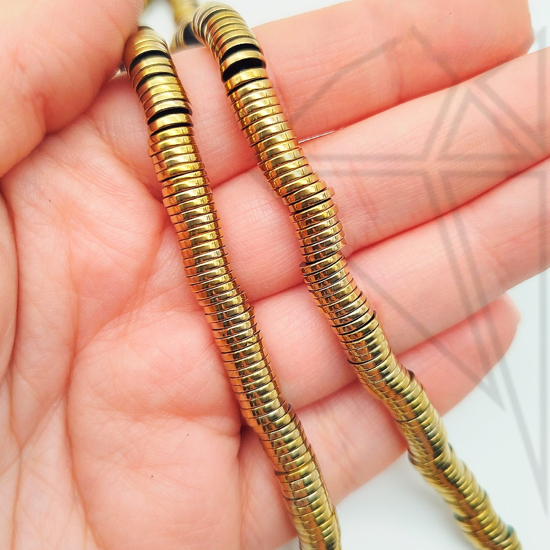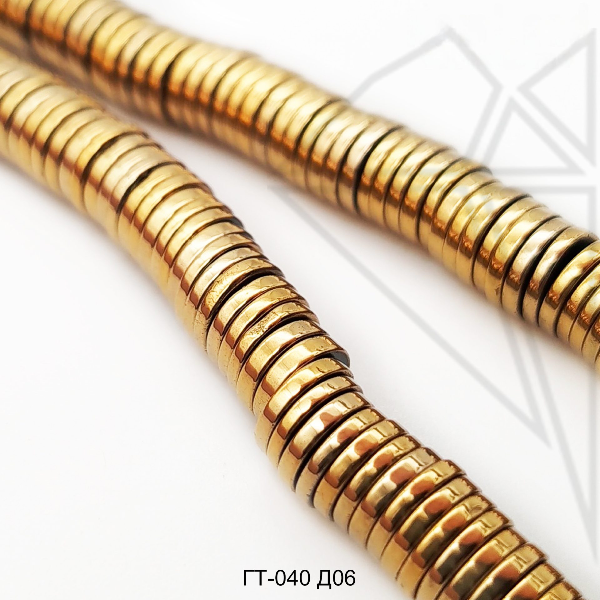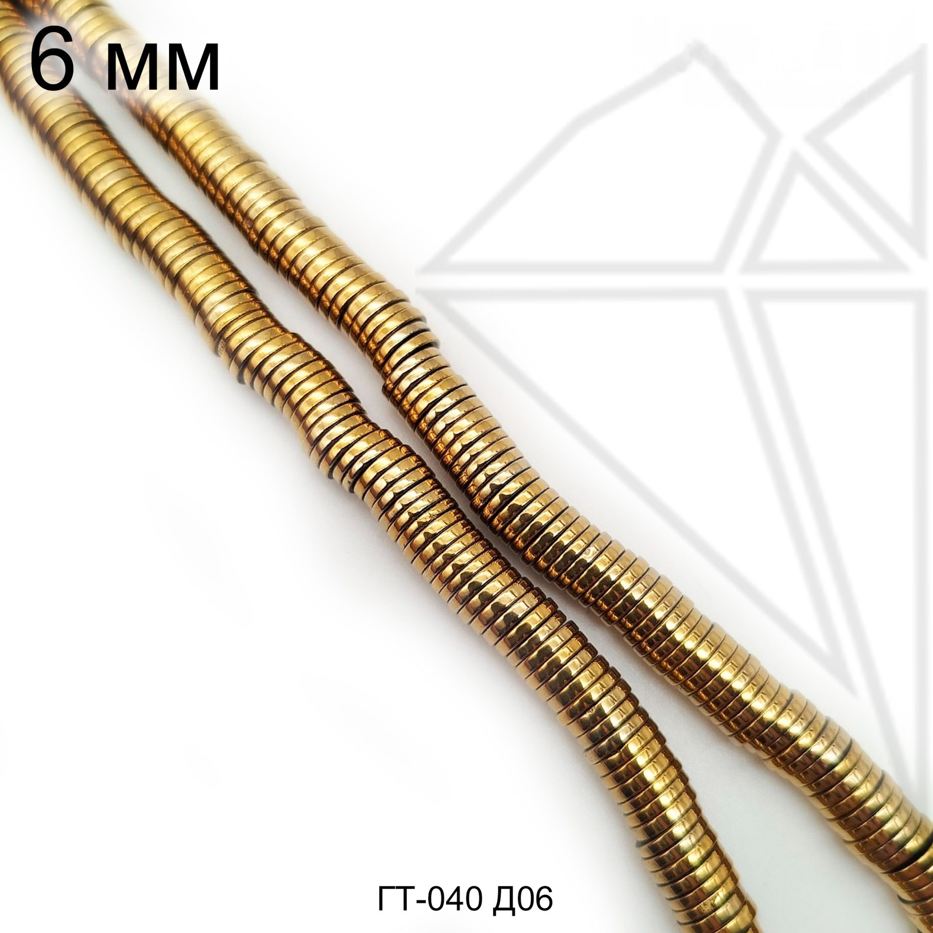 Гематит гладкий в форме диска диаметром 6 мм золотого цвета.