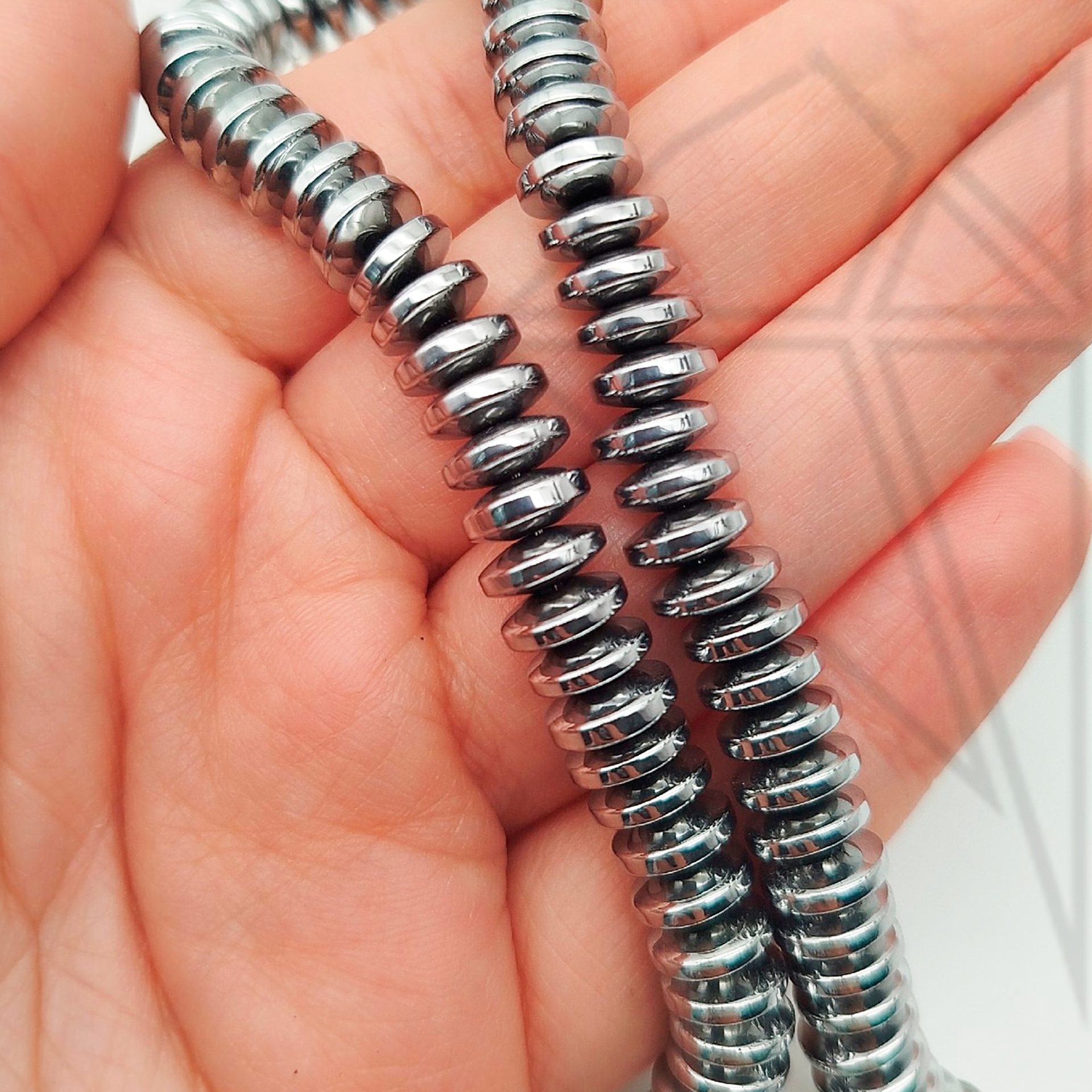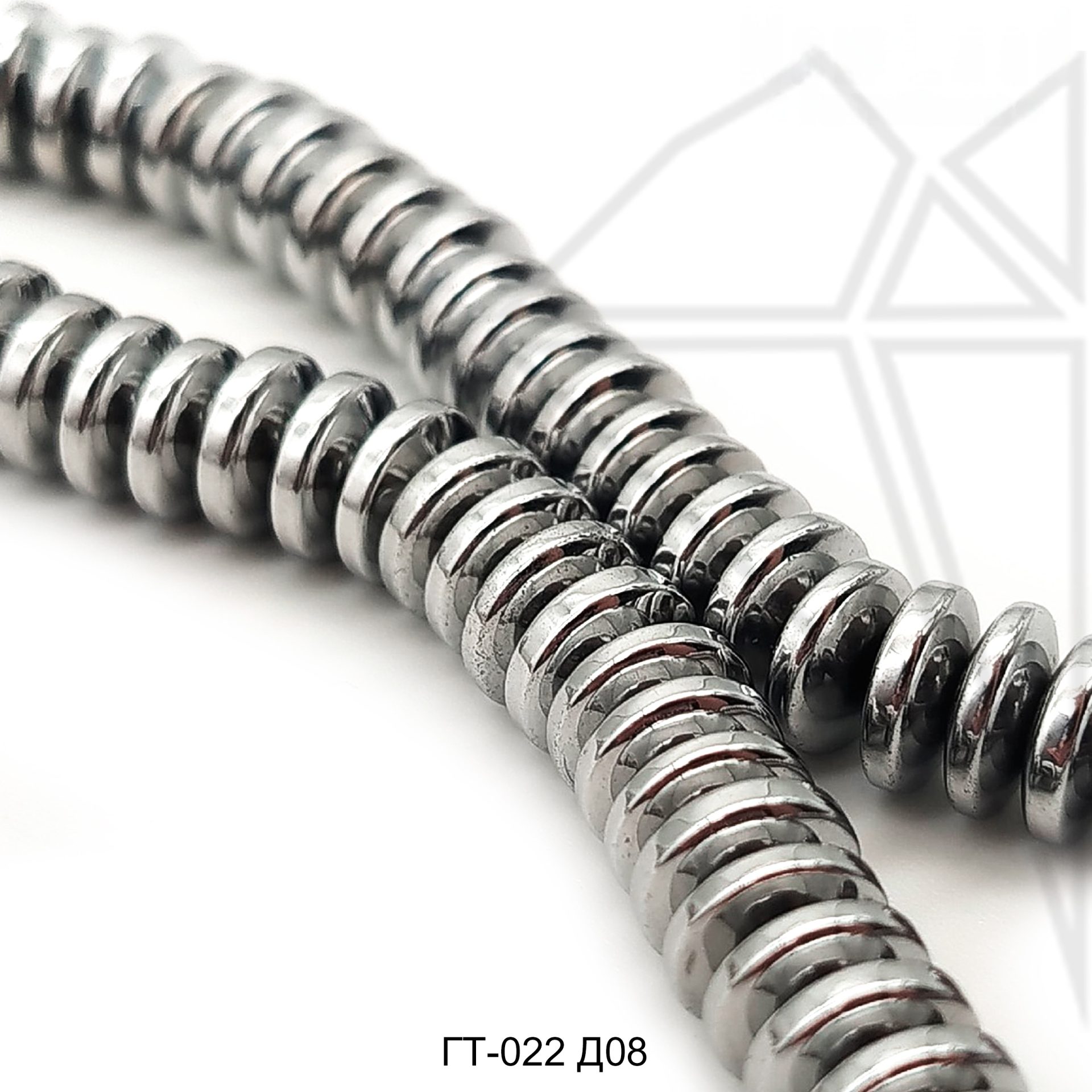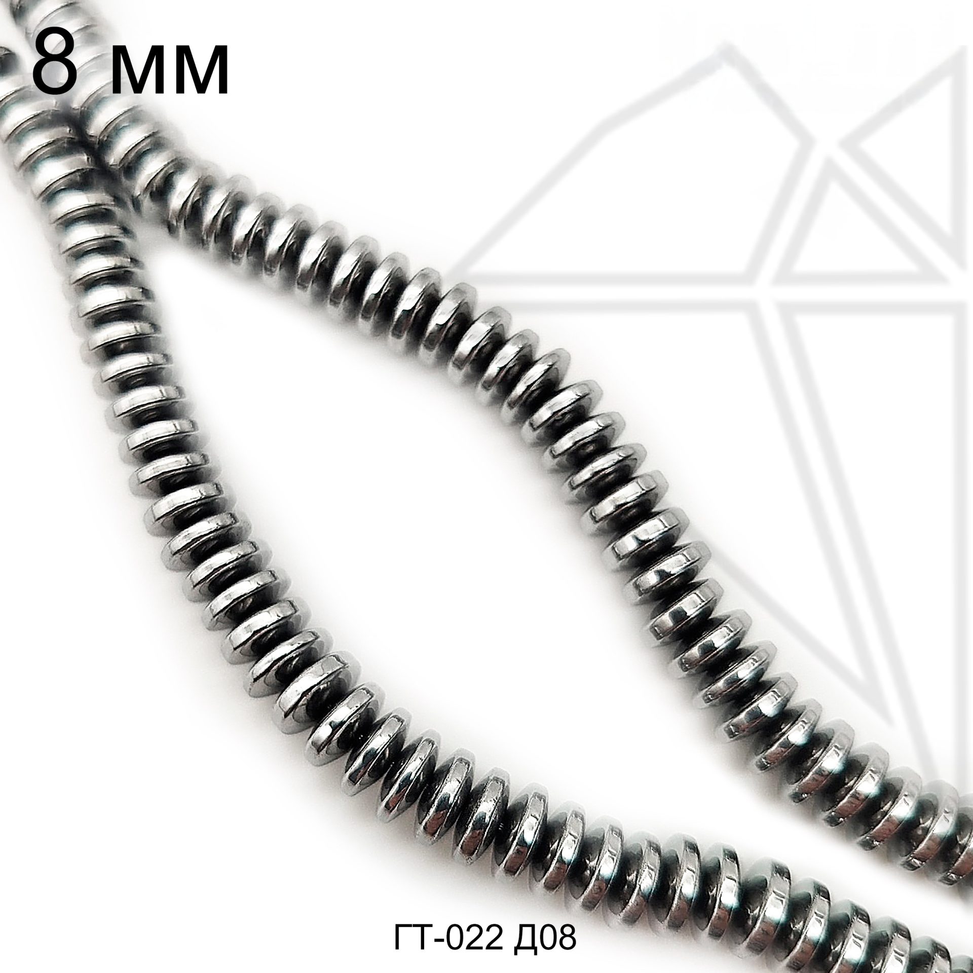 Гематит гладкий в форме таблетки диаметром 8 мм серебристого цвета.