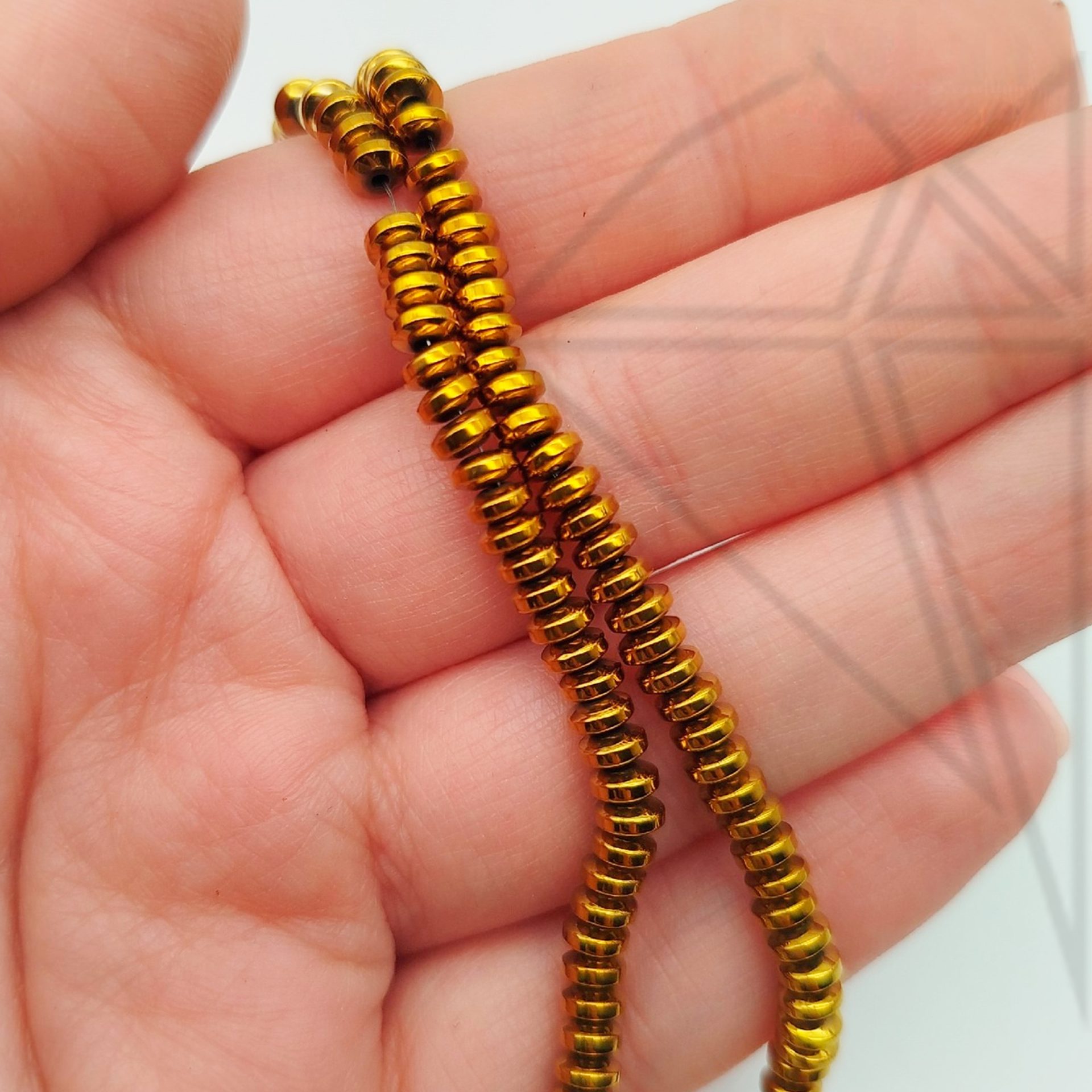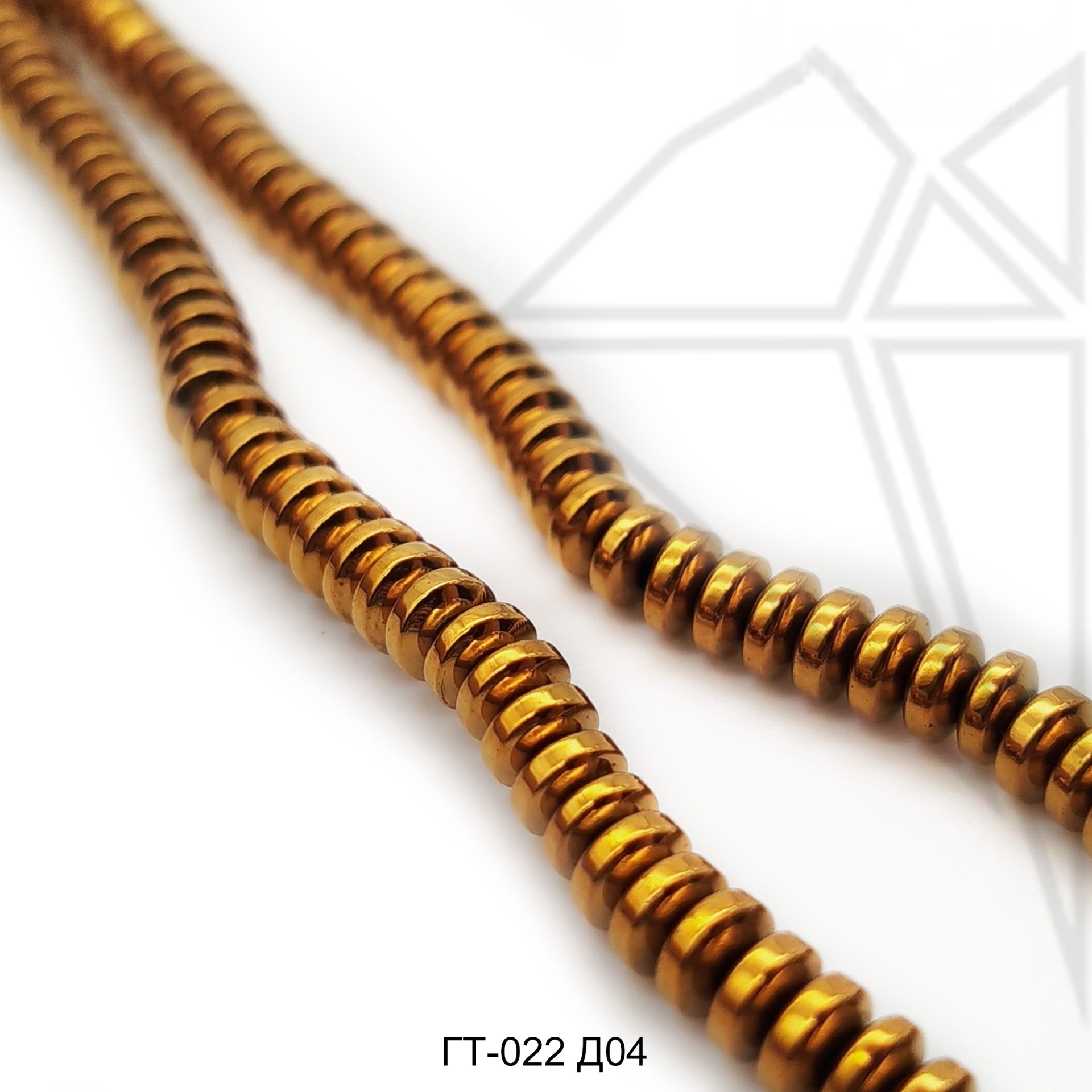 Гематит гладкий в форме таблетки диаметром 4 мм золотого цвета.