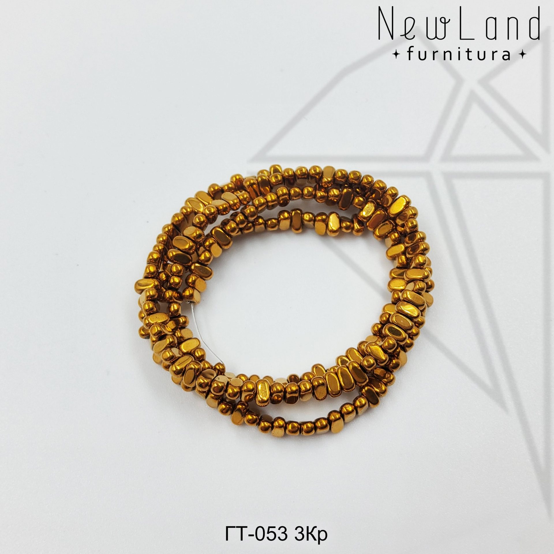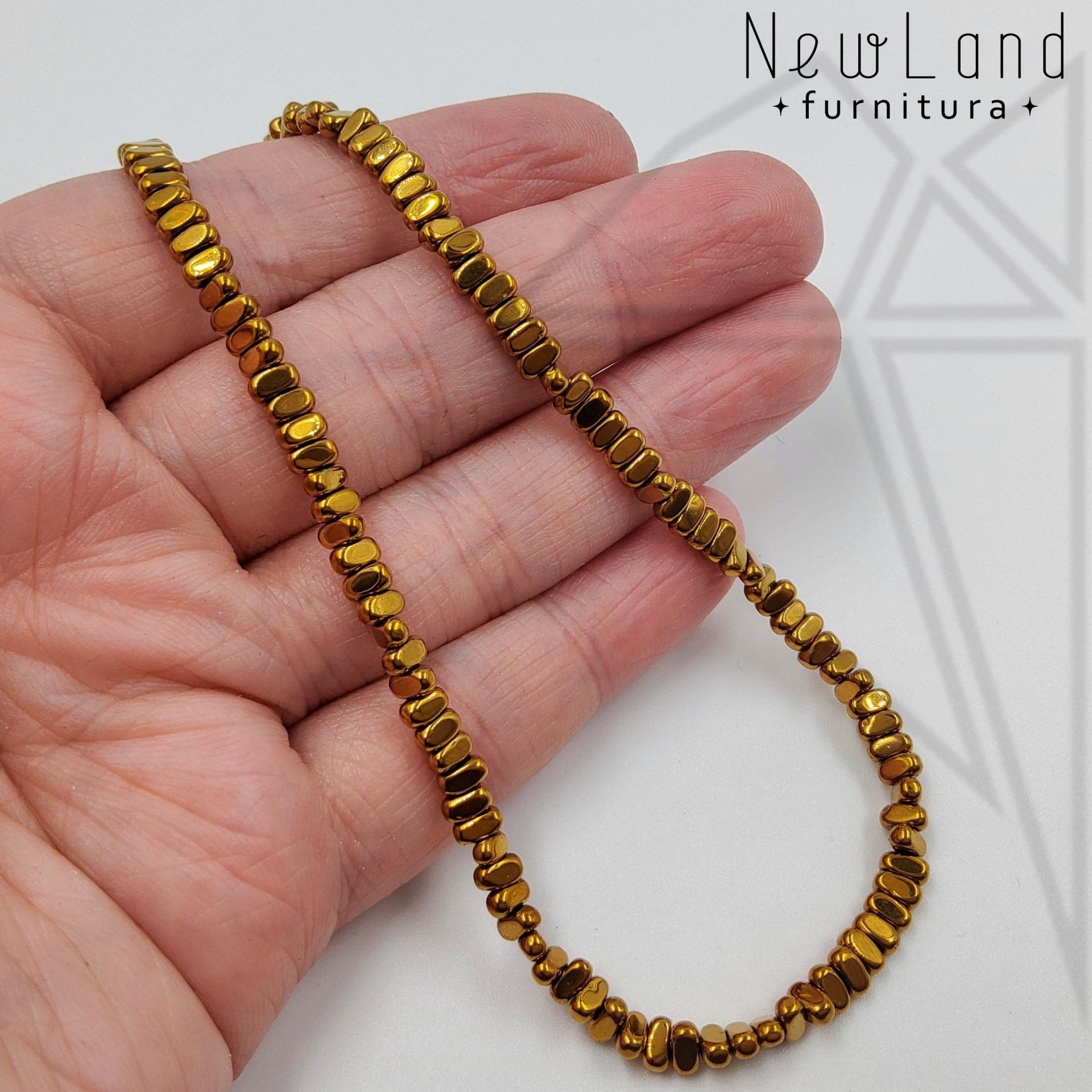 Гематит прямоугольной формы 4х2 мм со сглаженными краями золотистого цвета. Отверстие просверлено поперек бусин.