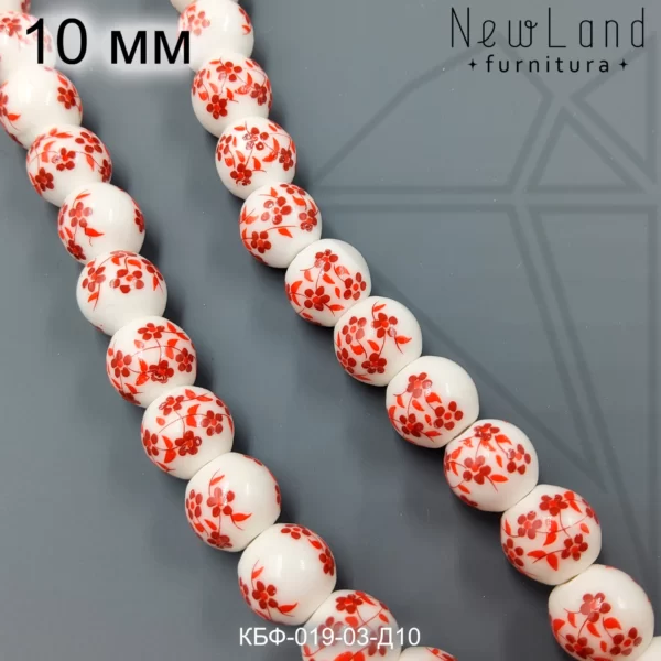 Керамическая бусина круглая белая гжель красного цвета диаметром 10 мм