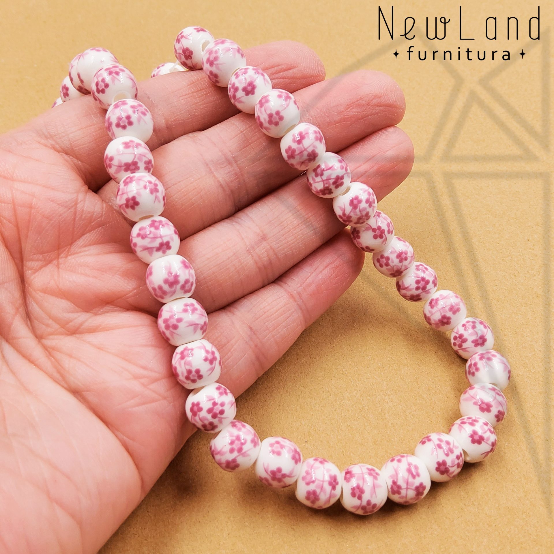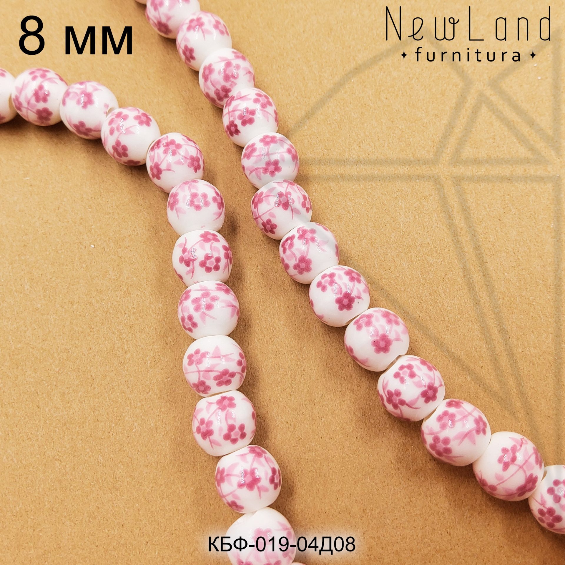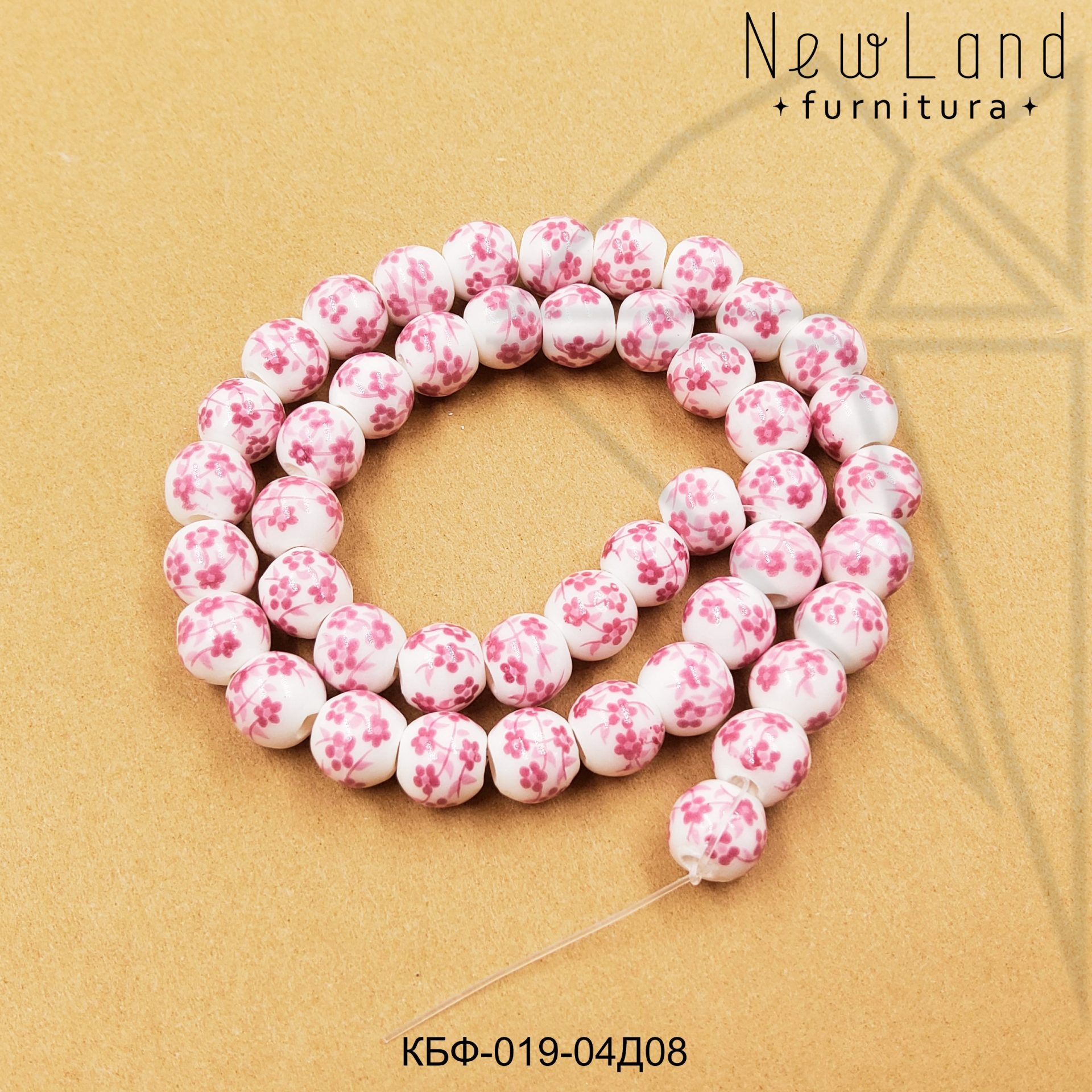 Керамическая бусина круглая белая гжель розового цвета диаметром 8 мм