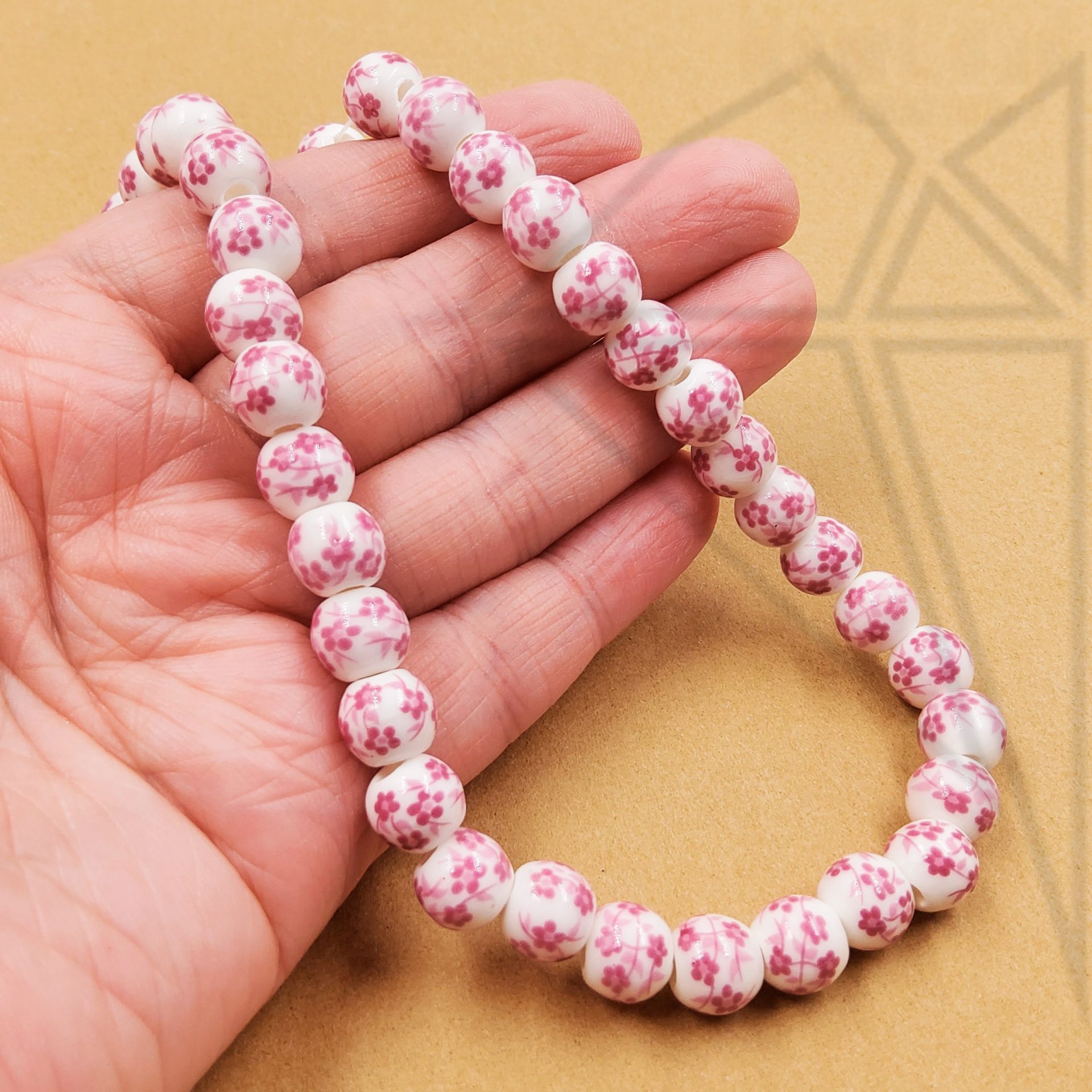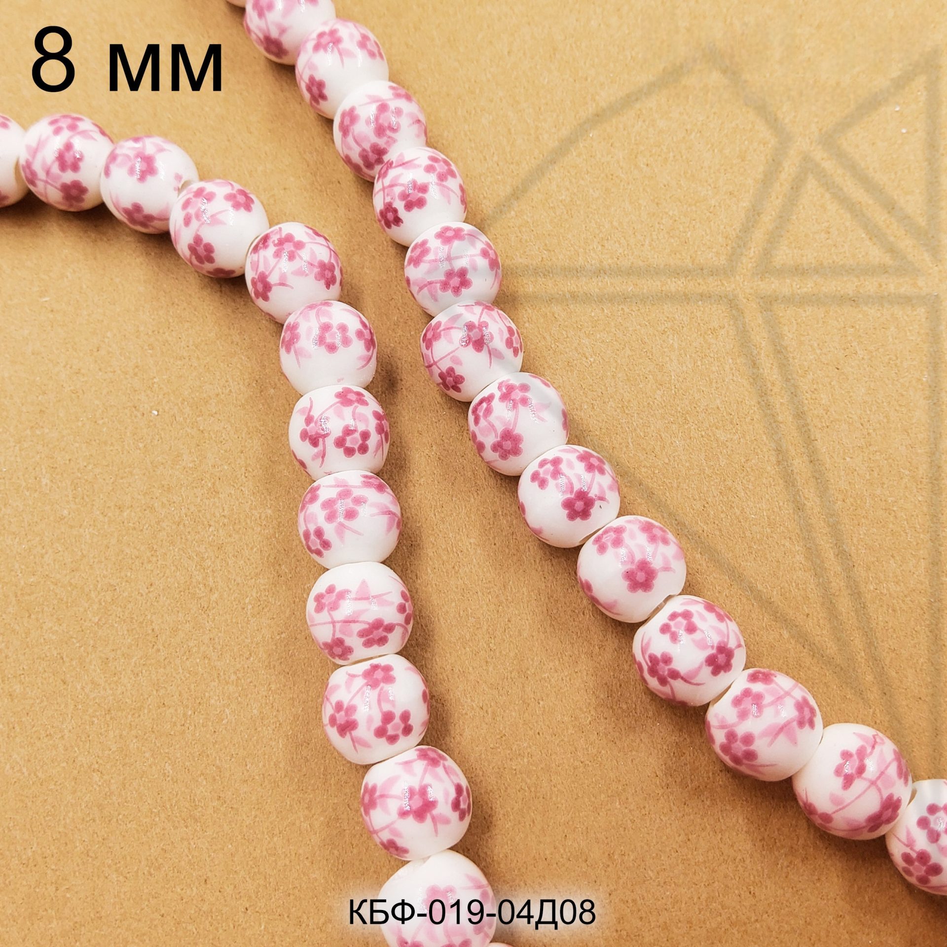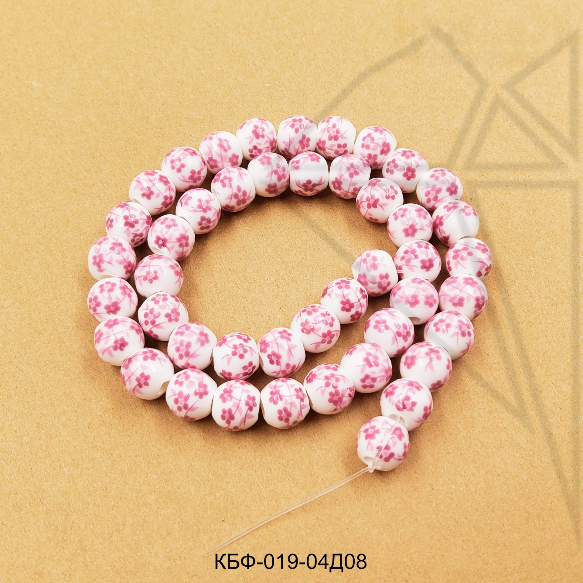 Керамическая бусина круглая белая гжель розового цвета диаметром 8 мм