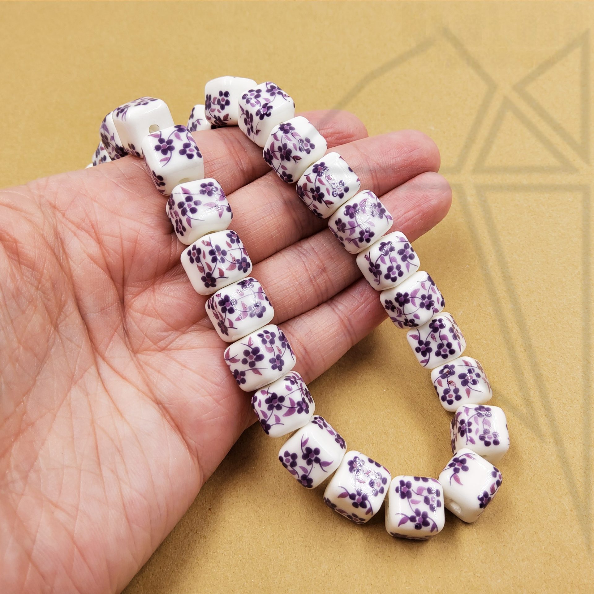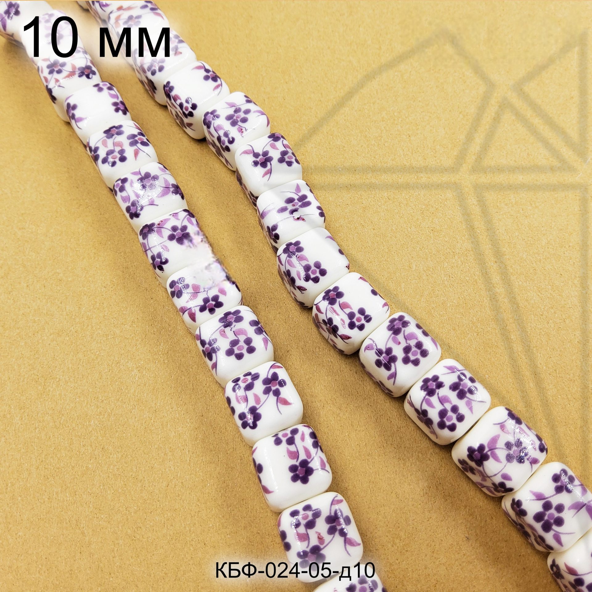 Керамическая бусина гжель в форме куба с фиолетовым рисунком