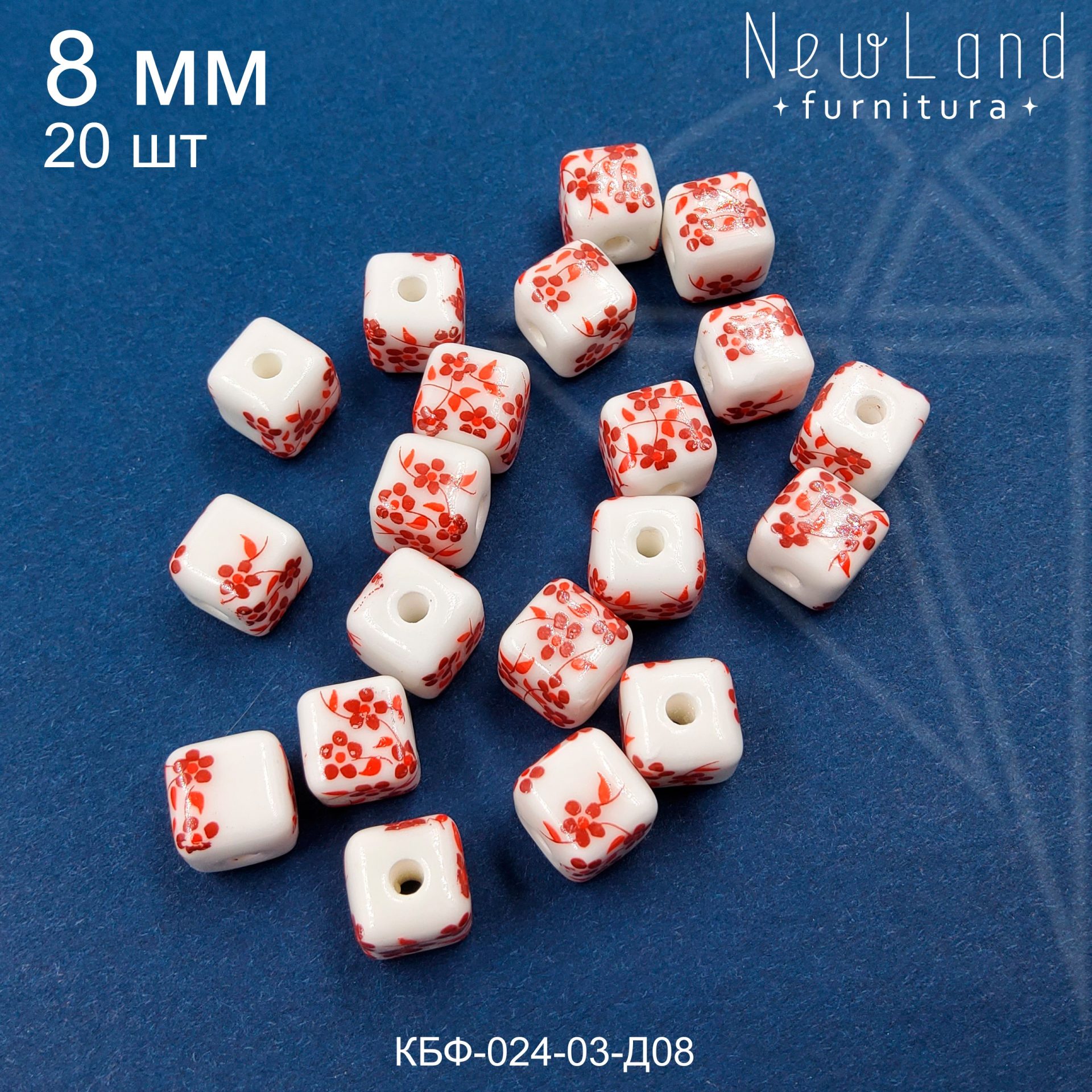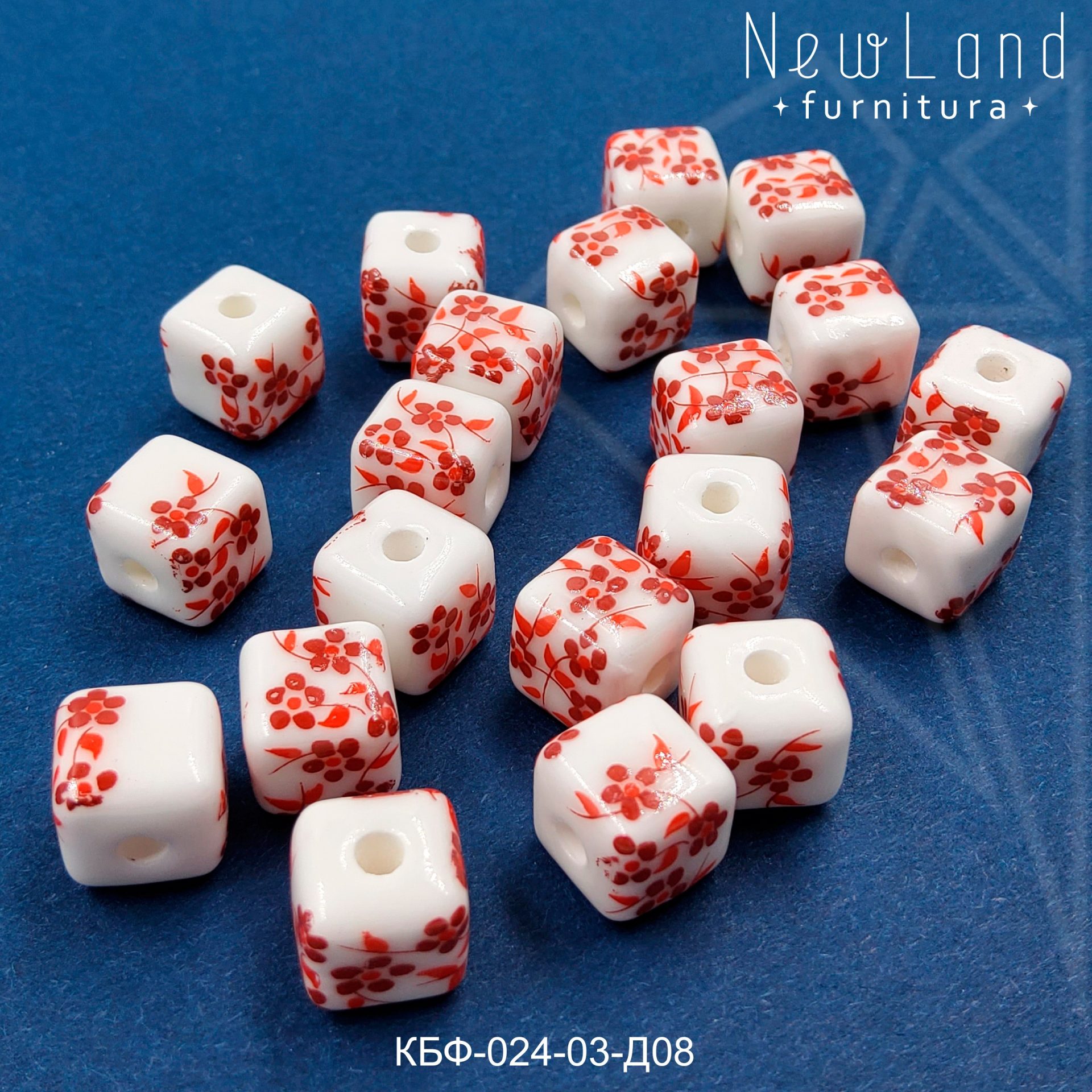Керамическая бусина гжель в форме куба с красным рисунком