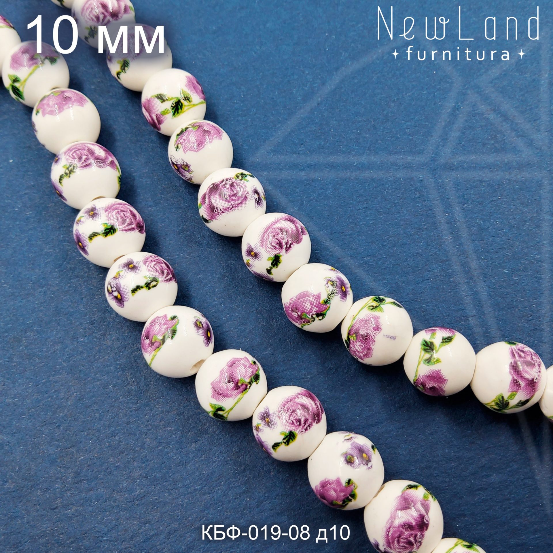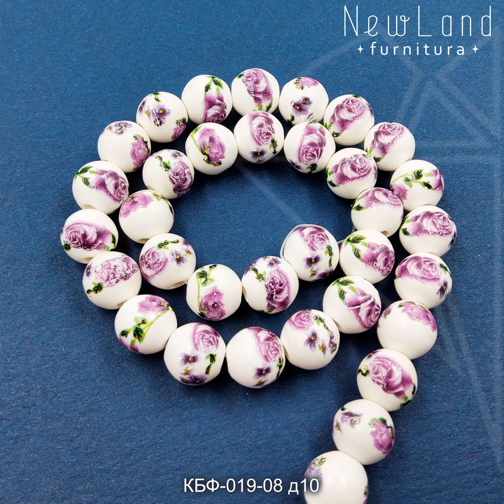 Керамическая бусина круглая белая гжель с фиолетово-зеленым рисунком диаметром 10 мм