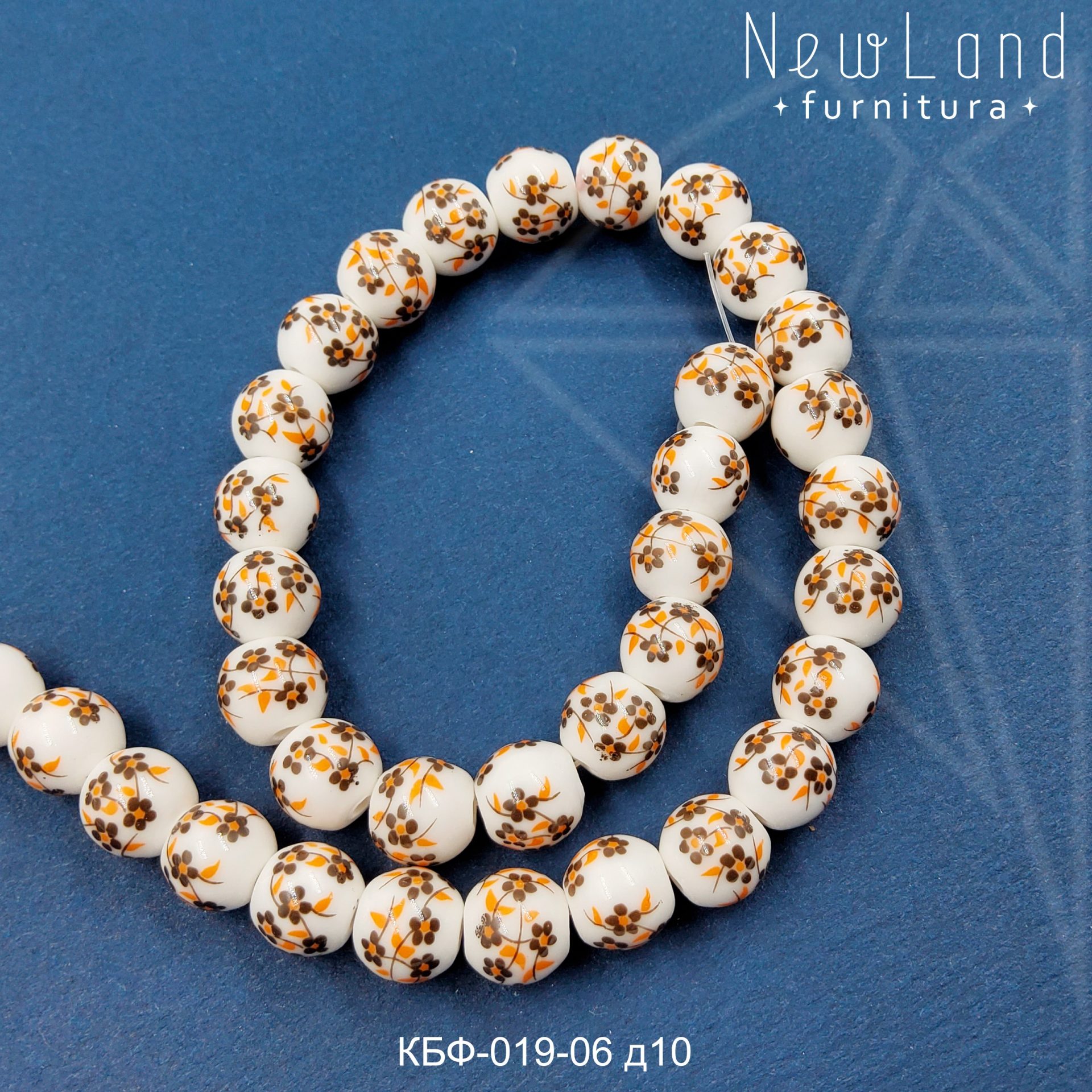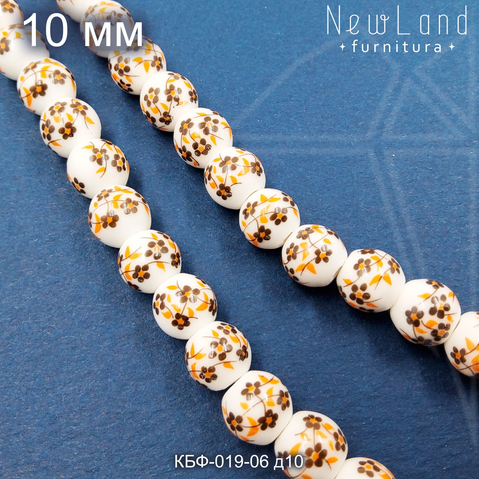 Керамическая бусина круглая белая гжель с коричнево-желтым рисунком диаметром 10 мм
