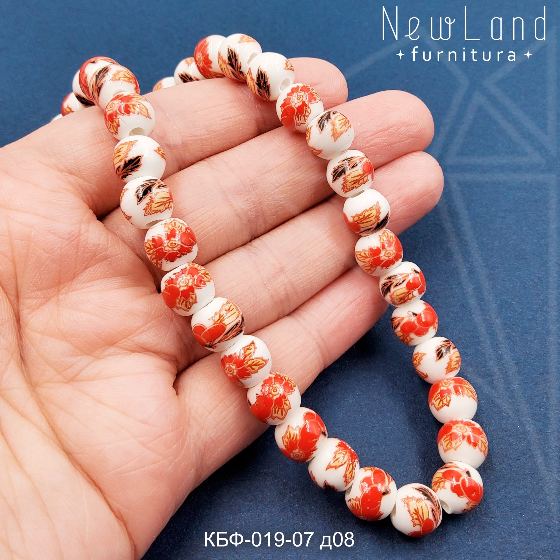 Керамическая бусина круглая белая гжель с оранжево-коричневым рисунком диаметром 8 мм