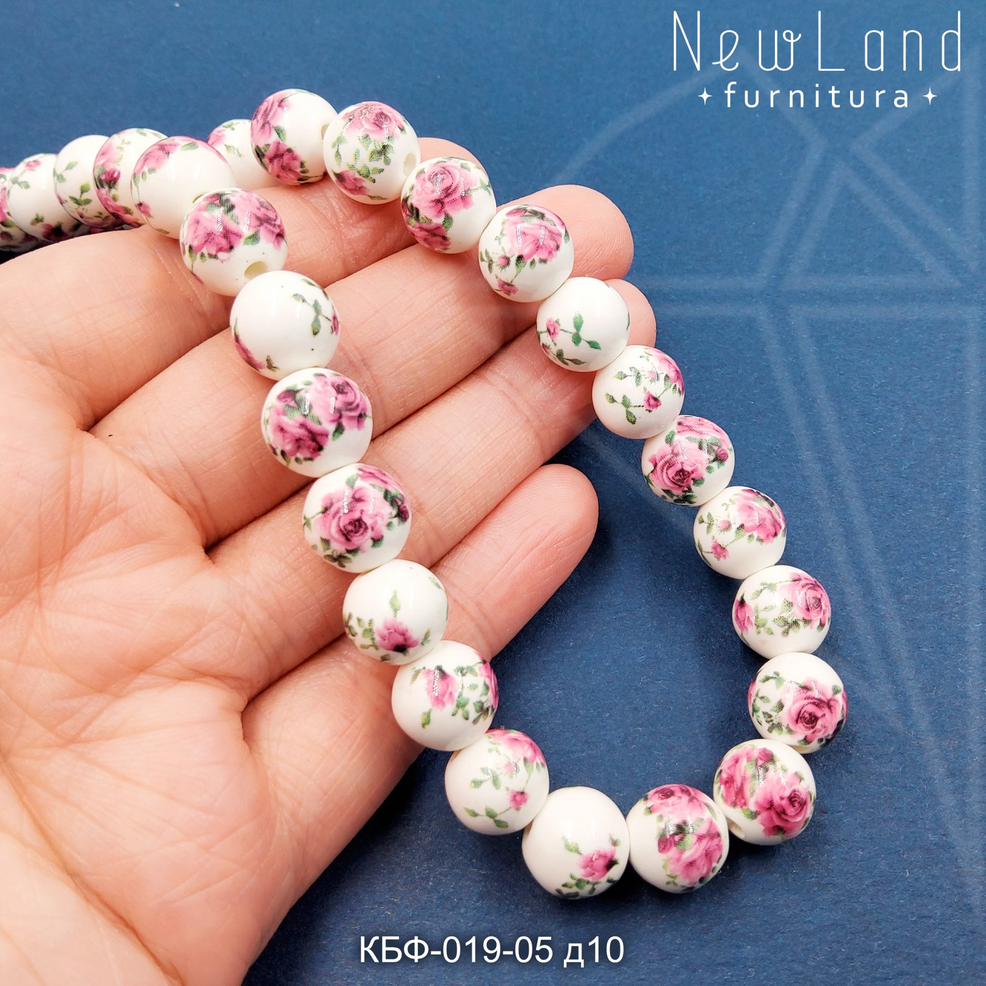 Керамическая бусина круглая белая гжель с розово-зеленым рисунком диаметром 10 мм