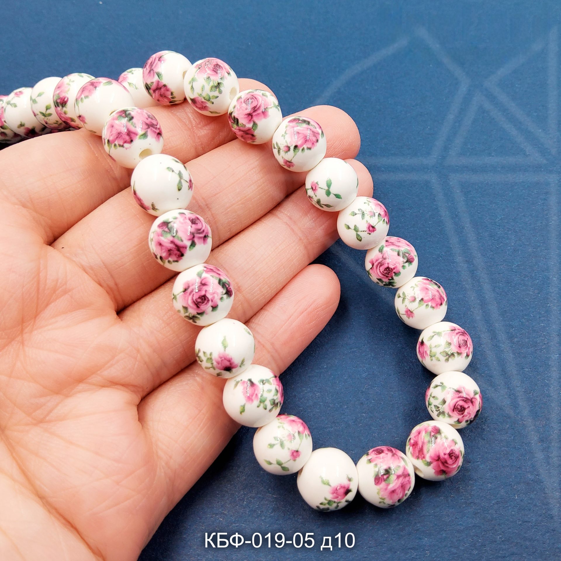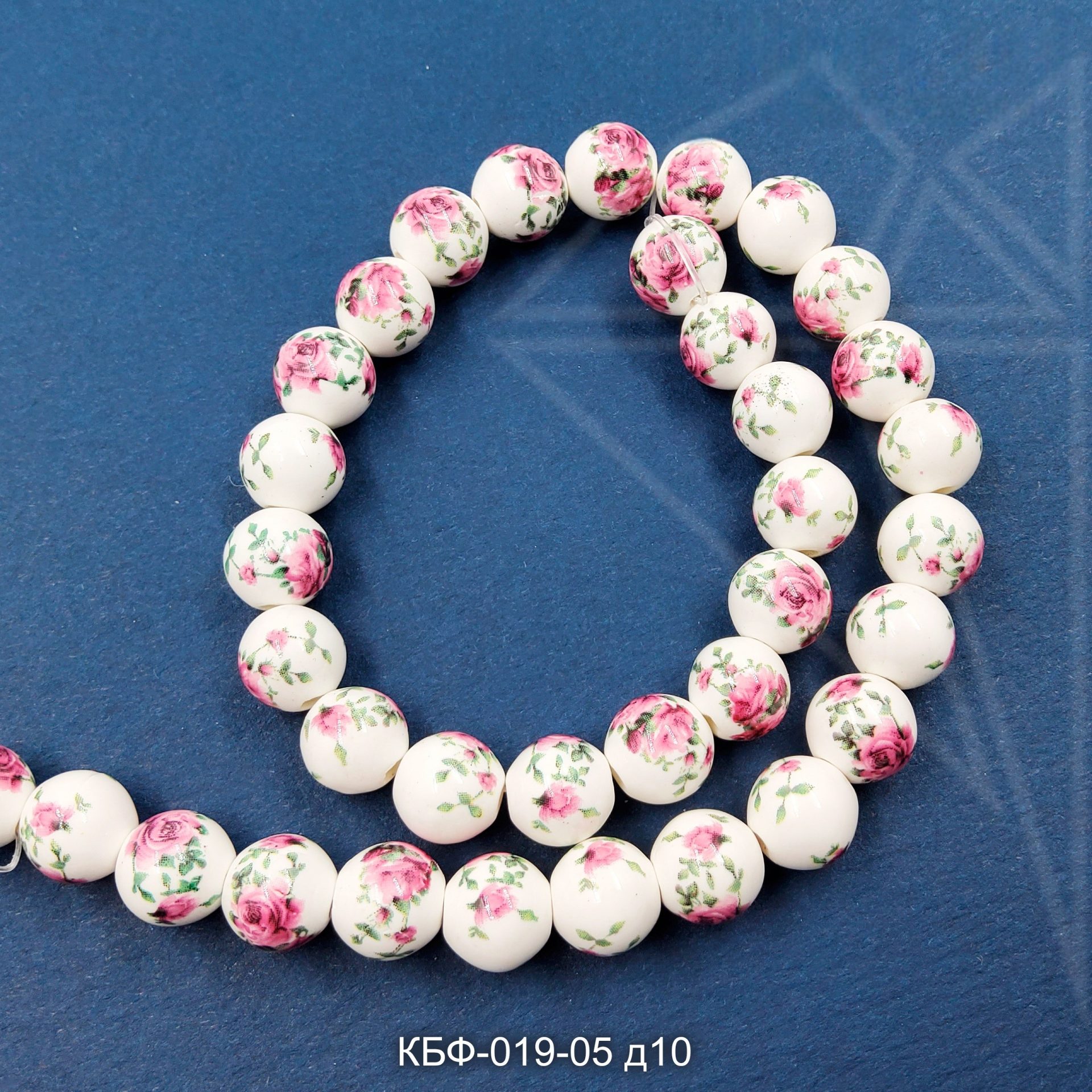 Керамическая бусина круглая белая гжель с розово-зеленым рисунком диаметром 10 мм