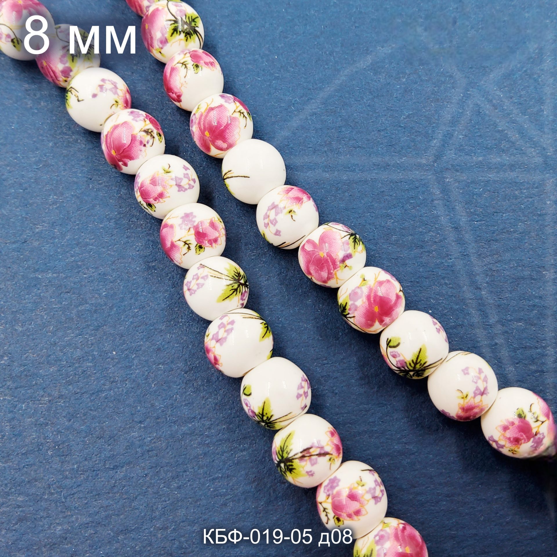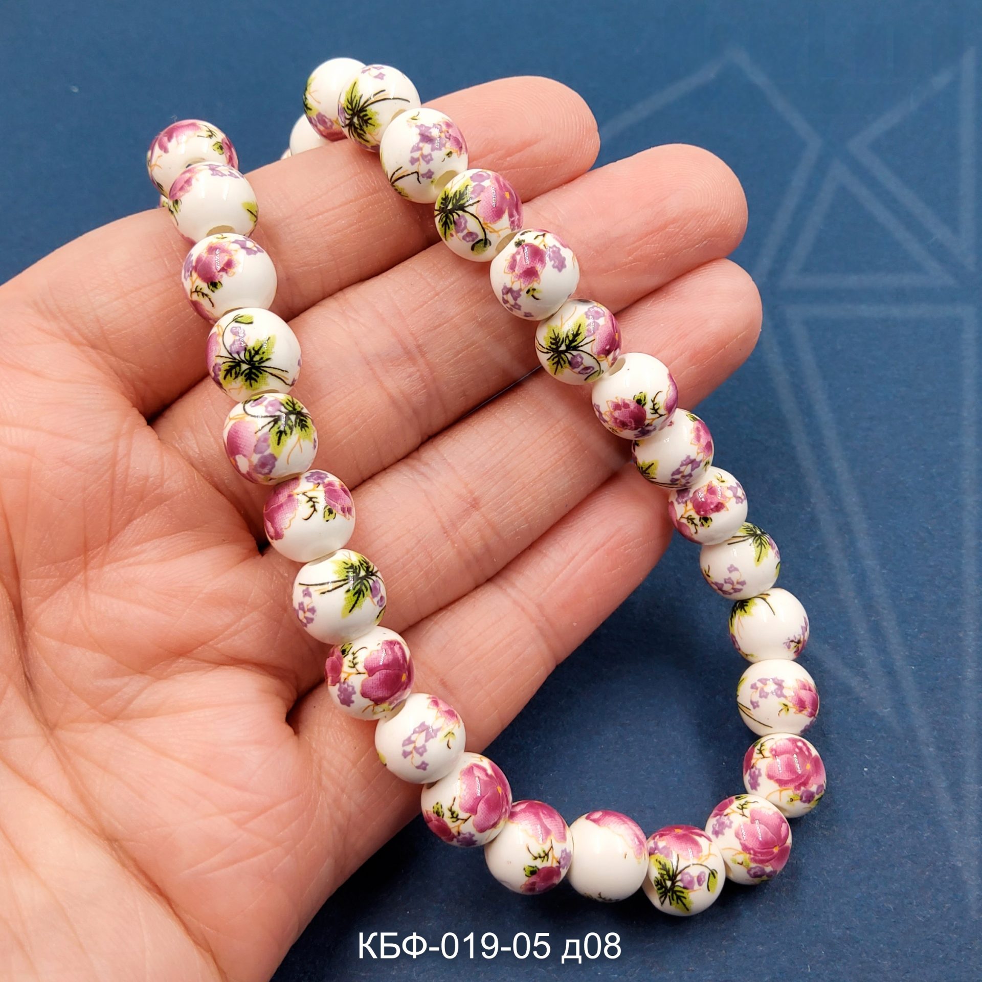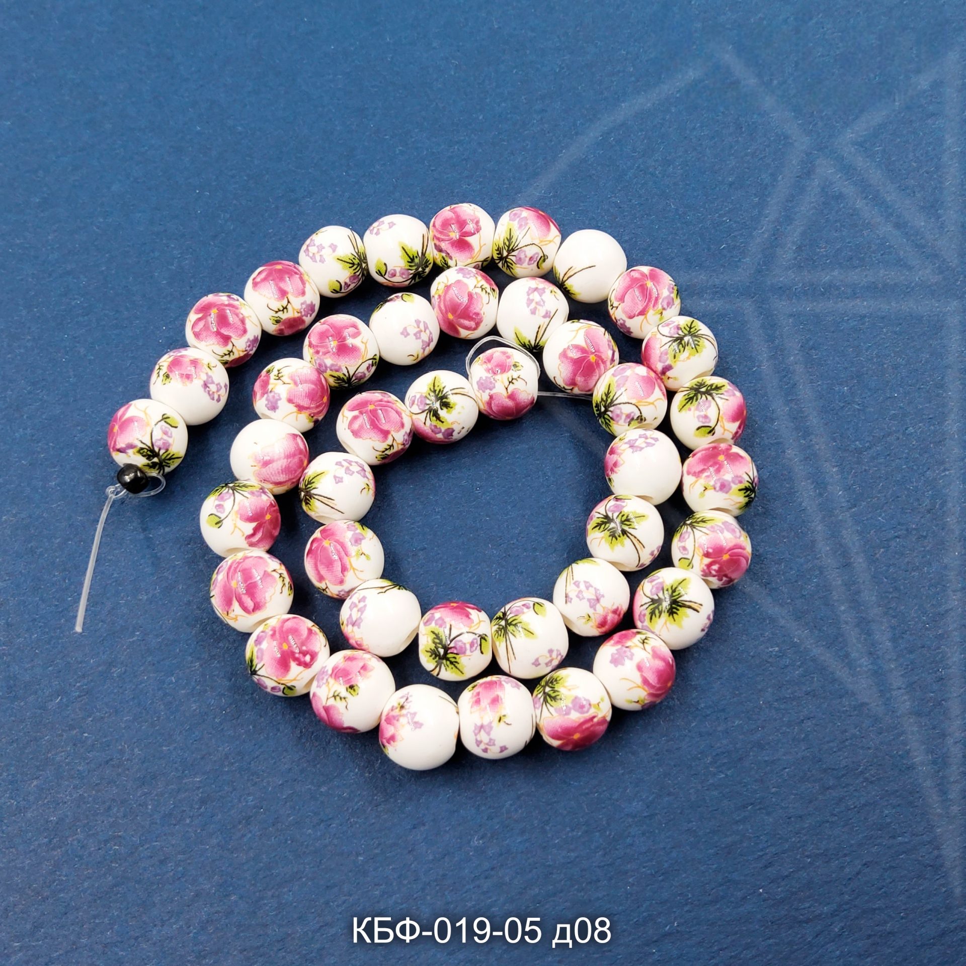 Керамическая бусина круглая белая гжель с розово-зеленым рисунком диаметром 8 мм