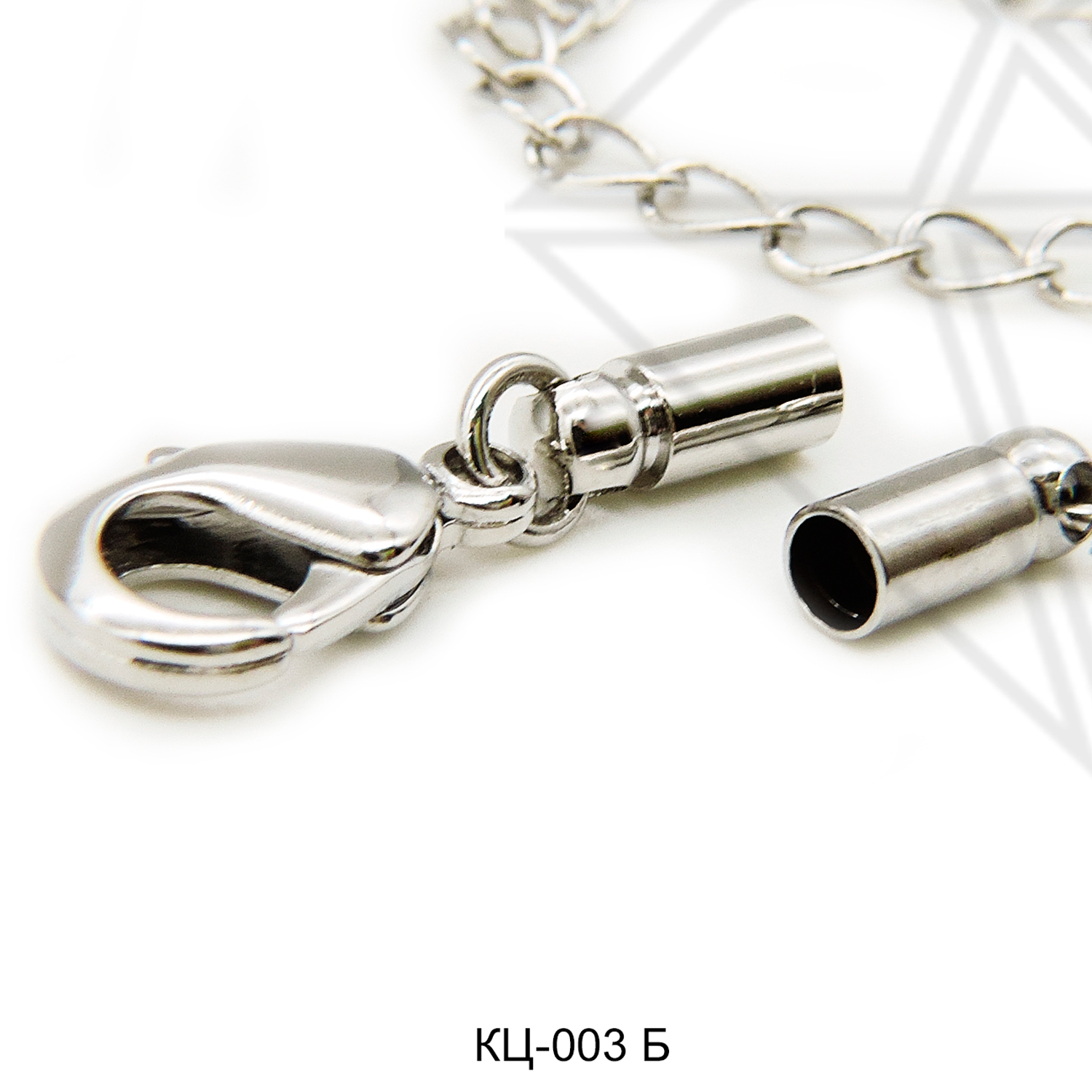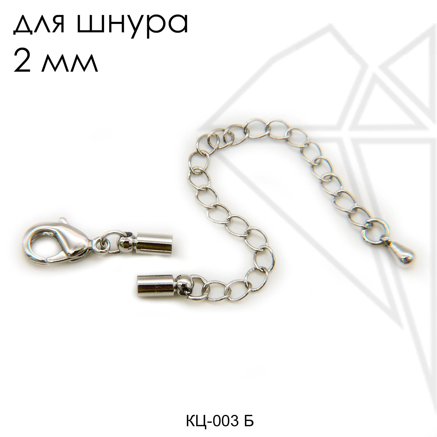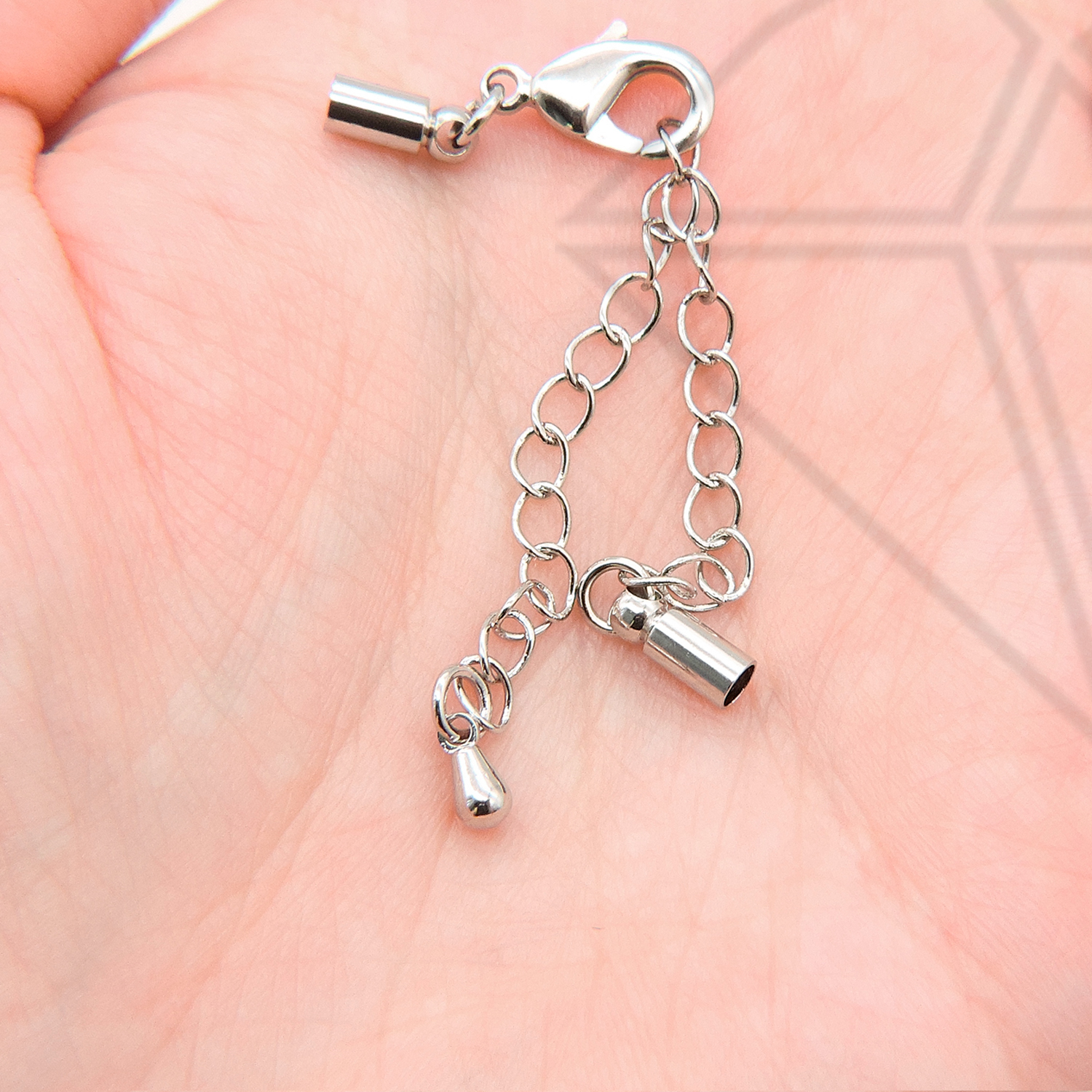 Концевик с карабином и удлинительной цепью для вклейки жгутов, шнуров класса люкс с родированным покрытием (по латуни).