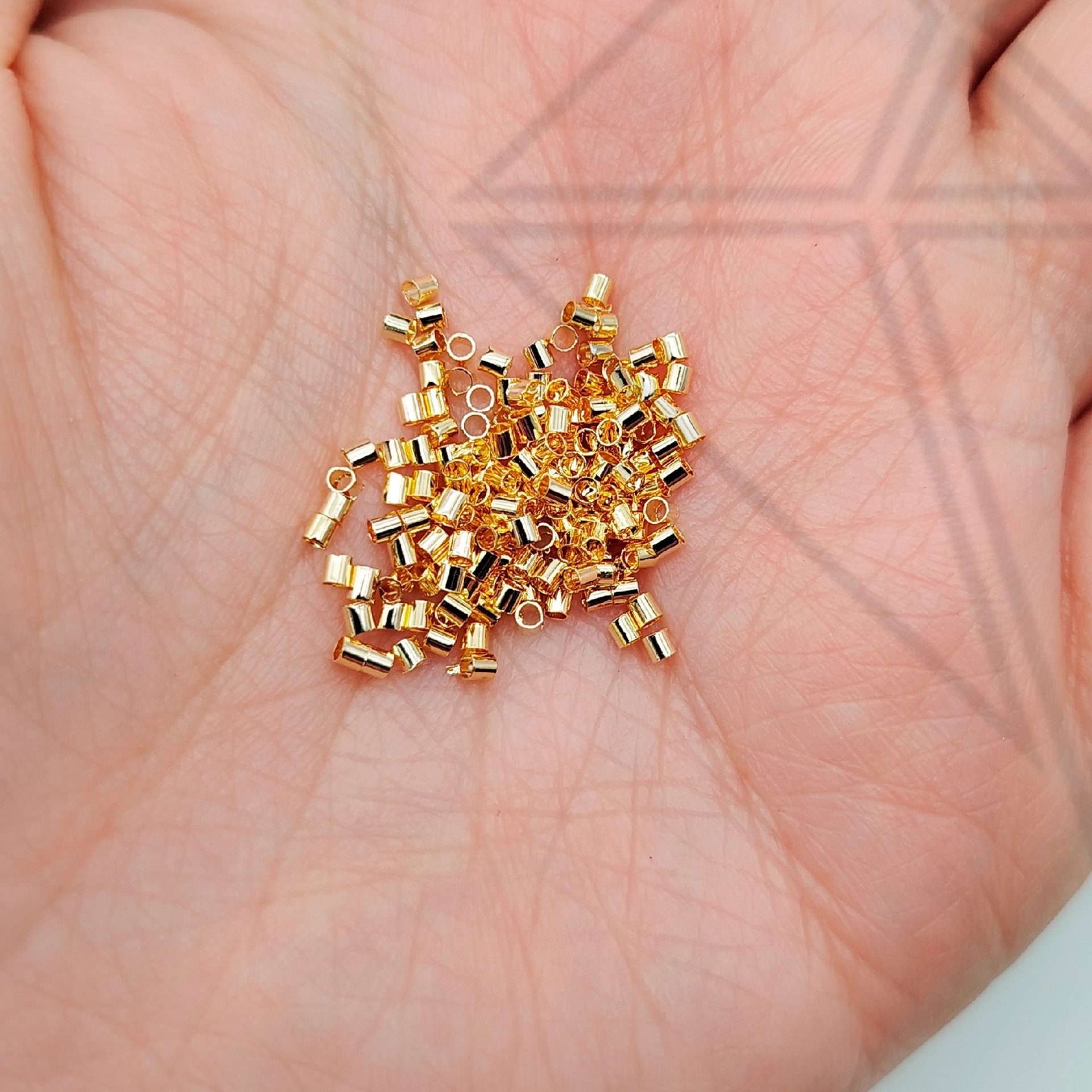 Кримпы зажимные или зажимные бусины прямоугольной (цилиндрической) формы с позолоченным покрытием.