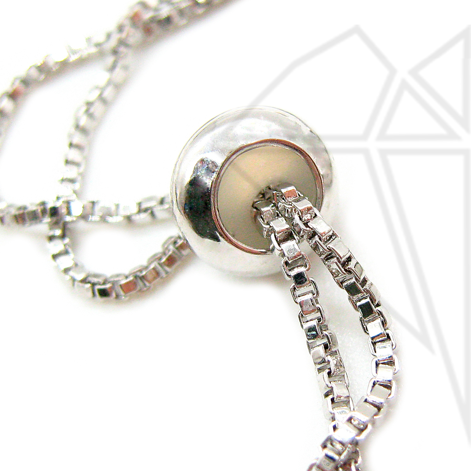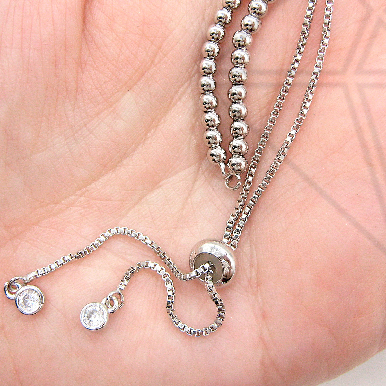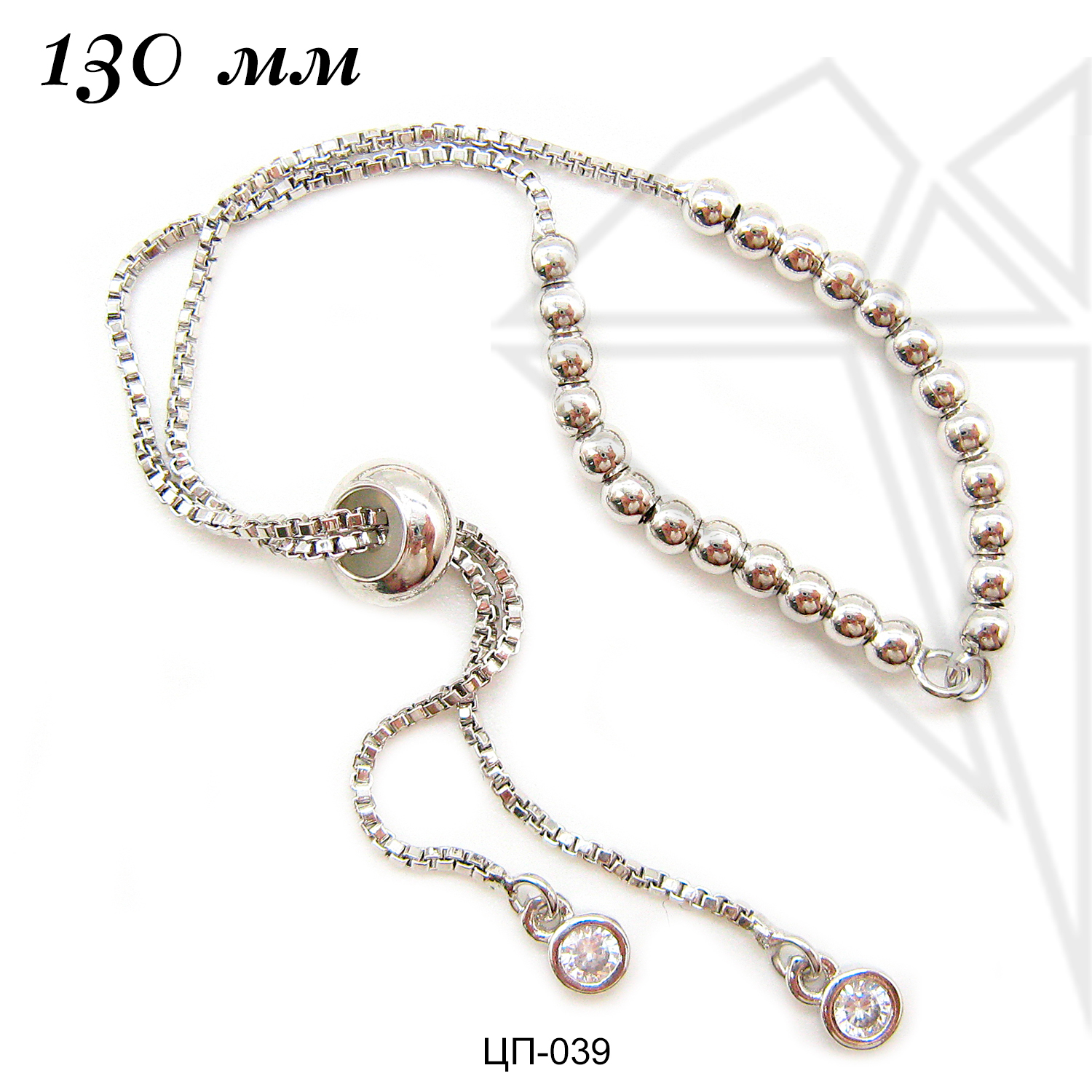 Звенья цепи не разъемные. К колечкам присоединяется основной элемент браслета (коннектор, камни, бусины и т.д.). Длина браслета регулируется с помощью передвижного шарика, который находится по середине браслета.