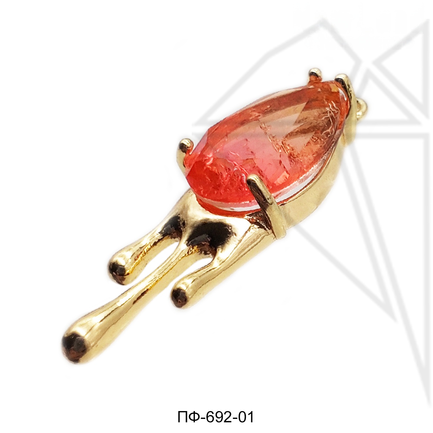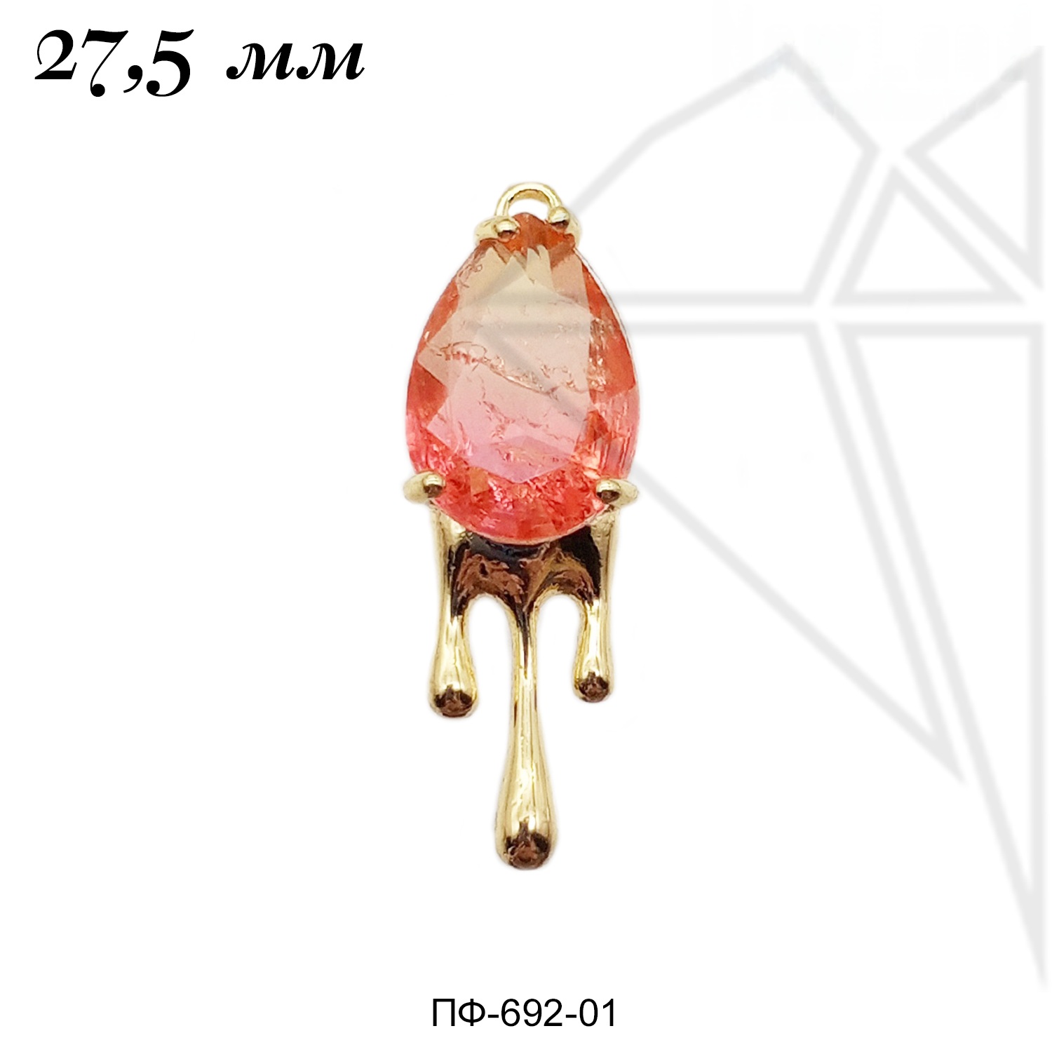 Подвеска инкрустирована крупным кристаллом в форме капли кораллового цвета, с внутренним рисунком кракле.