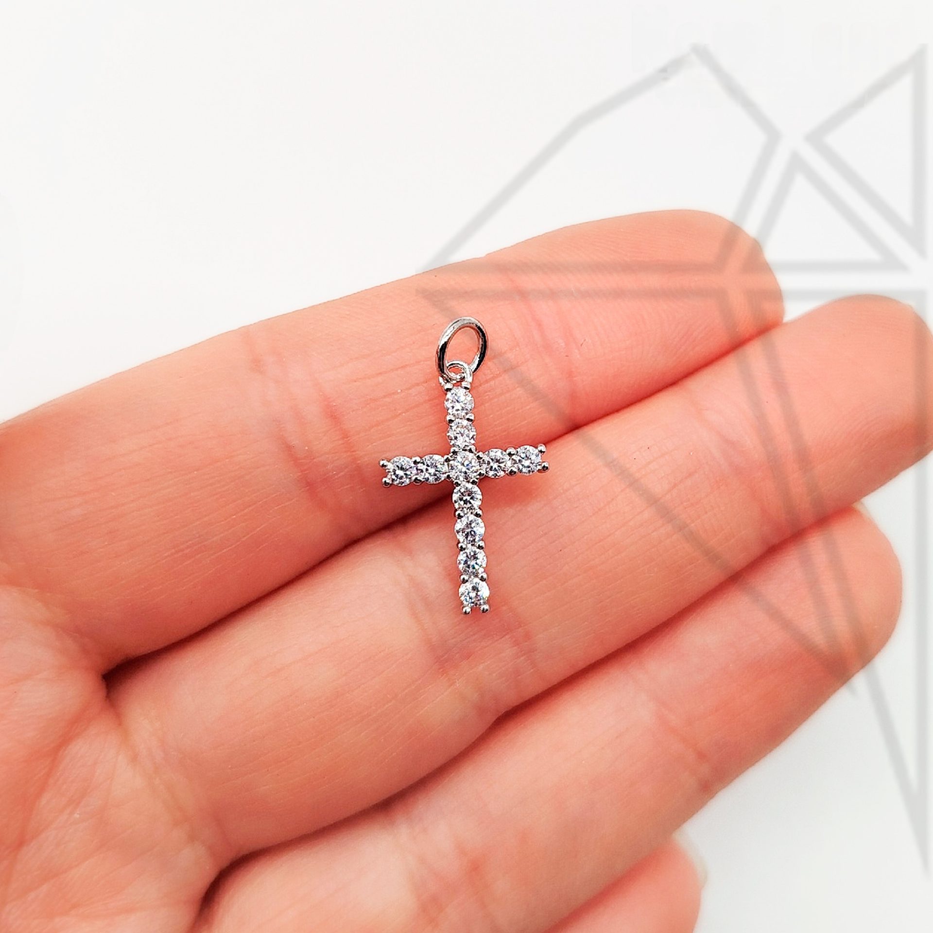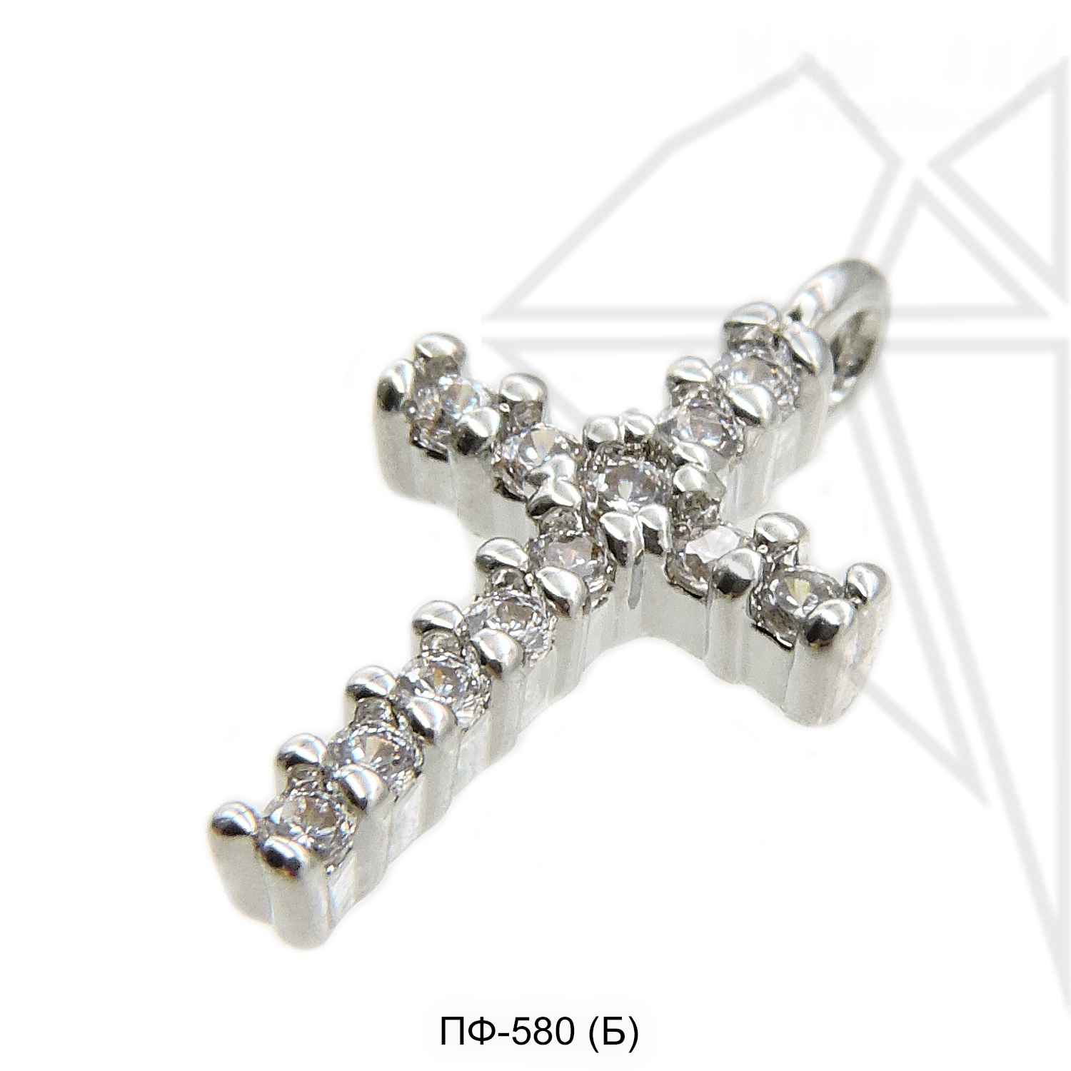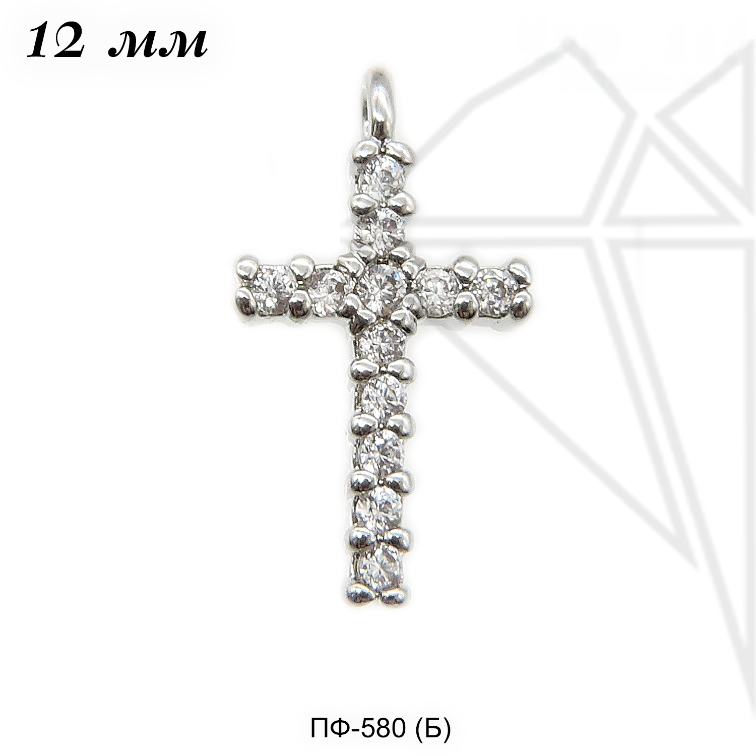 Подвеска в форме креста класса люкс с родированным покрытием (по латуни) с белыми (прозрачными) фианитами.