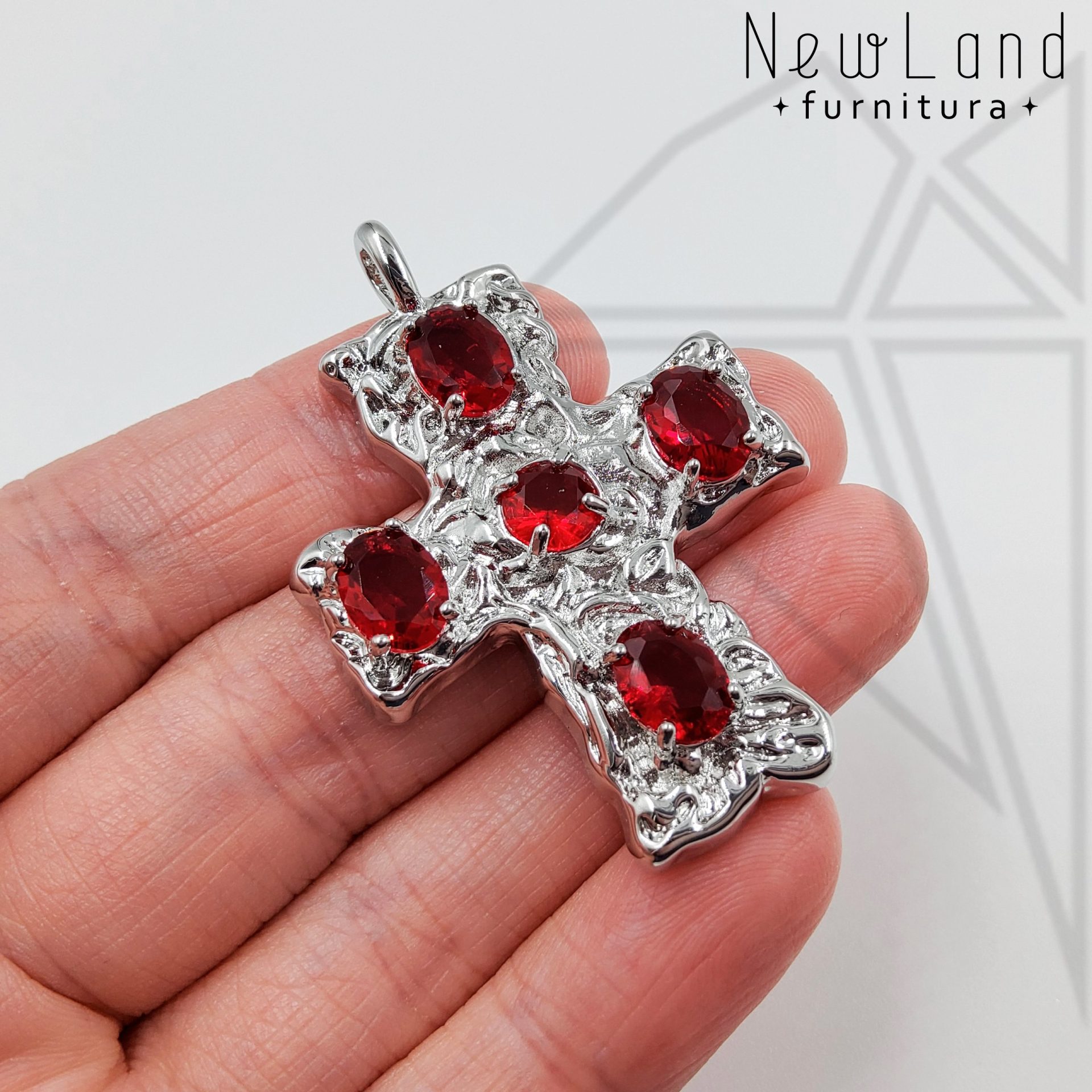Подвеска в форме креста с красными фианитами класса люкс с родированным покрытием (по латуни).
