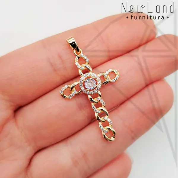 Подвеска крестик цепочка с белыми (прозрачными) фианитами класса люкс с позолоченным покрытием (по латуни)