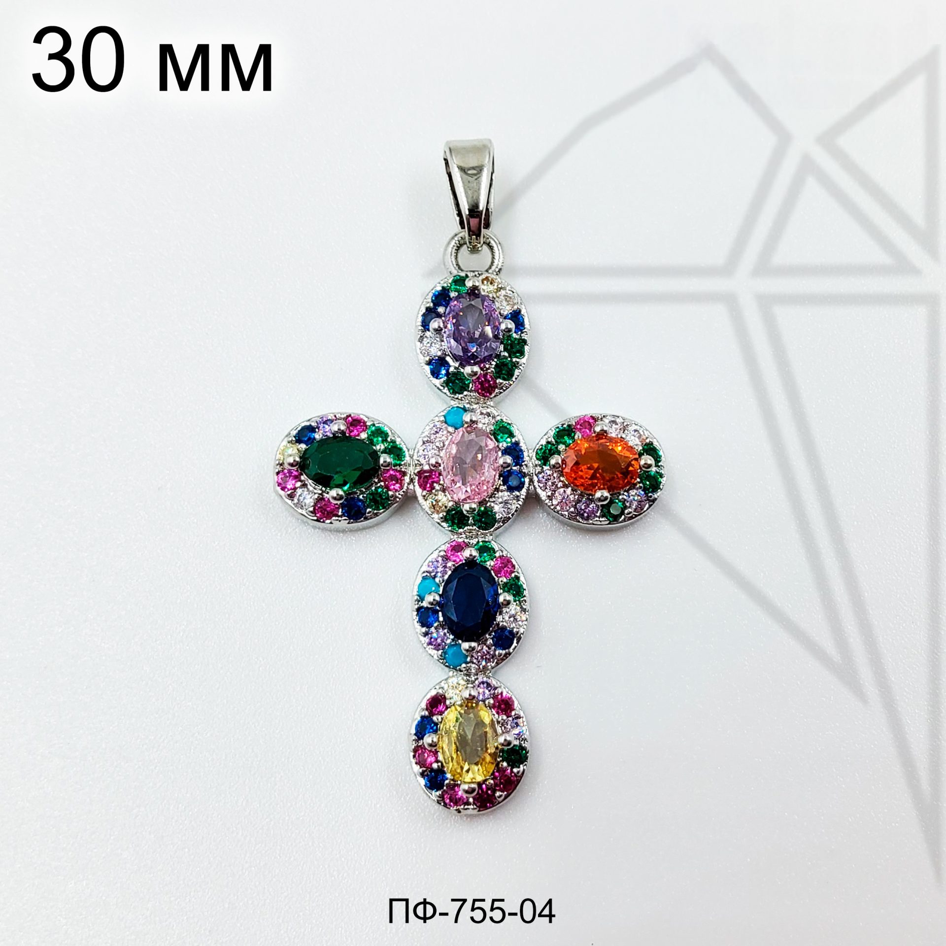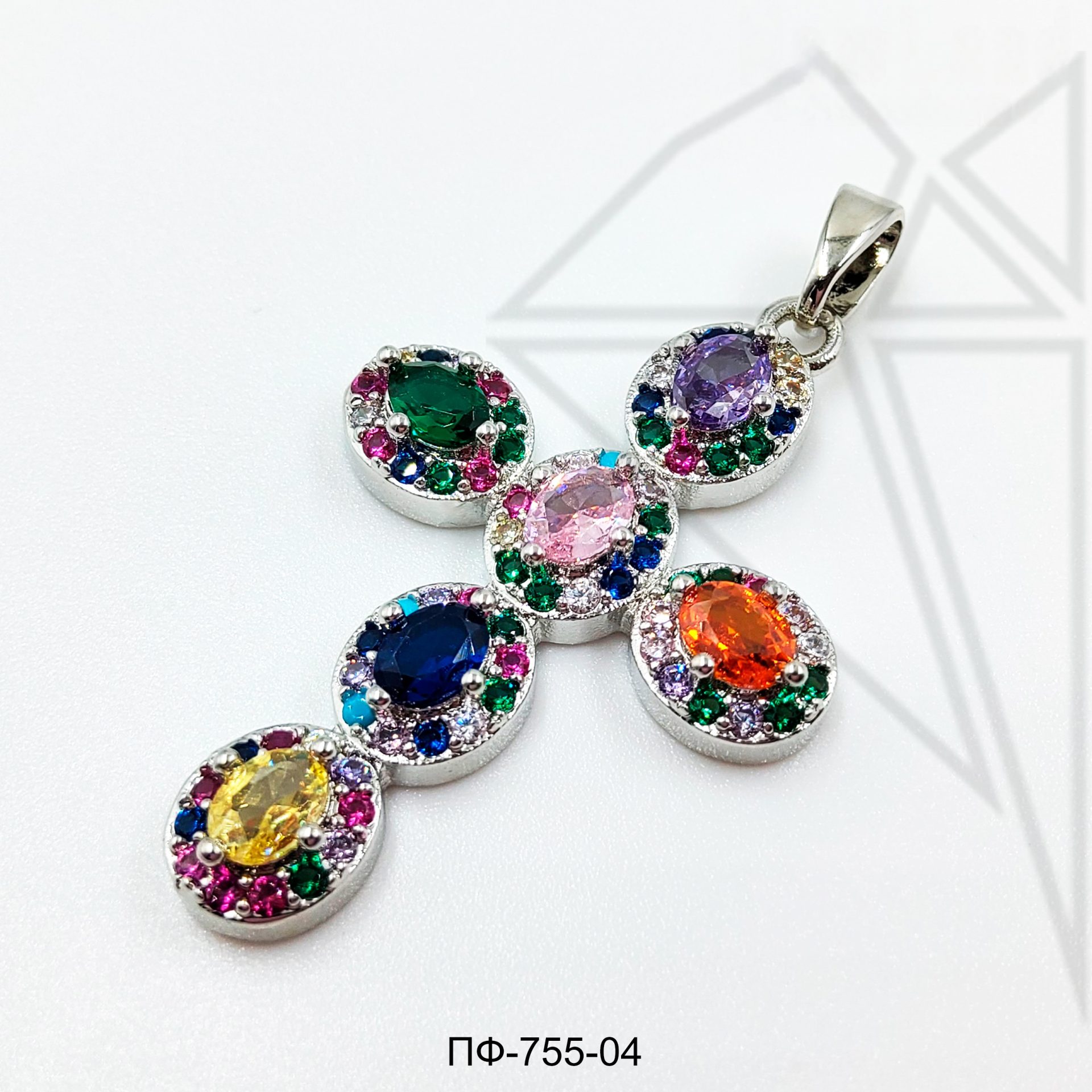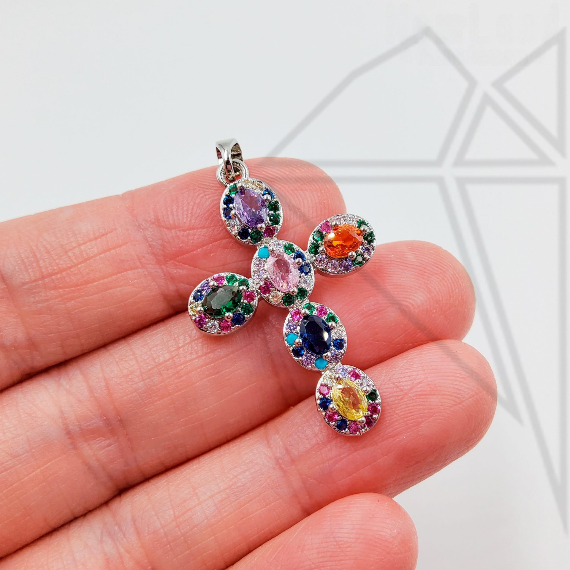 Подвеска крестик с цветными фианитами класса люкс с родированным покрытием (по латуни)