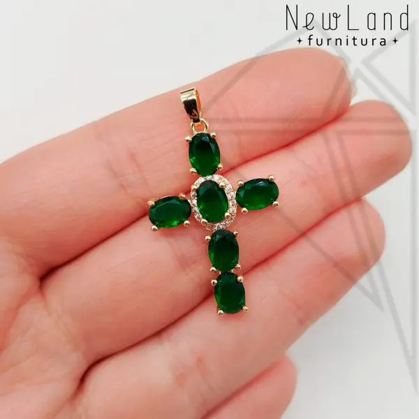 Подвеска крестик с зелеными фианитами класса люкс с позолоченным покрытием (по латуни)