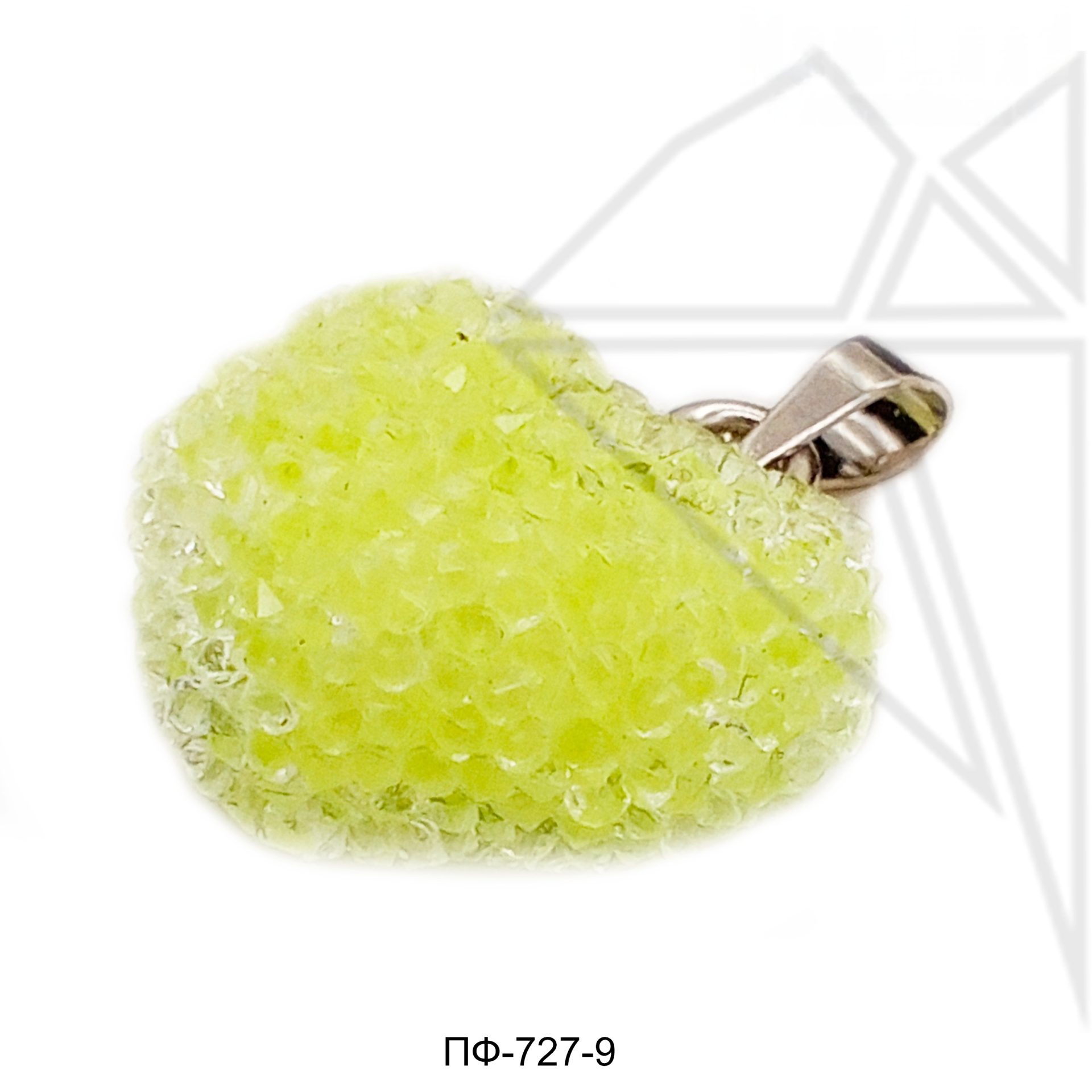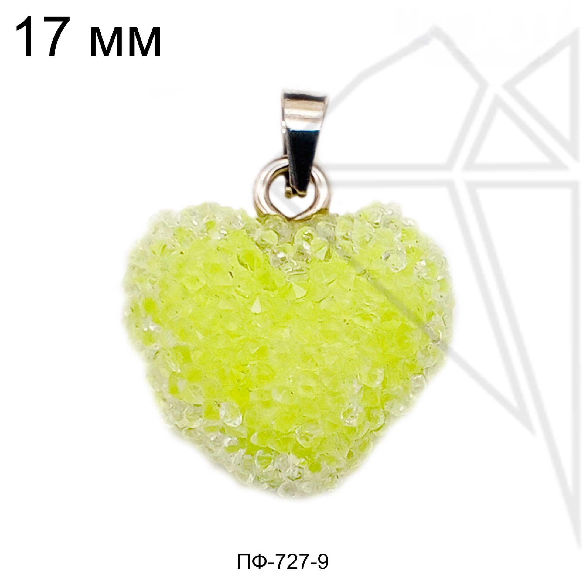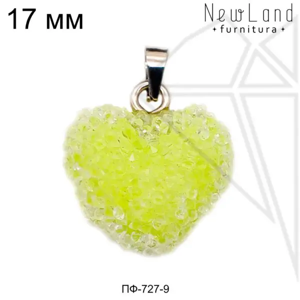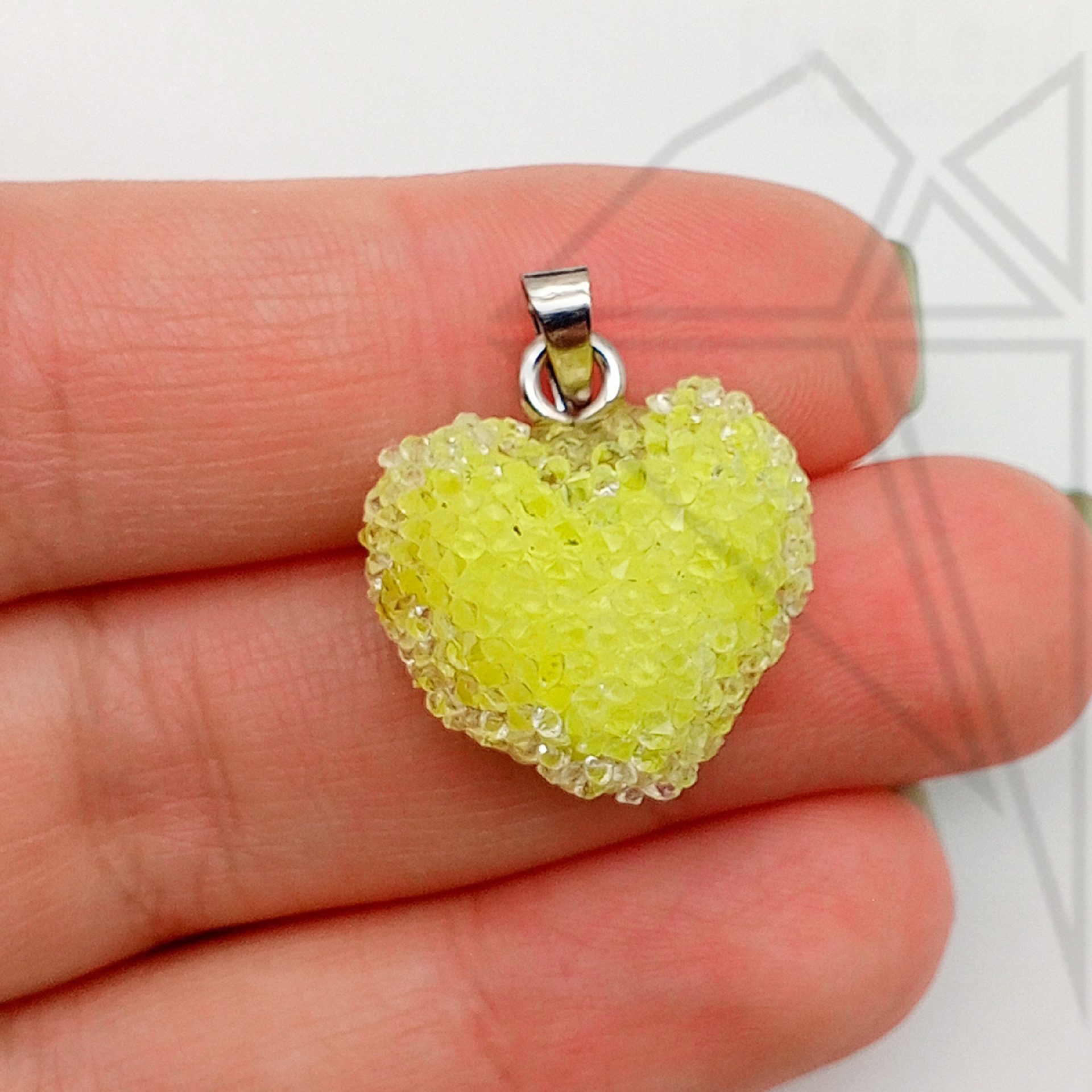Подвеска в форме желтого сердца с петелькой и бейлом серебристого цвета.