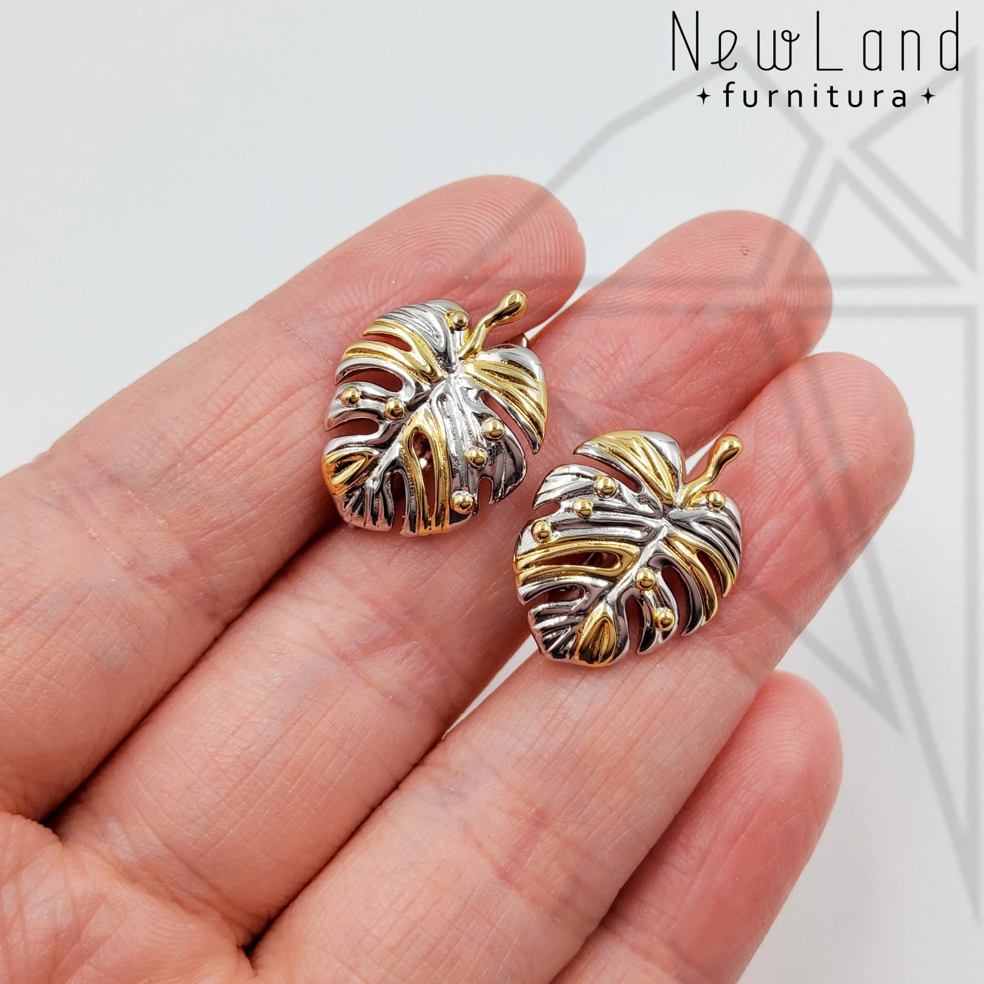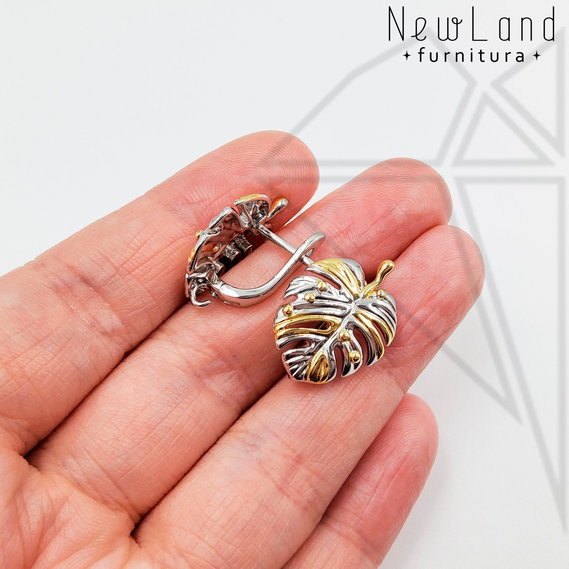 Швензы в форме листиков Монстеры с английским замком класса люкс с позолочено-родированным покрытием (по латуни).