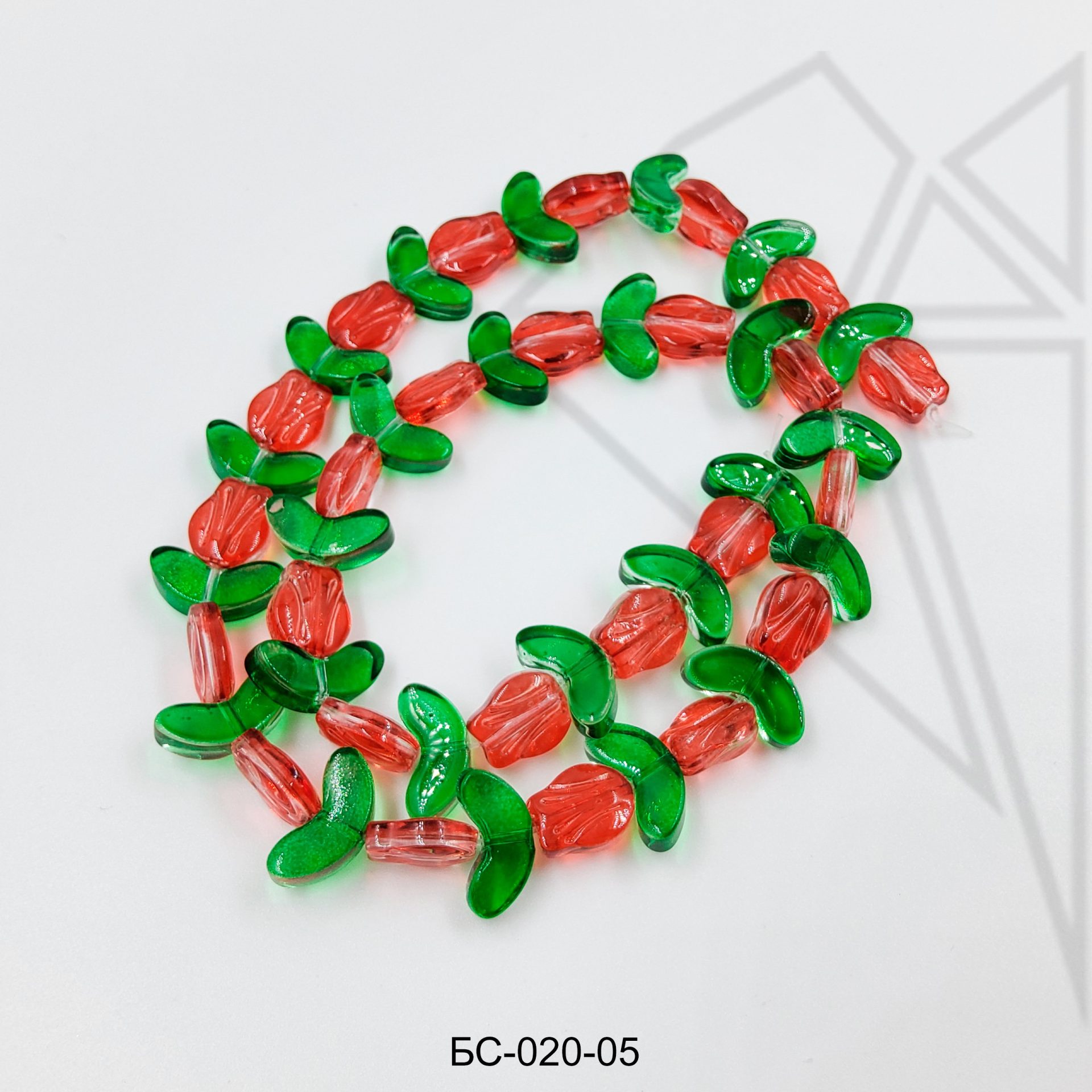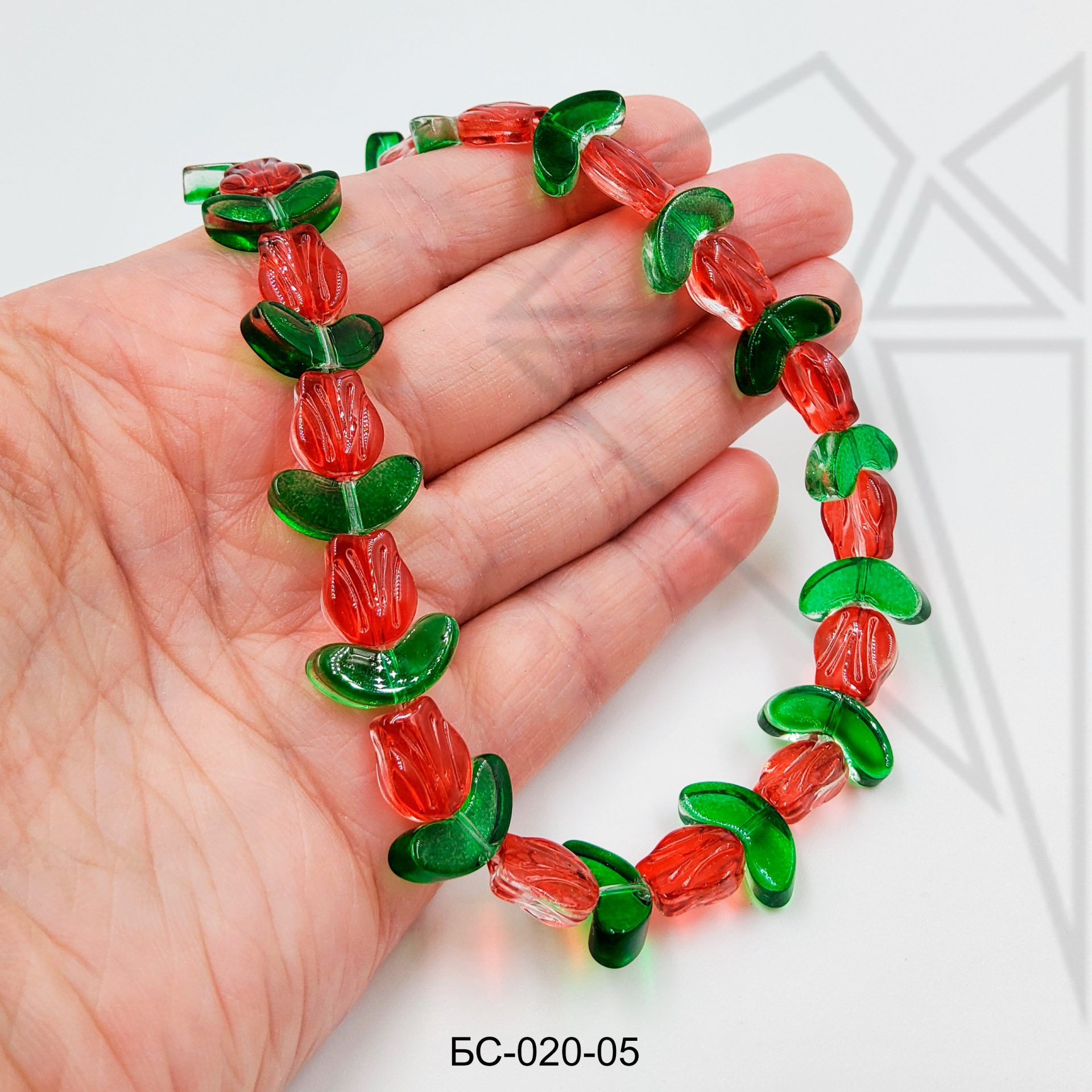 Бусина стеклянная в форме красного цветка с зелеными листиками.