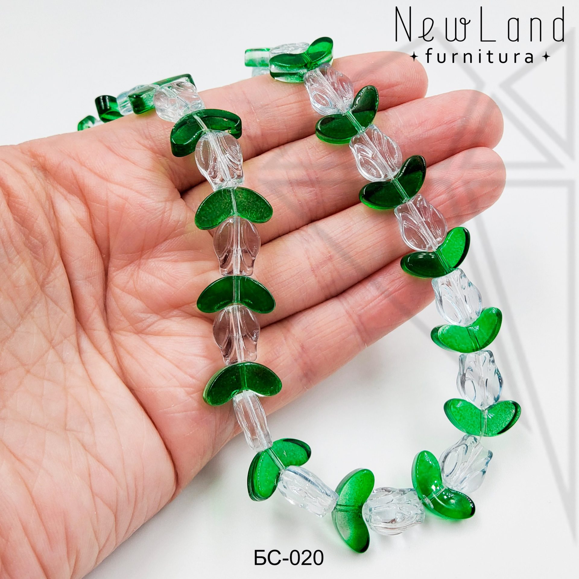 Бусина стеклянная в форме прозрачного цветка с зелеными листиками.
