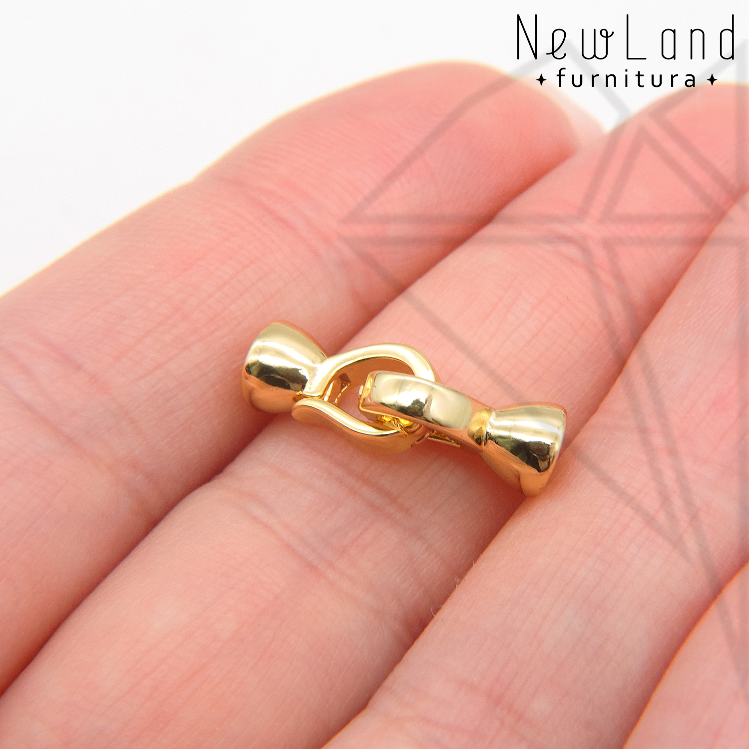 Замок с застежкой двойной класса люкс из латуни с радированным покрытием, не темнеет, не облезает. Основной элемент застежки накладывается на ответную часть застежки, складывается как книжка и защелкивается за специальный выступ. В качестве ответной части может выступать соединительное колечко или такой же замочек.