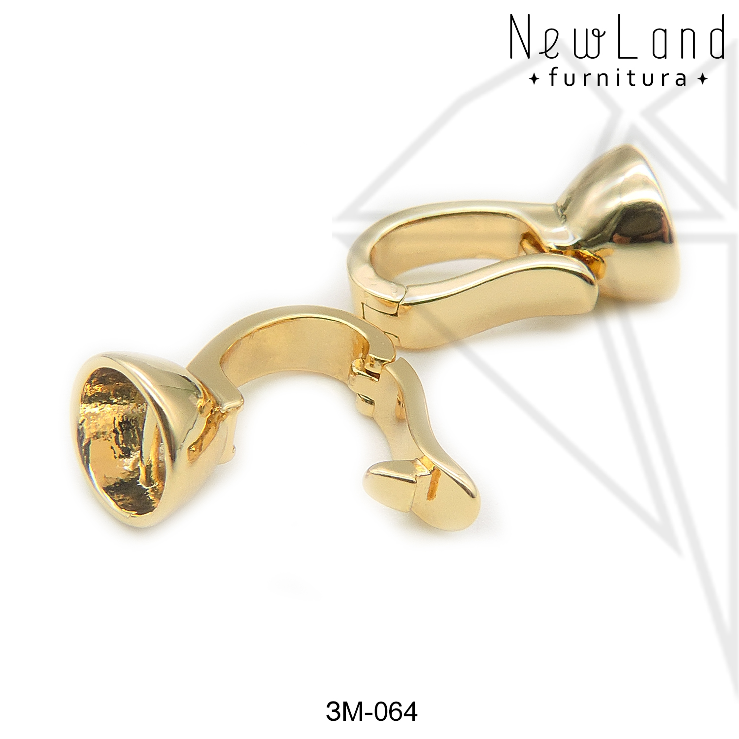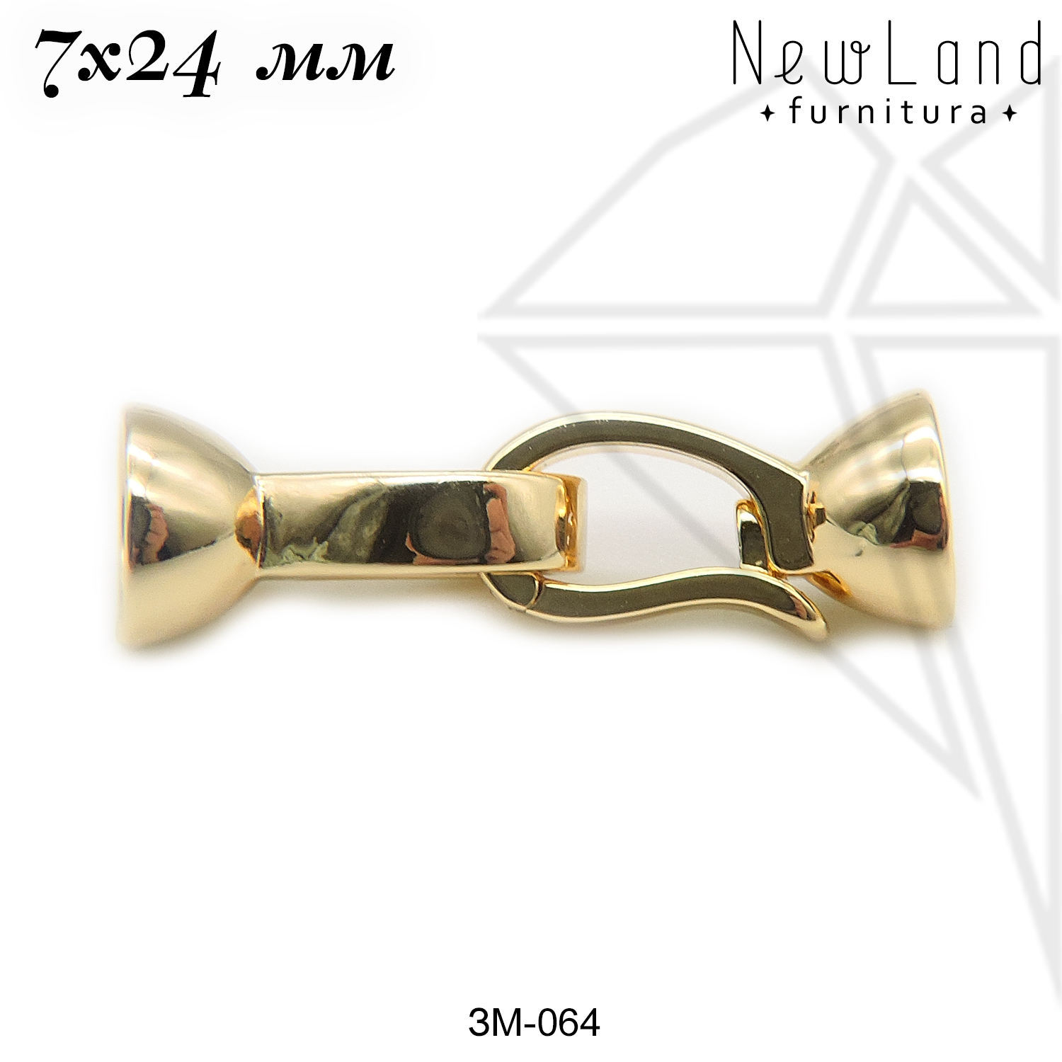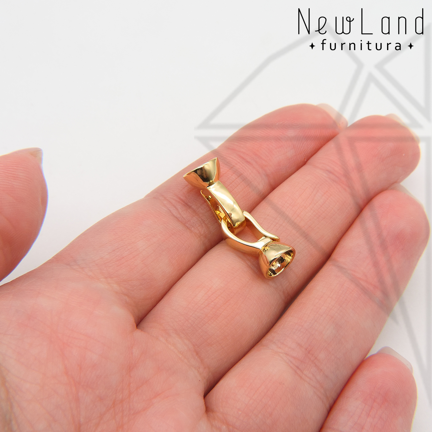 Замок с застежкой двойной класса люкс из латуни с радированным покрытием, не темнеет, не облезает. Основной элемент застежки накладывается на ответную часть застежки, складывается как книжка и защелкивается за специальный выступ. В качестве ответной части может выступать соединительное колечко или такой же замочек.
