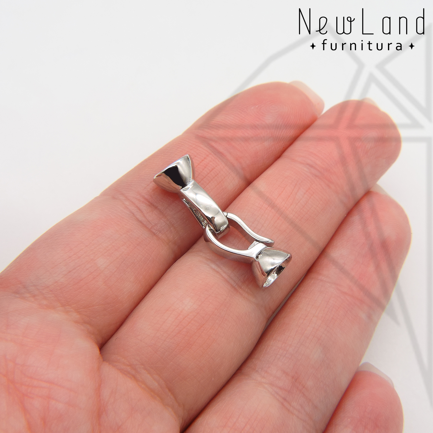 Замок с застежкой двойной класса люкс из латуни с радированным покрытием, не темнеет, не облезает. Основной элемент застежки накладывается на ответную часть застежки, складывается как книжка и защелкивается за специальный выступ. В качестве ответной части может выступать соединительное колечко или такой же замочек.