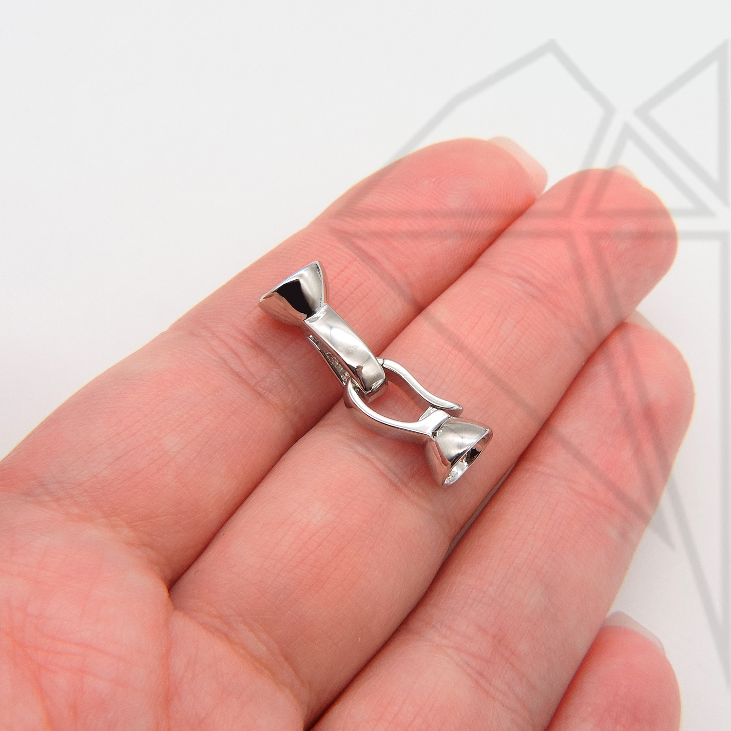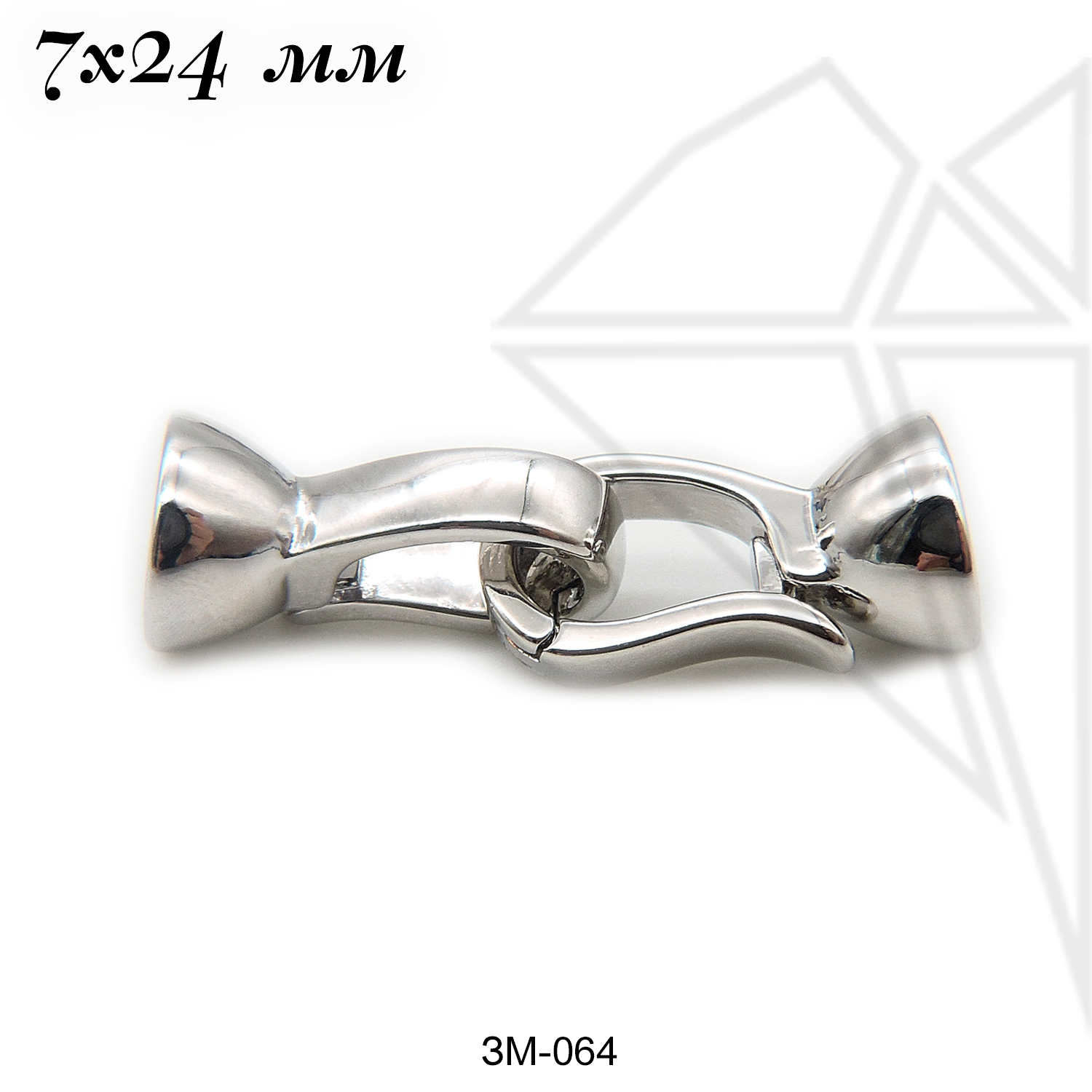 Замок с застежкой двойной класса люкс из латуни с радированным покрытием, не темнеет, не облезает. Основной элемент застежки накладывается на ответную часть застежки, складывается как книжка и защелкивается за специальный выступ. В качестве ответной части может выступать соединительное колечко или такой же замочек.