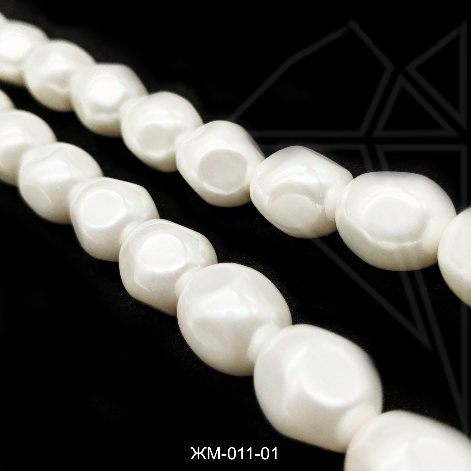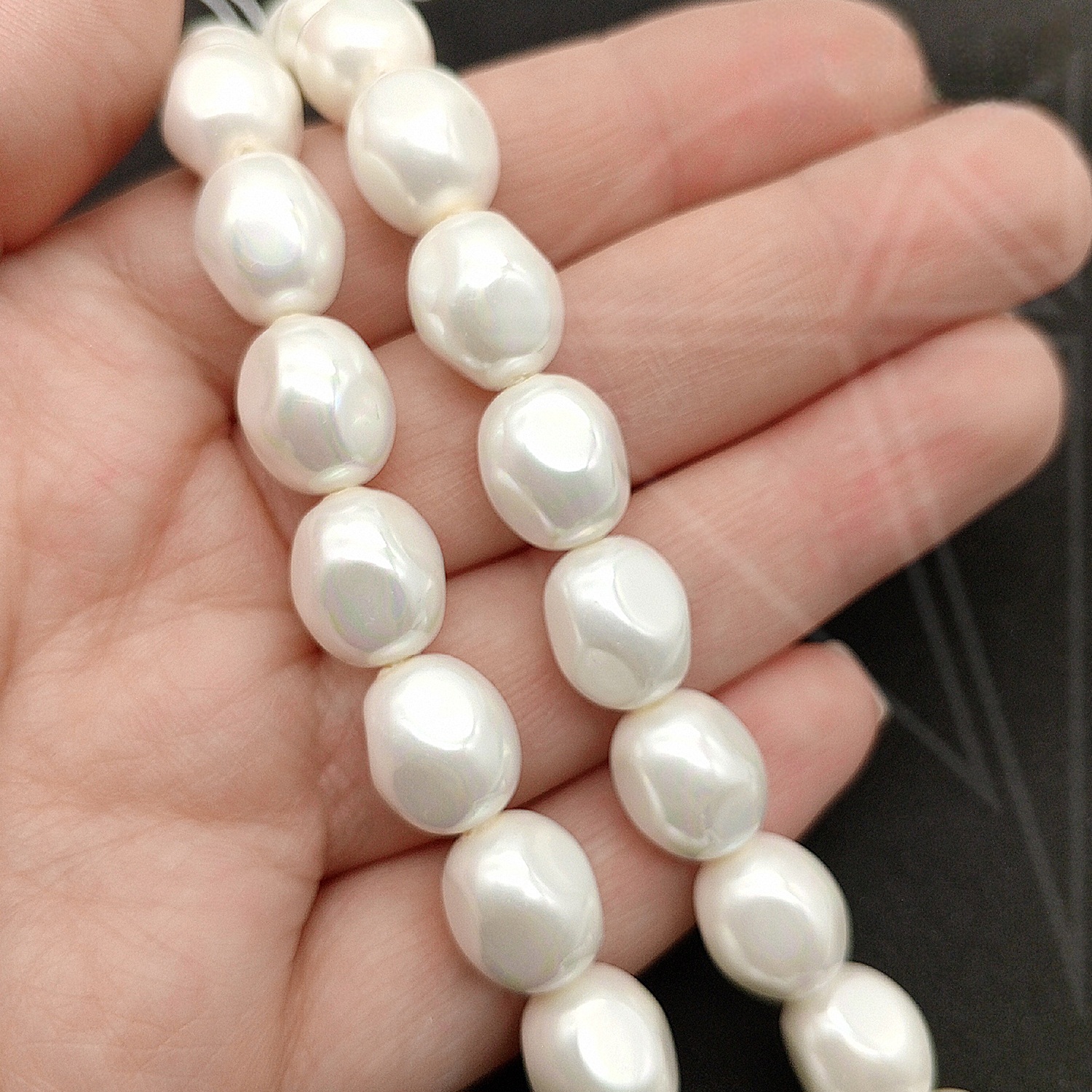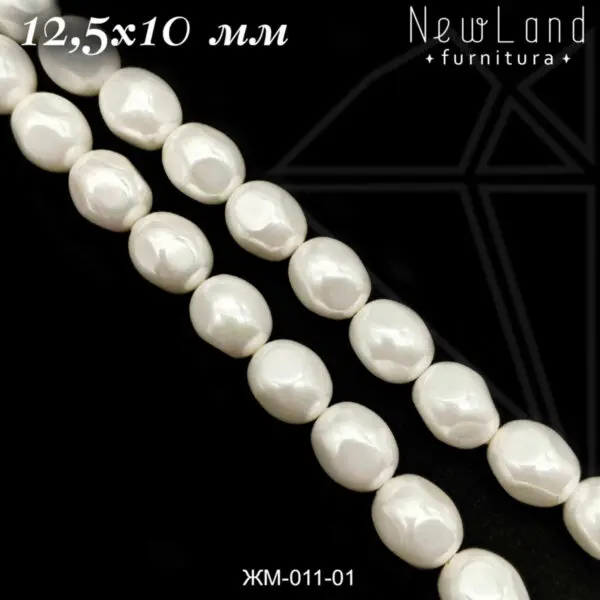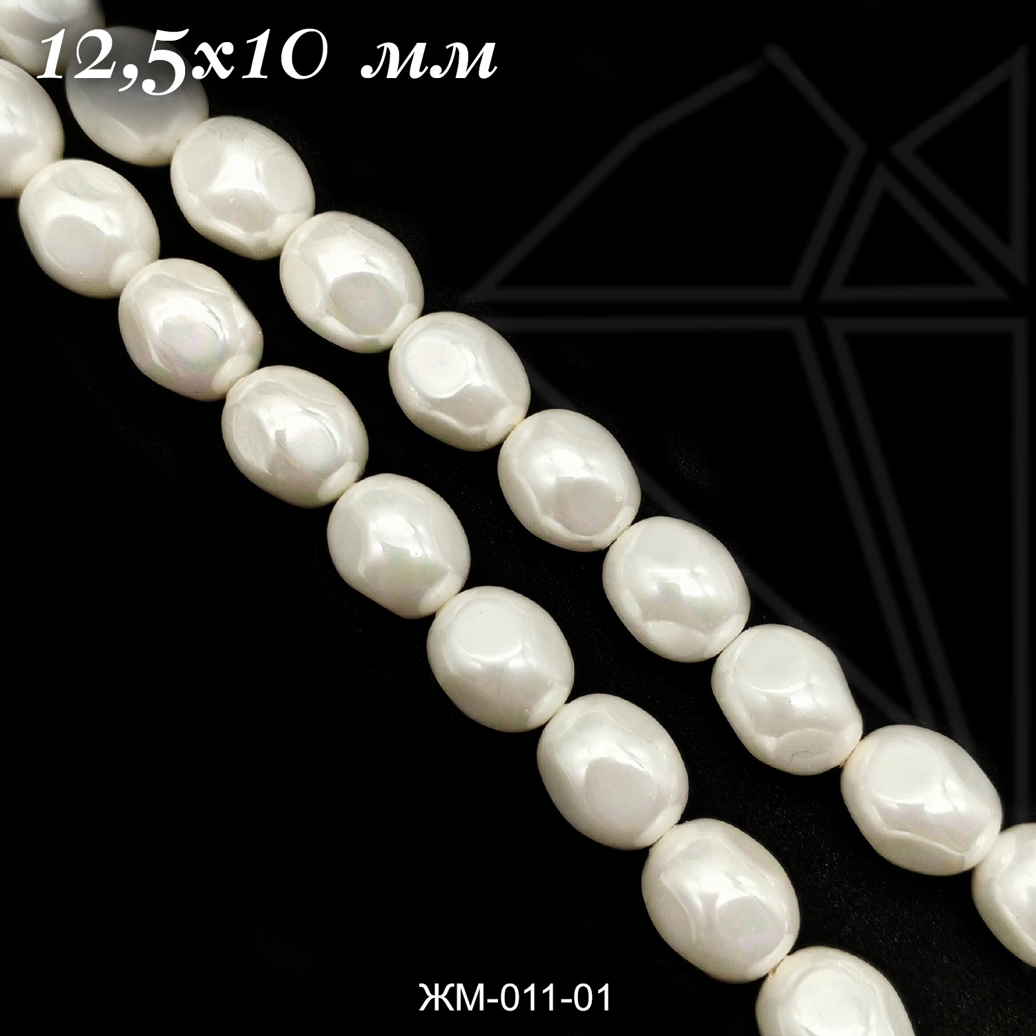 Жемчуг майорка овальной формы белого цвета 12,5х10 мм с красивыми перламутровыми переливами.
