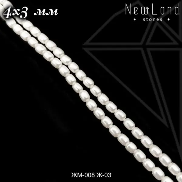 Жемчуг майорка в форме бочонка 4х3 мм белого цвета с красивым перламутровым блеском.