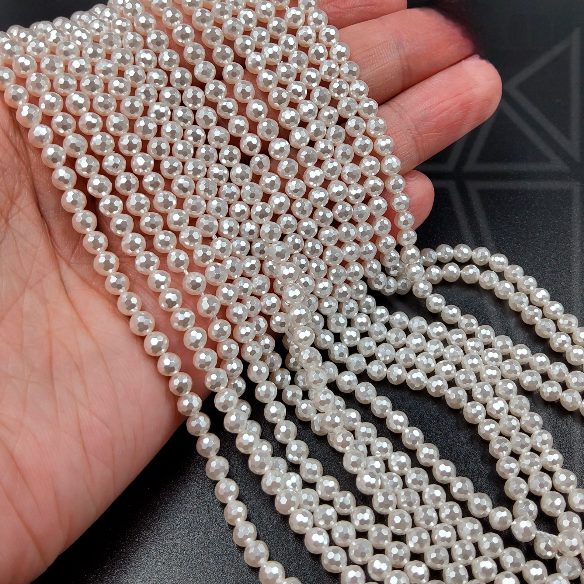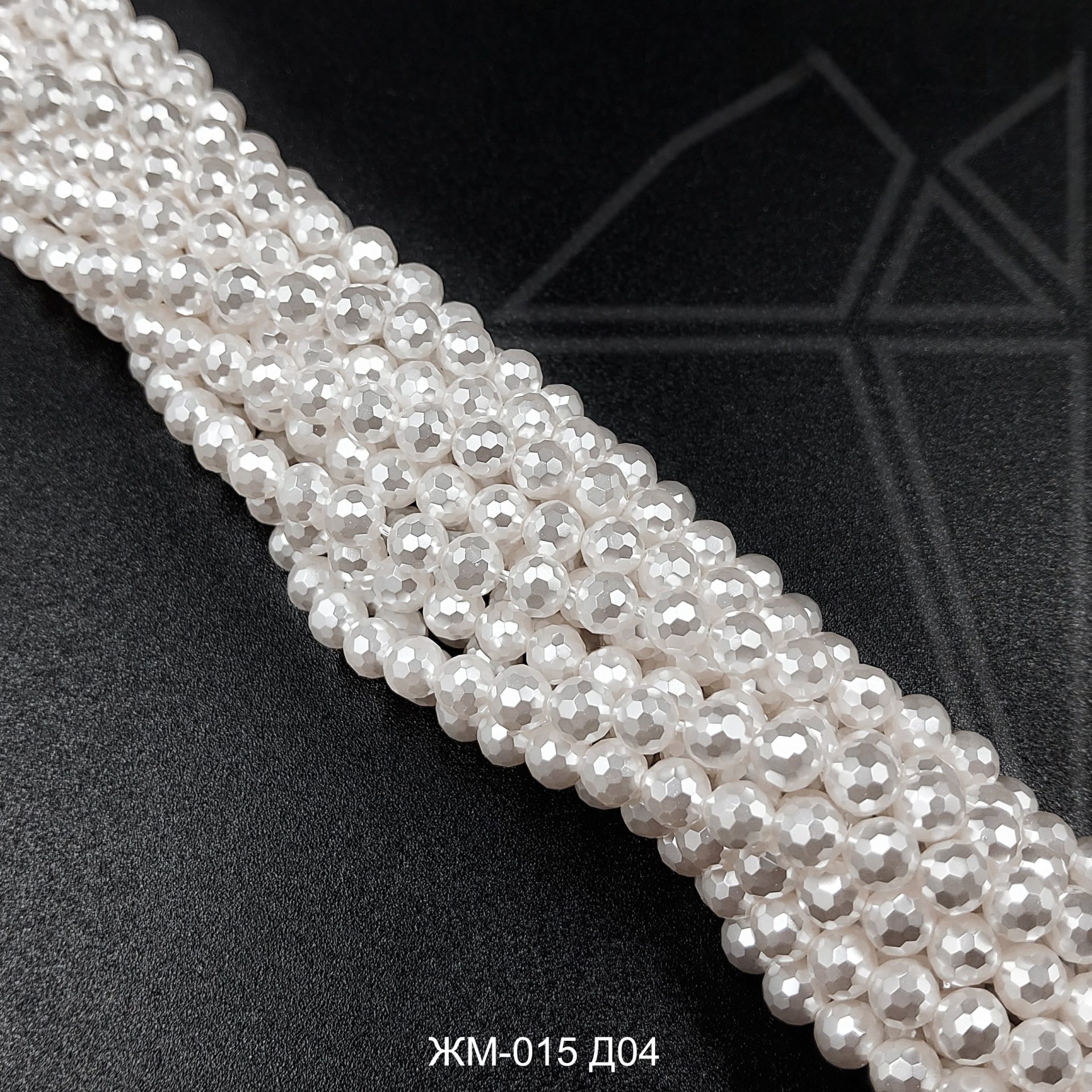 Жемчуг майорка белого цвета с огранкой с перламутровым покрытием.