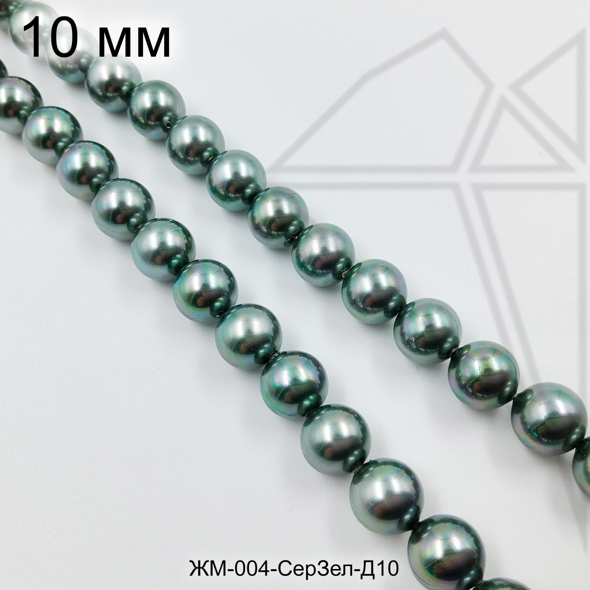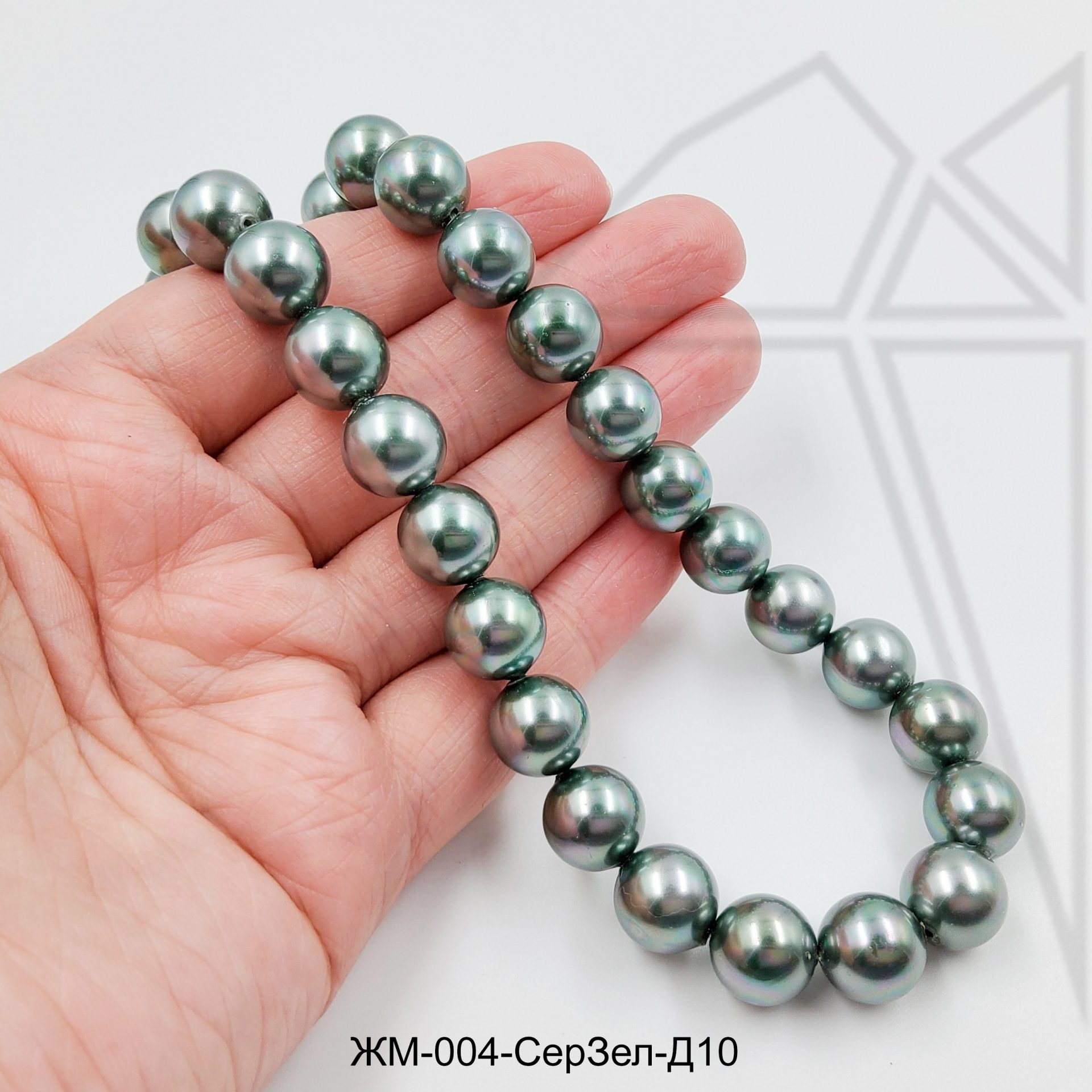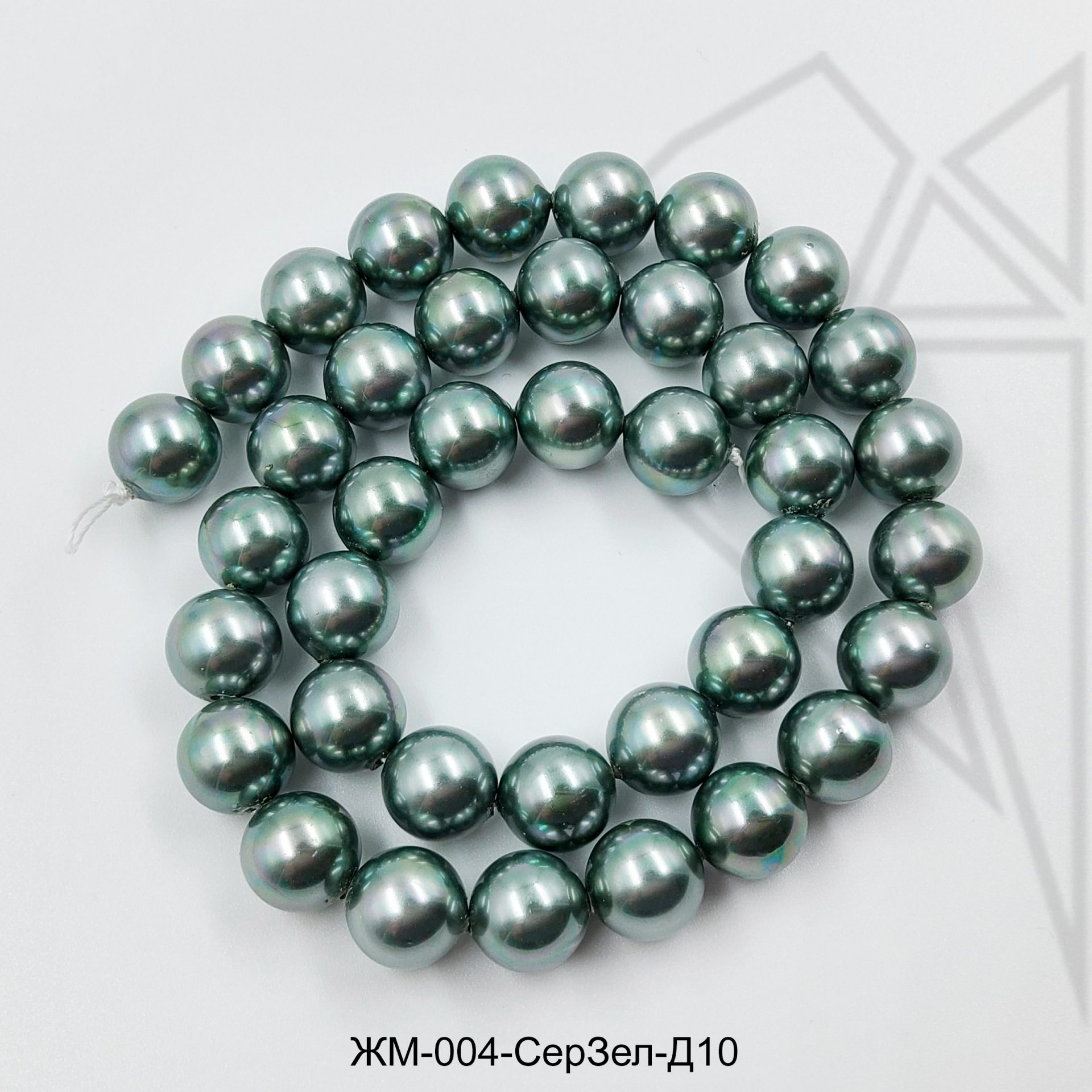 Жемчуг майорка круглой формы серо-зеленого цвета.
