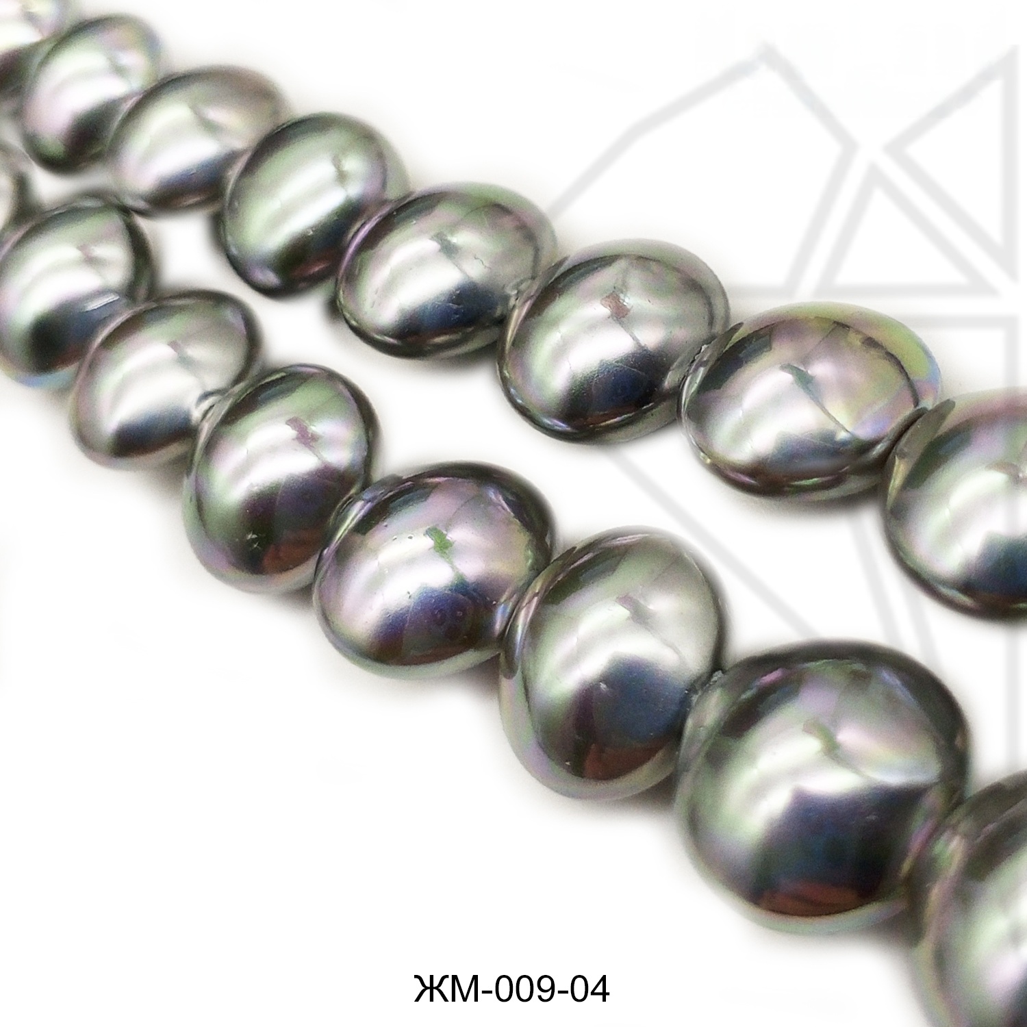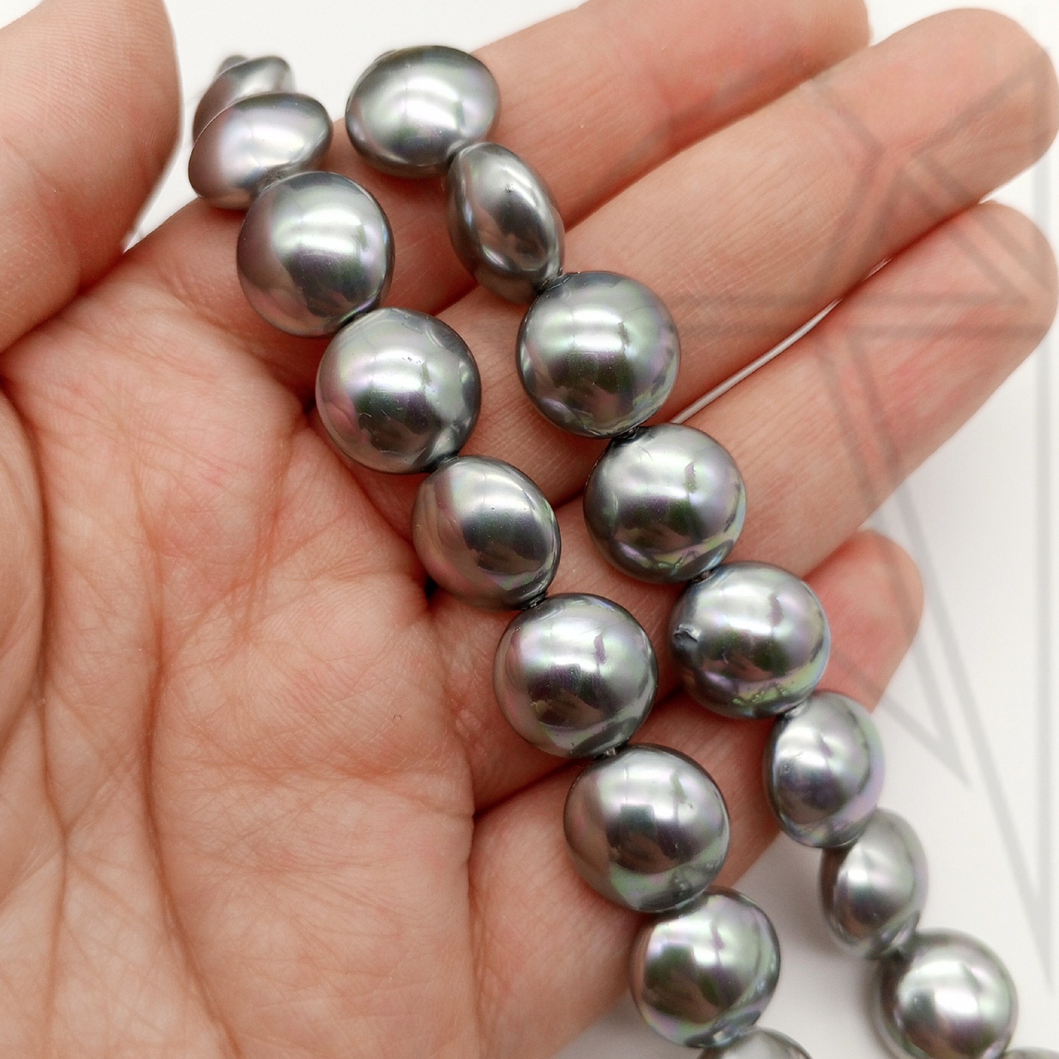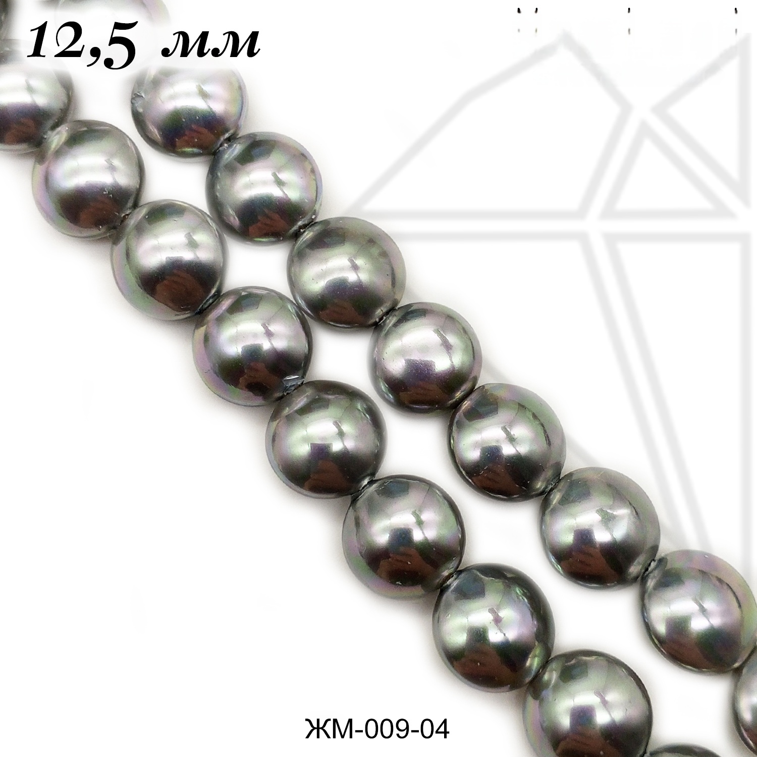 Жемчуг майорка в форме таблетки серебристого цвета с красивыми перламутровыми переливами.