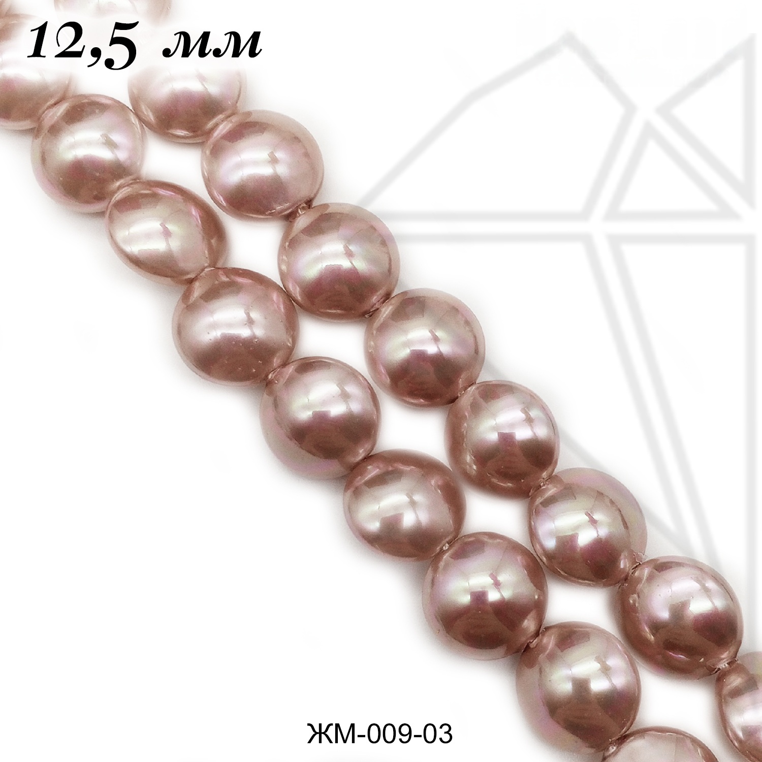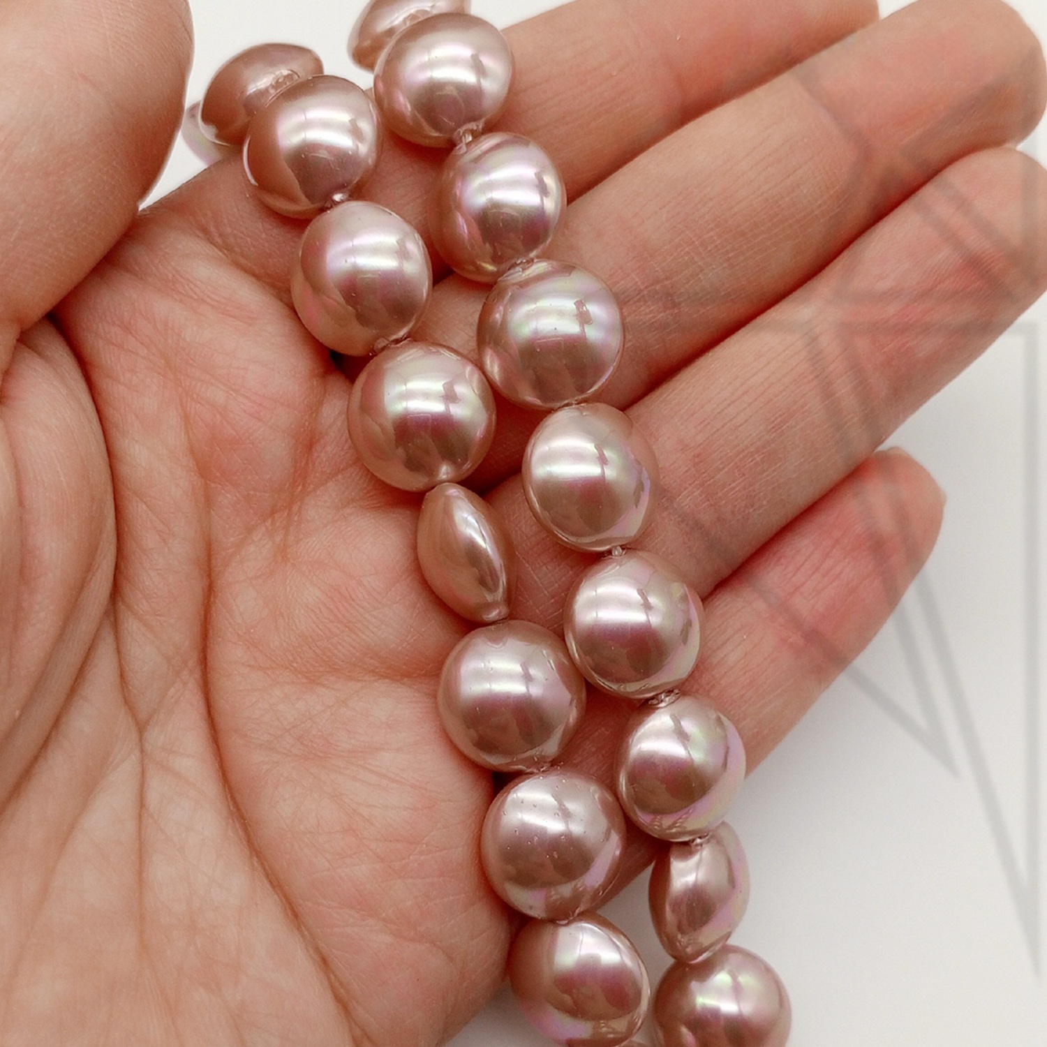 Жемчуг майорка в форме таблетки 12,5 мм пудрового цвета с красивыми перламутровыми переливами.