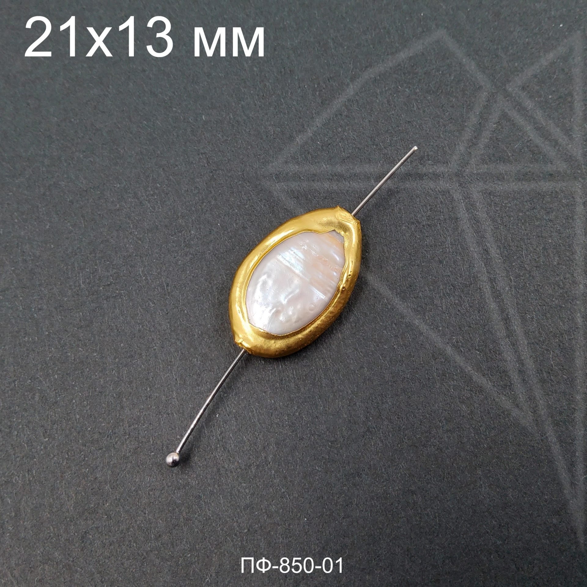 Жемчуг натуральный овальной формы белого цвета в металлизированной окантовке золотистого цвета.